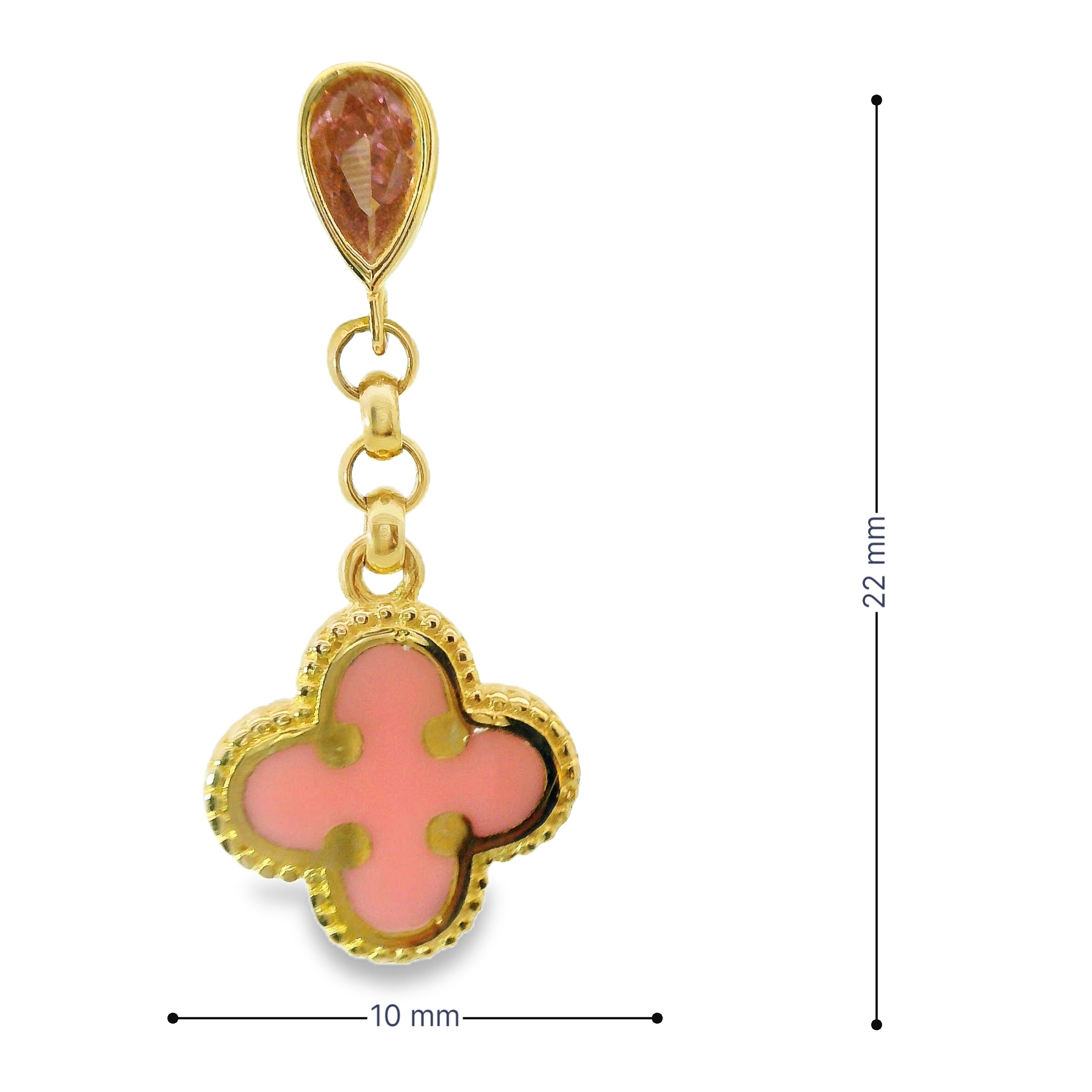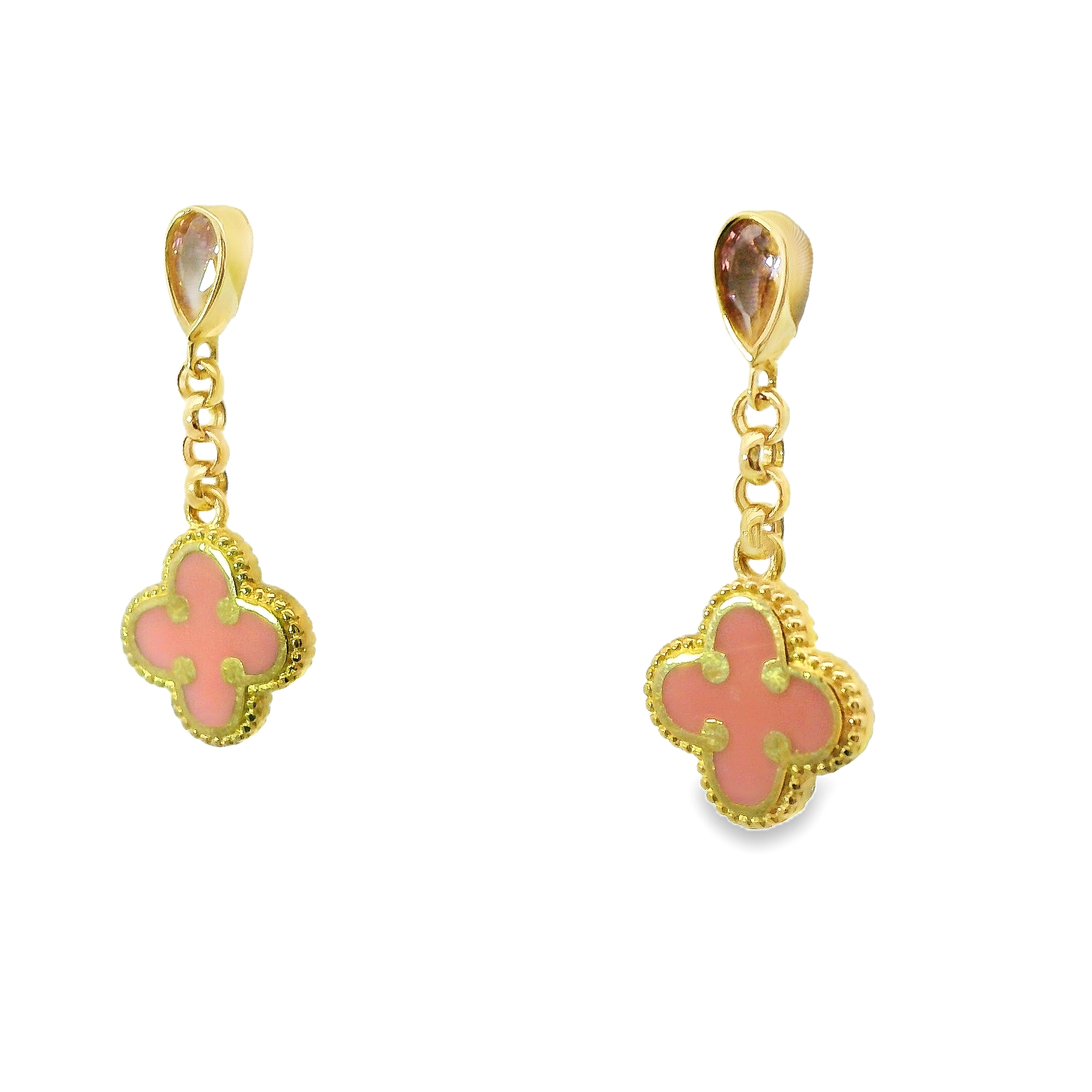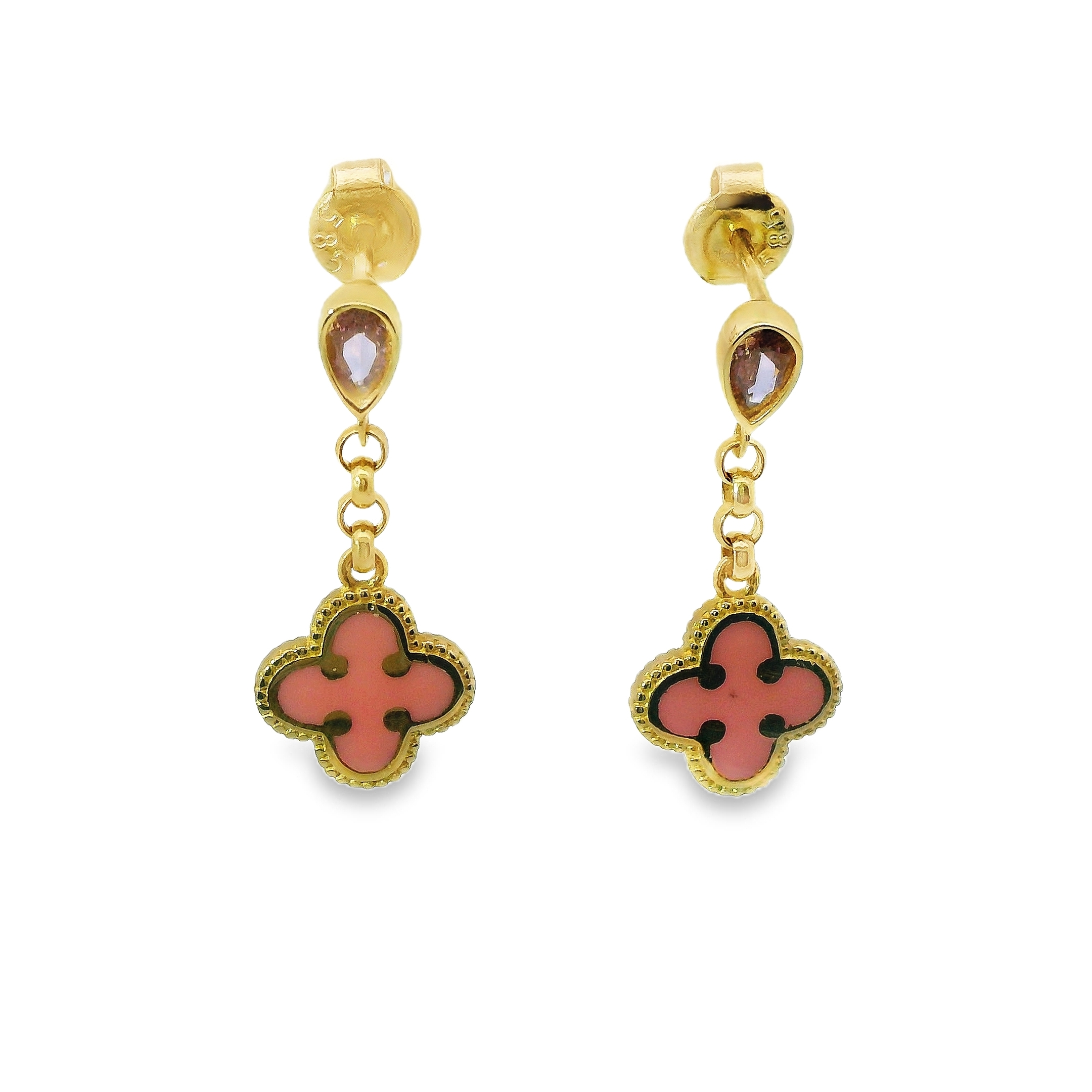 Deze oorhangers met roze klavertjes zijn een betoverende combinatie van elegantie en speelsheid. Het warme geelgoud benadrukt de zachte, romantische tint van de roze klavertjes, die symbool staan voor geluk en liefde. Deze oorhangers voegen een unieke en kleurrijke touch toe aan elke outfit, terwijl ze tegelijkertijd een verfijnde en vrouwelijke uitstraling behouden. Ideaal voor zowel alledaagse als bijzondere momenten, brengen ze een vrolijke, stijlvolle flair met zich mee. Een charmant sieraad dat zachtheid en luxe perfect weet te combineren!