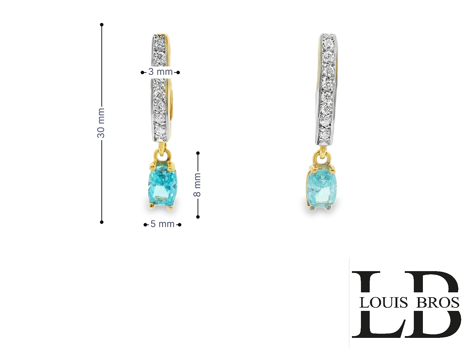 Aan de onderkant hangt een prachtige rechthoekige blauwe zirkonia in een subtiele geelgouden zetting. Deze hanger voegt een vleugje kleur en verfijning toe, waardoor de oorbellen een tijdloze en chique uitstraling krijgen.