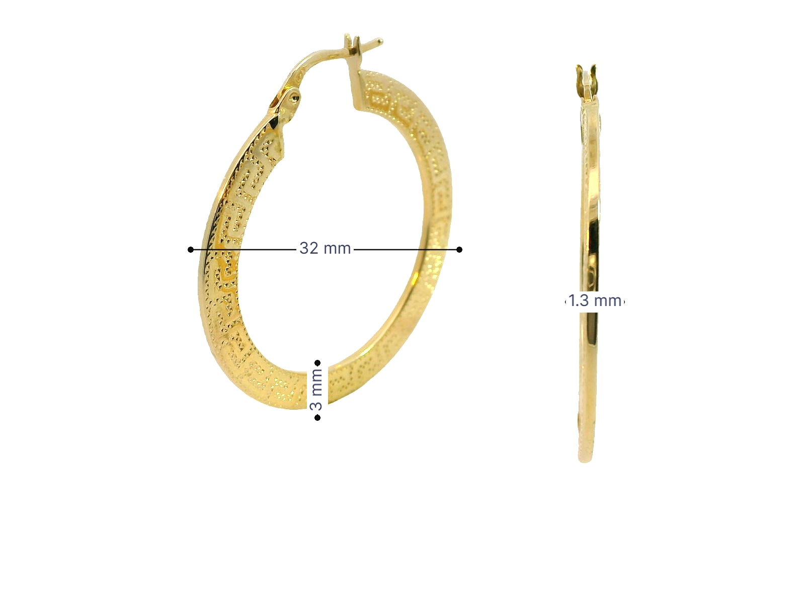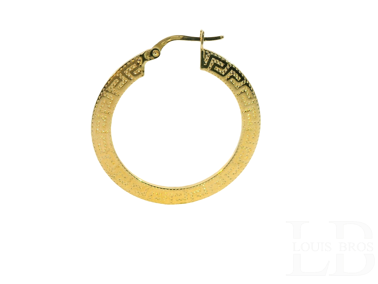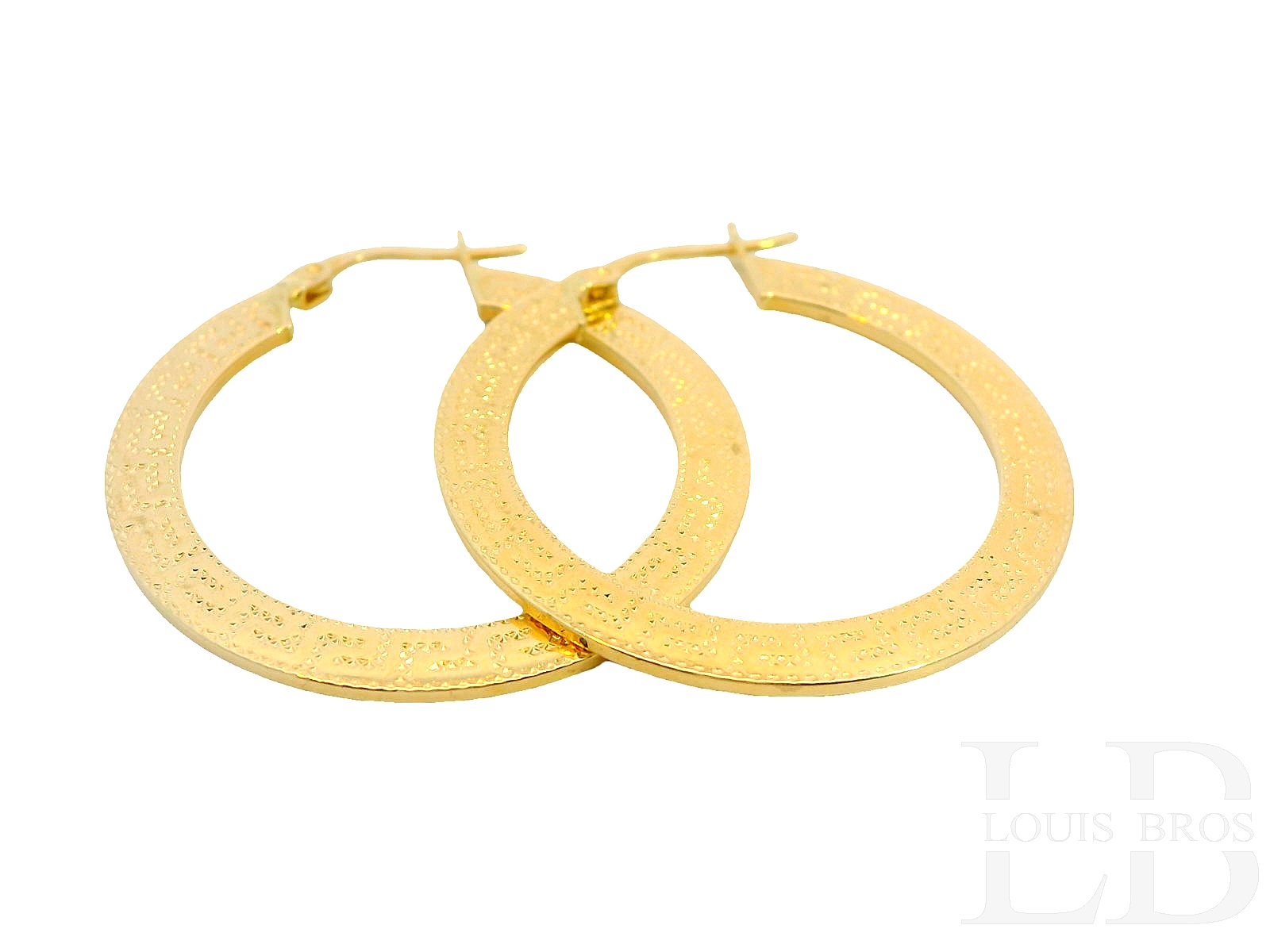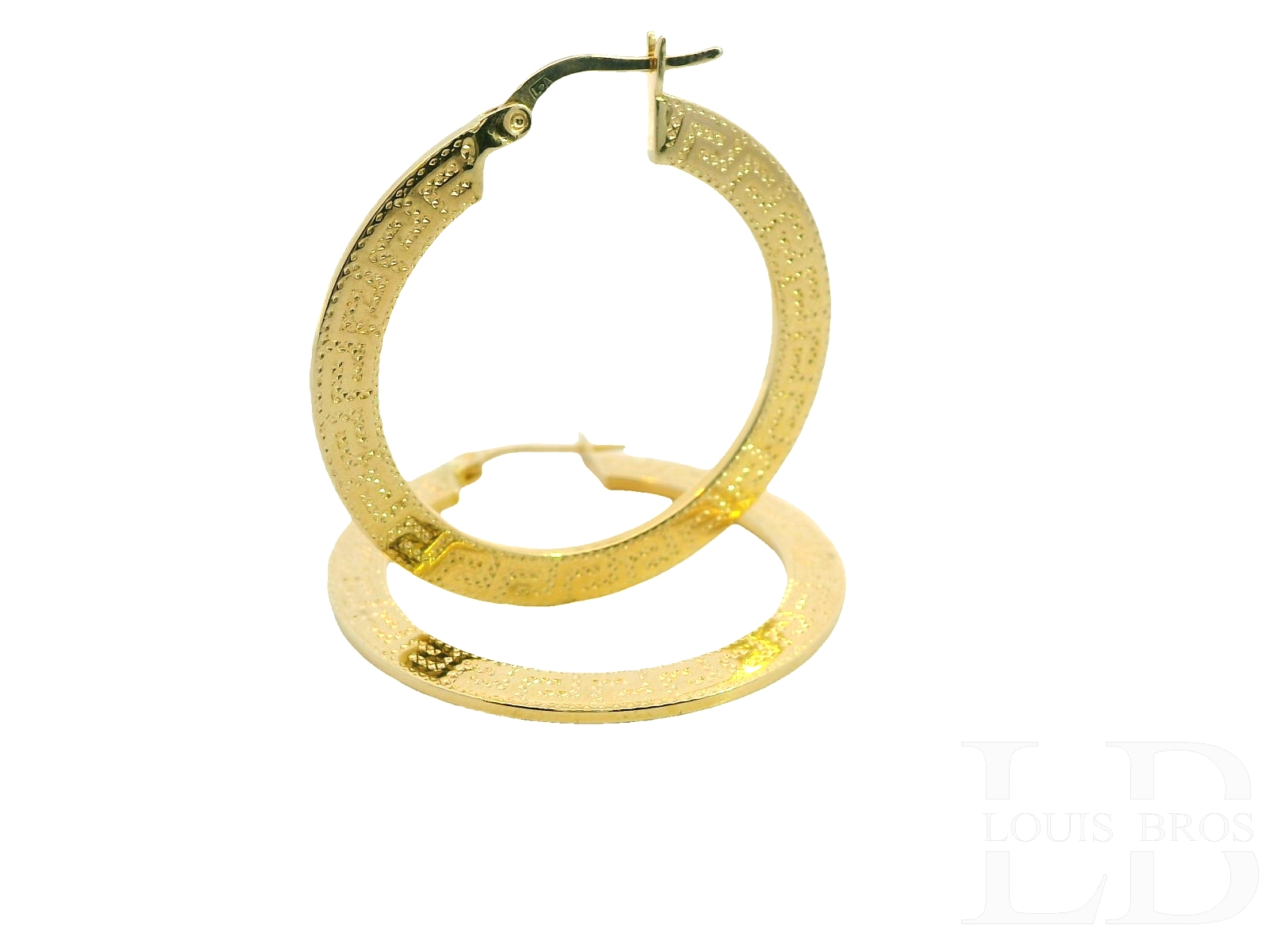 Dit is een elegante set gouden oorbellen in de klassieke hoepelstijl, ontworpen met een subtiele textuur en een verfijnd patroon langs de buitenrand. De oorbellen lijken vervaardigd uit hoogwaardig goud,14-karaats (3.5 gr) en tonen een delicaat gravurepatroon dat een luxe uitstraling geeft.