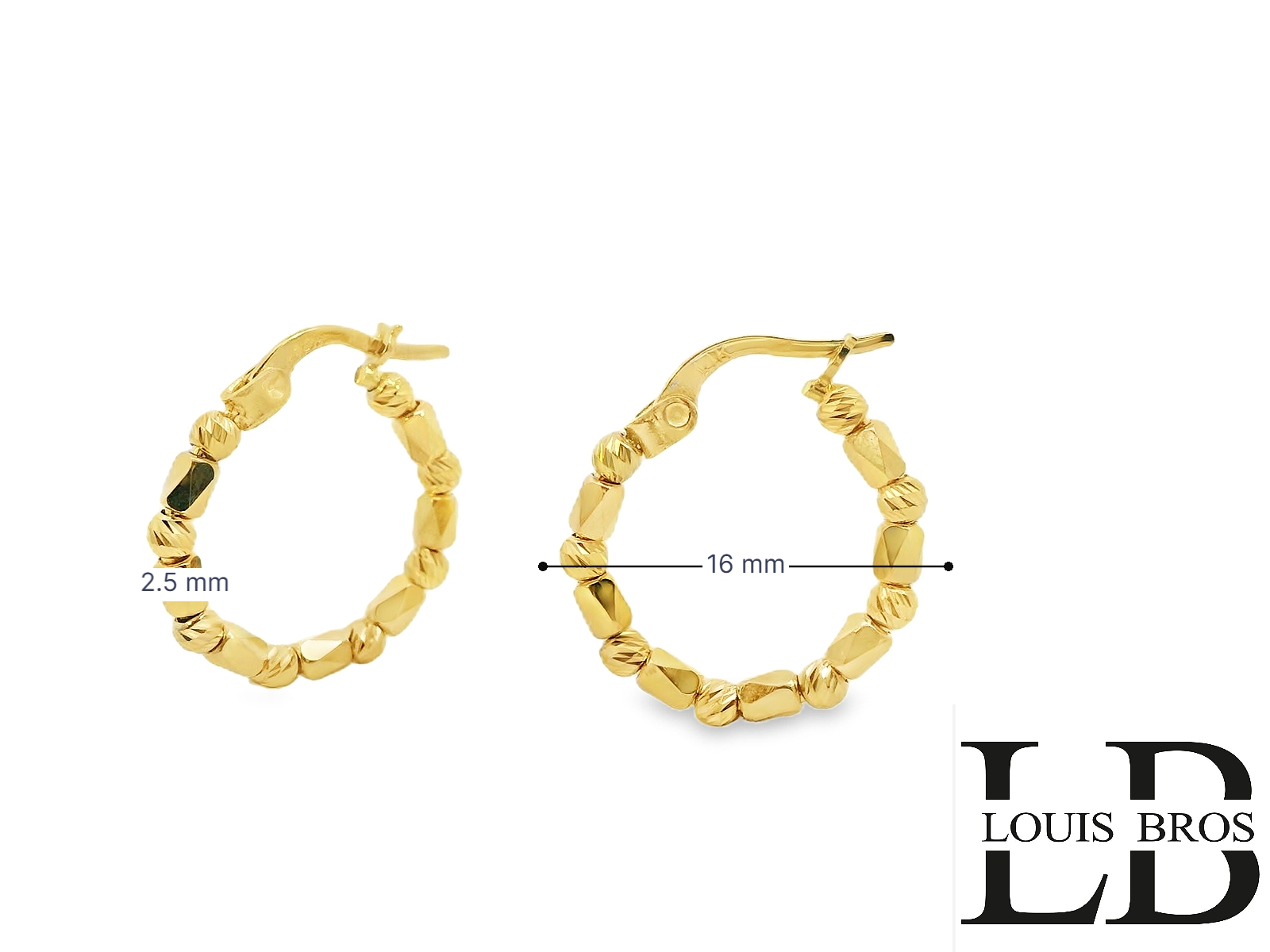 Deze prachtige geelgouden oorringen van 14 karaat (2.46 gr) stralen klassieke elegantie uit met een moderne twist. De oorringen bestaan uit sierlijke, gedraaide en fijn bewerkte bolvormige schakels, wat zorgt voor een speels en stijlvol effect. De structuur van de oorringen geeft een subtiele schittering bij elke beweging. Dankzij het veilige klapsluiting-mechanisme zijn ze comfortabel en makkelijk te dragen, ideaal voor dagelijks gebruik of een speciale gelegenheid.
