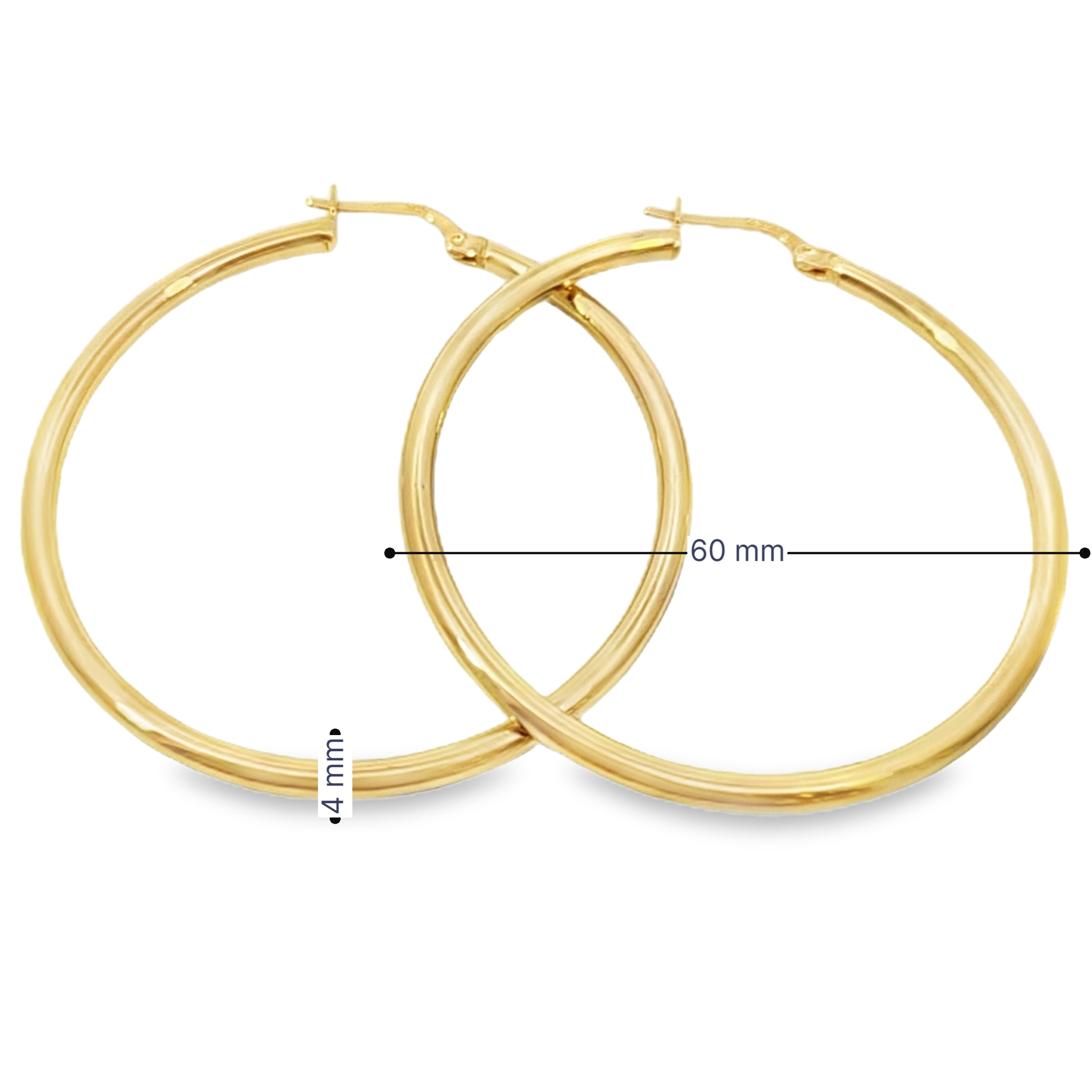Deze prachtige geelgouden oorringen (13.44 gr) zijn een tijdloze toevoeging aan elke sieradencollectie. Gemaakt van 14 karaat goud, bieden ze een luxueuze uitstraling met een warme, glanzende afwerking. Met een diameter van 60 mm en een dikte van 4 mm, hebben deze creolen een elegante, maar opvallende look die zowel bij casual als chique outfits past.