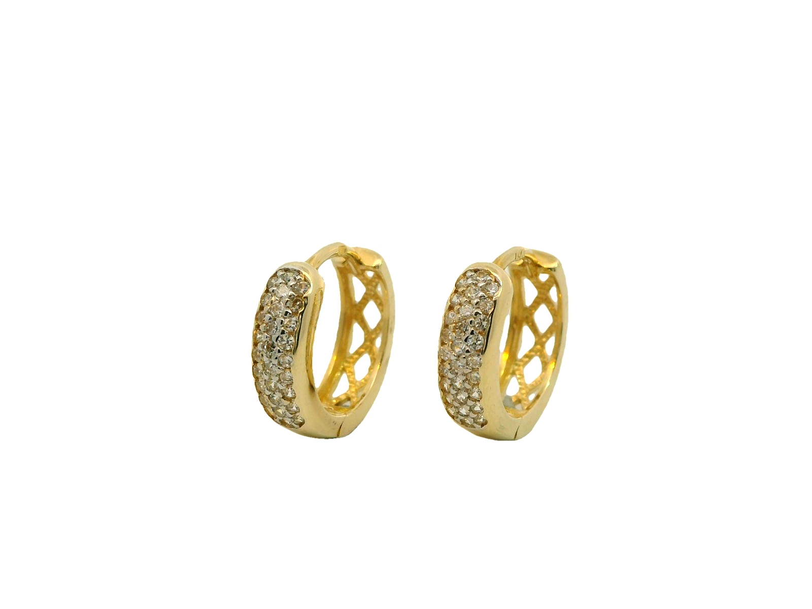 Dit is een elegante gouden oorbellen 14 karaat (3.53 gr) met een scharnierende sluiting. De oorbellen zijn versierd met meerdere kleine, fonkelende steentjes zirkonia, die in rijen zijn gezet voor een luxueuze uitstraling. De binnenkant van de oorbellen heeft een opengewerkt patroon, wat bijdraagt aan zowel het lichte gewicht als de verfijnde esthetiek. Dit type oorbel is stijlvol en tijdloos, perfect voor zowel alledaags gebruik als speciale gelegenheden.