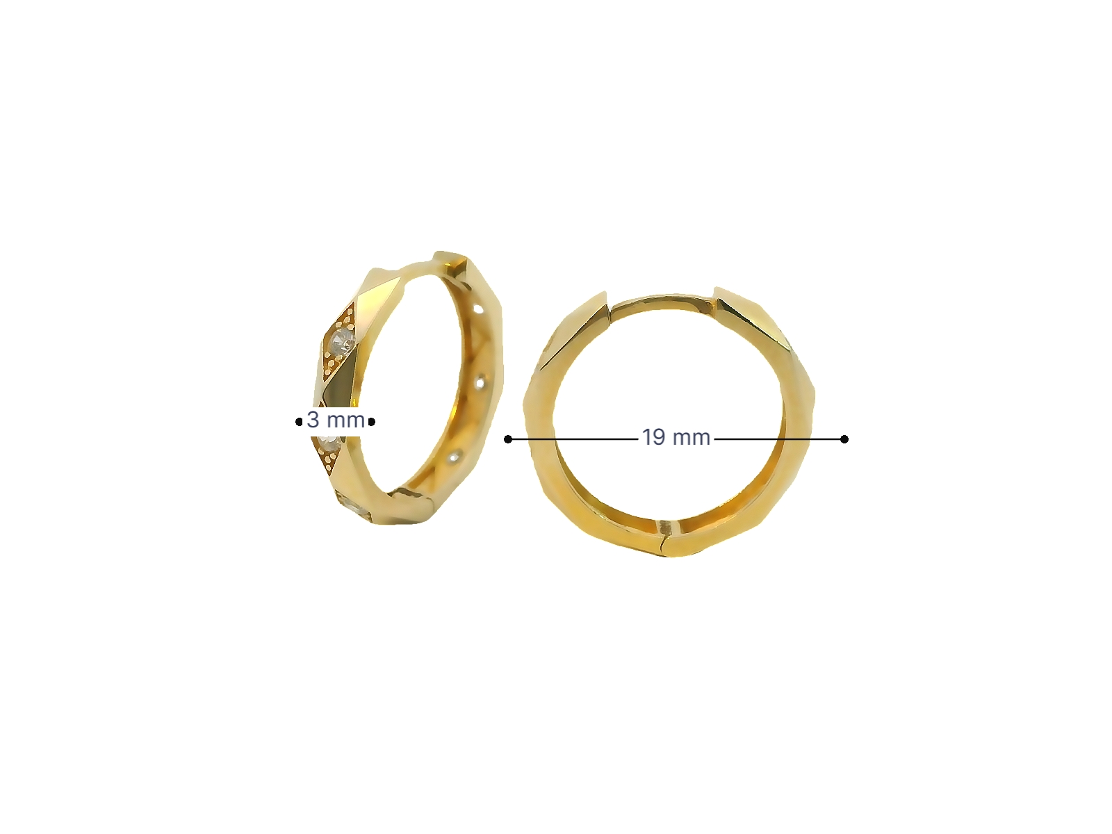 Dit is een elegant paar 14-karaat geelgouden hoepeloorbellen (3.72 gr) met een verfijnd en geometrisch ontwerp. De oorbellen hebben een facettenstructuur, waarbij ruitvormige uitsparingen zijn versierd met fonkelende zirkonia. Dit zorgt voor een prachtige schittering en een luxe uitstraling.