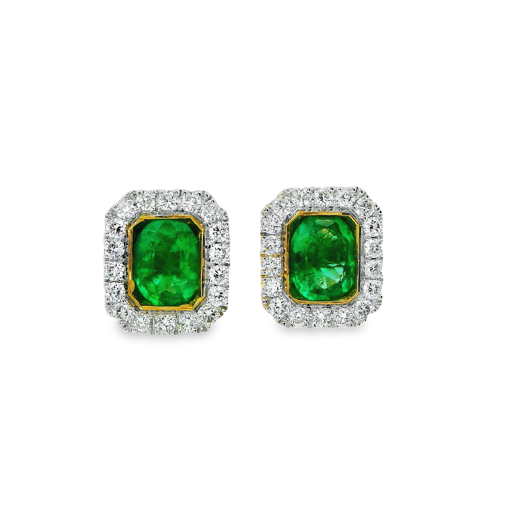 In een spel van sublieme elegantie en tijdloze schoonheid, schitteren deze gele gouden oorstekers als kostbare juwelen uit een droom. Met een weelderige combinatie van levendige groene smaragden en stralende diamanten die rondom zijn gezet, vangen ze het licht op een betoverende manier op.
