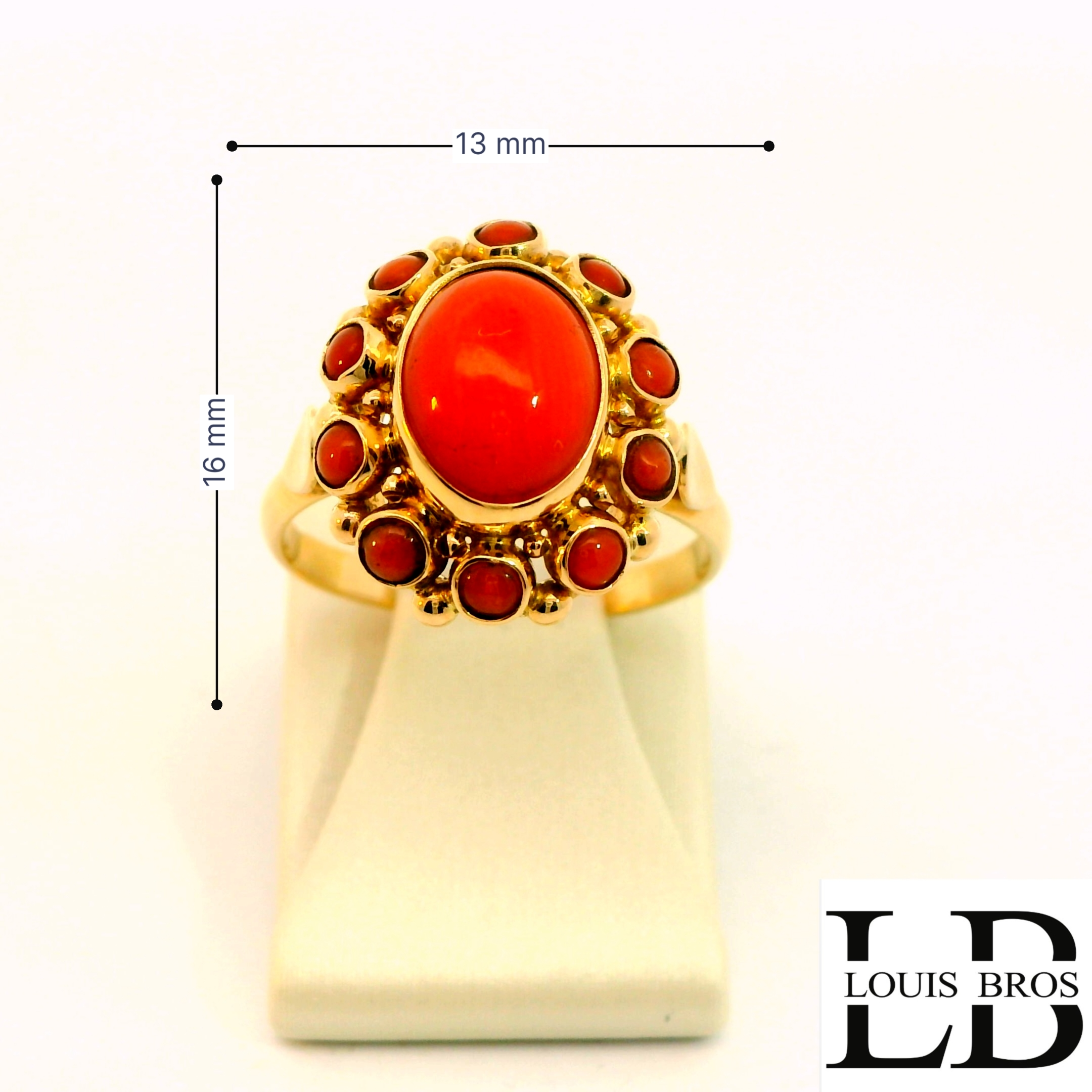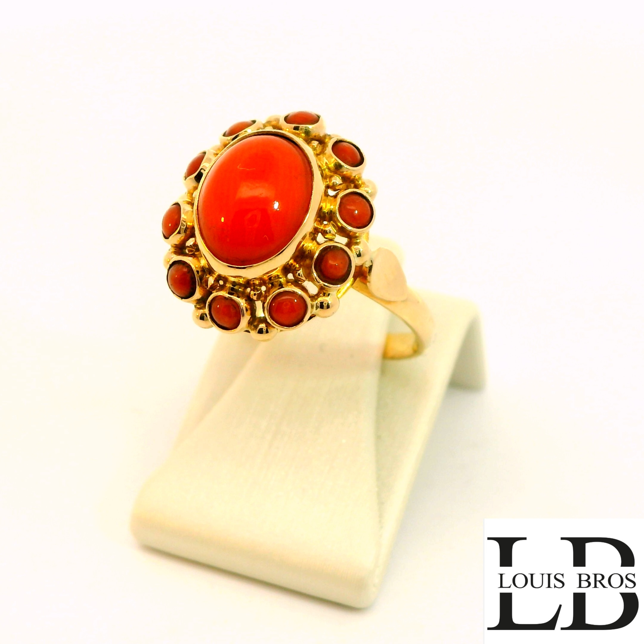 Stijlvolle tweedehands ring van 14 karaat geelgoud, gezet met een warme rode bloedkoraal. Een klassiek en elegant sieraad met een tijdloze uitstraling.