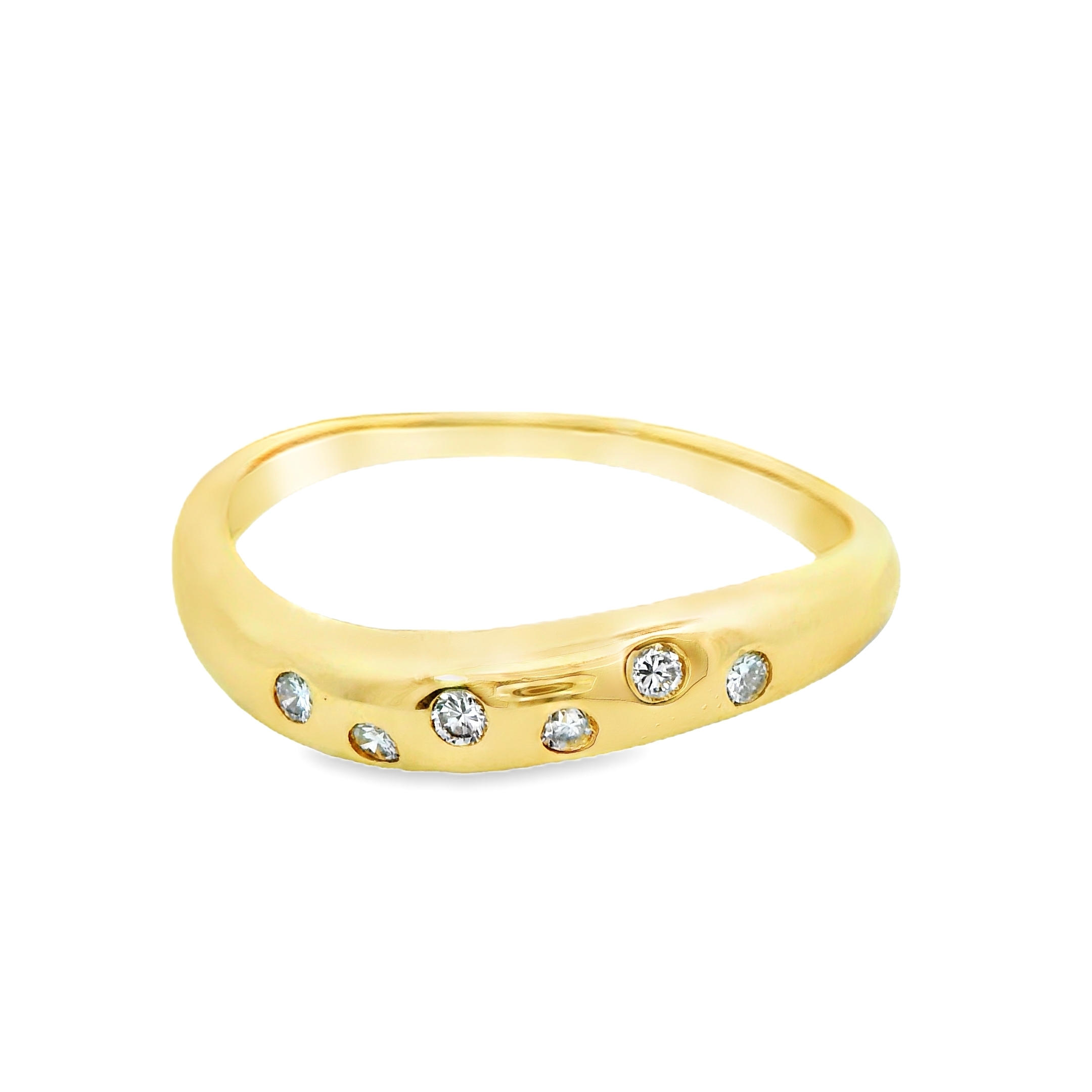 Deze ring van Louis Bros is vervaardigd uit 14 karaat geelgoud (2.89 gr.) en is gezet met 6 briljant geslepen diamanten met een totaalgewicht van 0.06ct. De ring heeft een breedte van 3.75 mm, en een dikte van 2 mm. Deze ring bestaat uit onze lijn van exclusieve modellen sieraden met prachtige designs van hoge kwaliteit.
