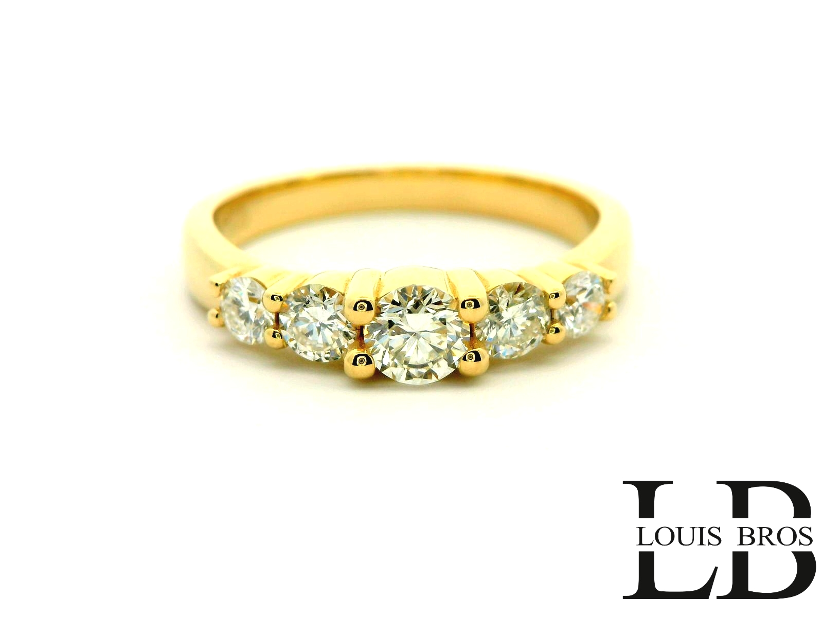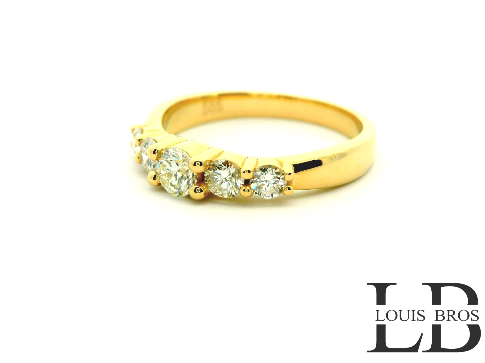 Deze ring van Louis Bros is vervaardigd uit 14 karaat geelgoud (3.23 gr.) en is gezet met 5 briljant geslepen diamanten met een totaalgewicht van 0.65ct. De ring heeft een diameter van 3 mm, minimale breedte van 2 mm. en een hoogte van 2 mm. Deze ring bestaat uit onze lijn van exclusieve modellen sieraden met prachtige designs van hoge kwaliteit.