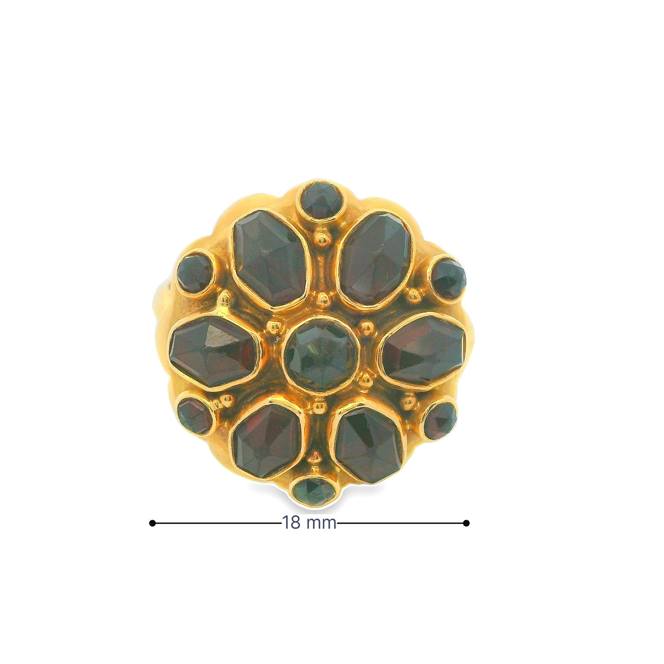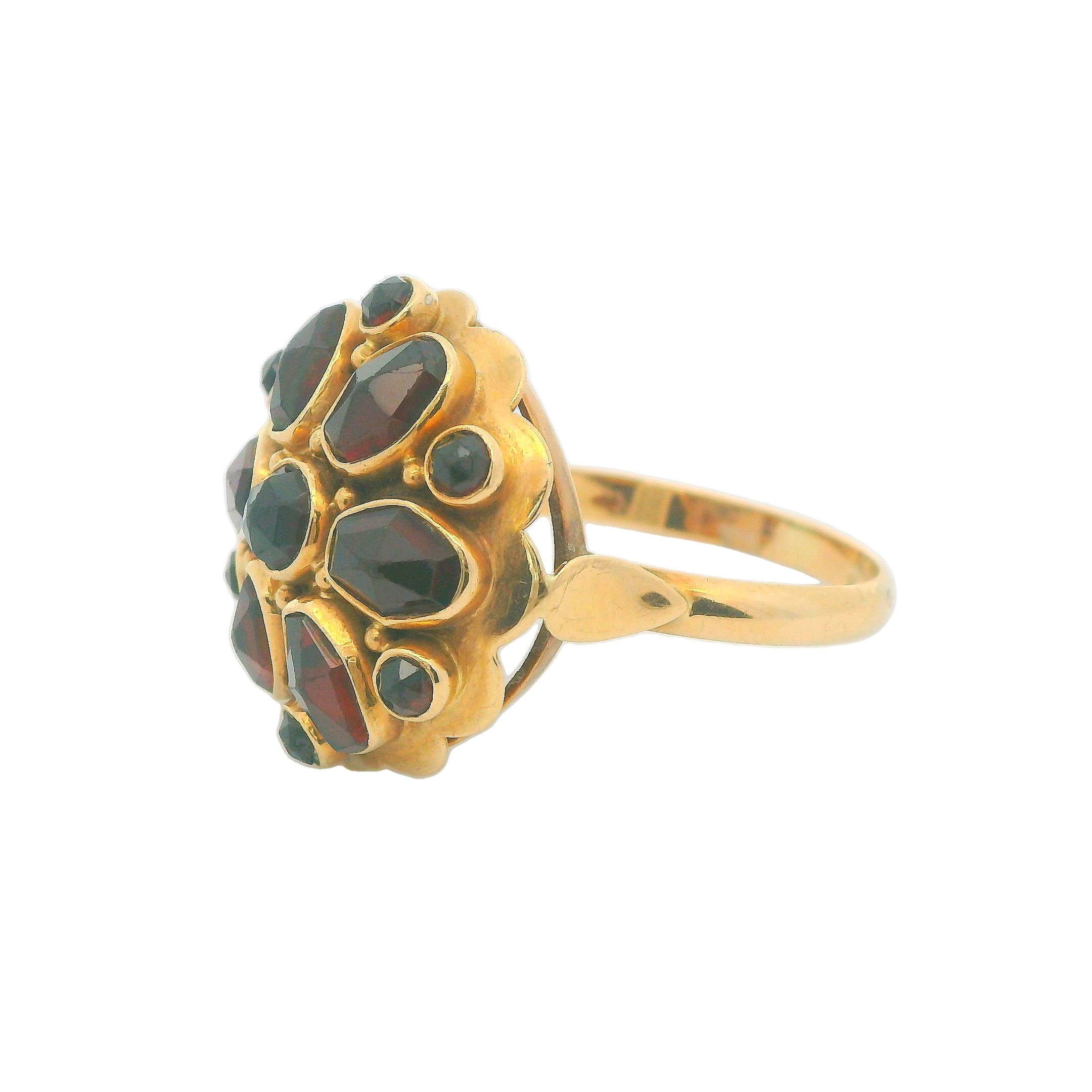 Deze ring is vervaardigd uit 14 karaat geelgoud (5.23 gr.) en versierd met een schitterende granaat. De ring is tweedehands en heeft een aantrekkelijke vintage uitstraling, wat hem een uniek en tijdloos karakter geeft.  De warme gloed van het geelgoud gecombineerd met de diepe, rijke tint van de granaat maakt dit sieraad een echte blikvanger. Ondanks zijn tweedehands status verkeert de ring in uitstekende staat, klaar om een nieuw leven te beginnen en elke outfit te verfraaien.