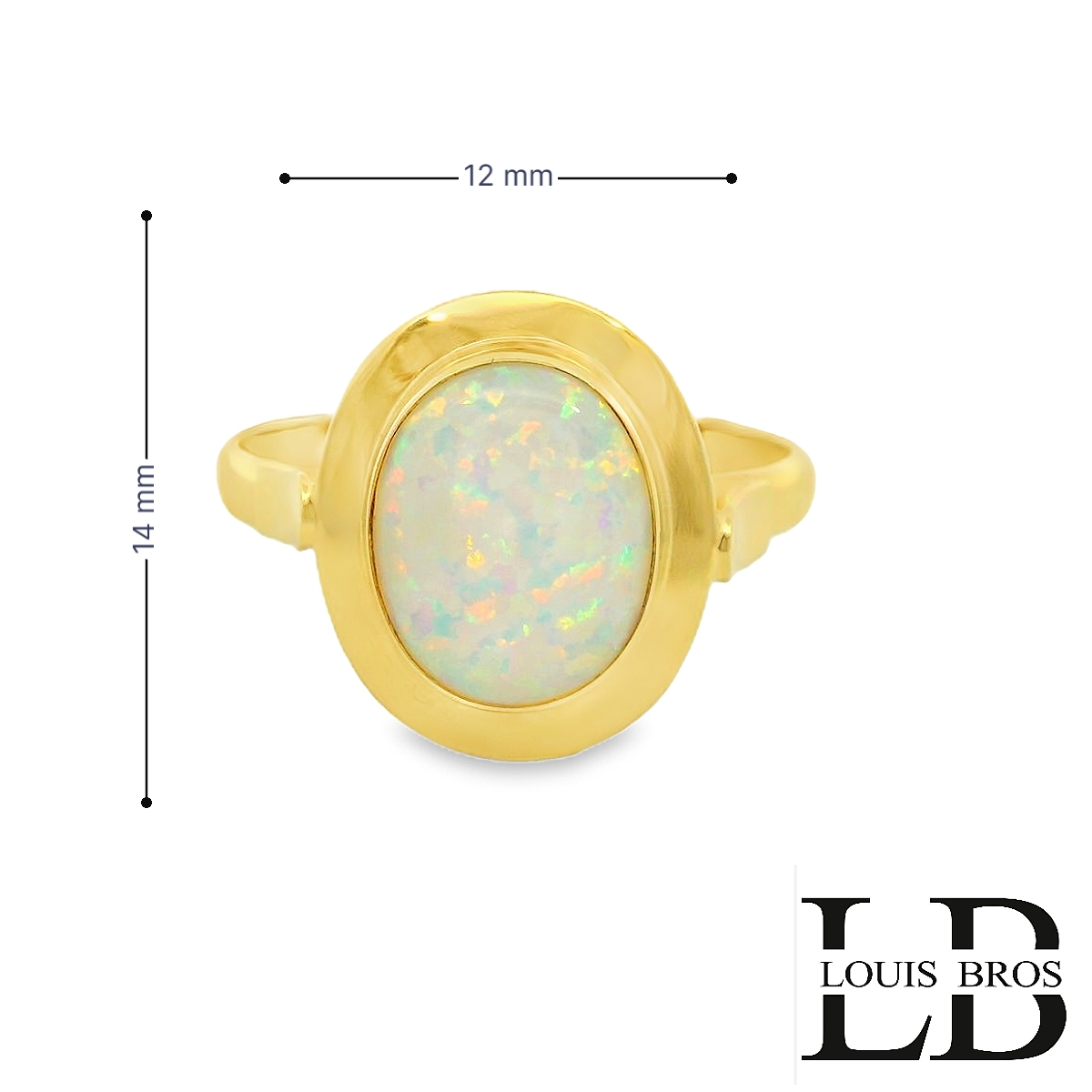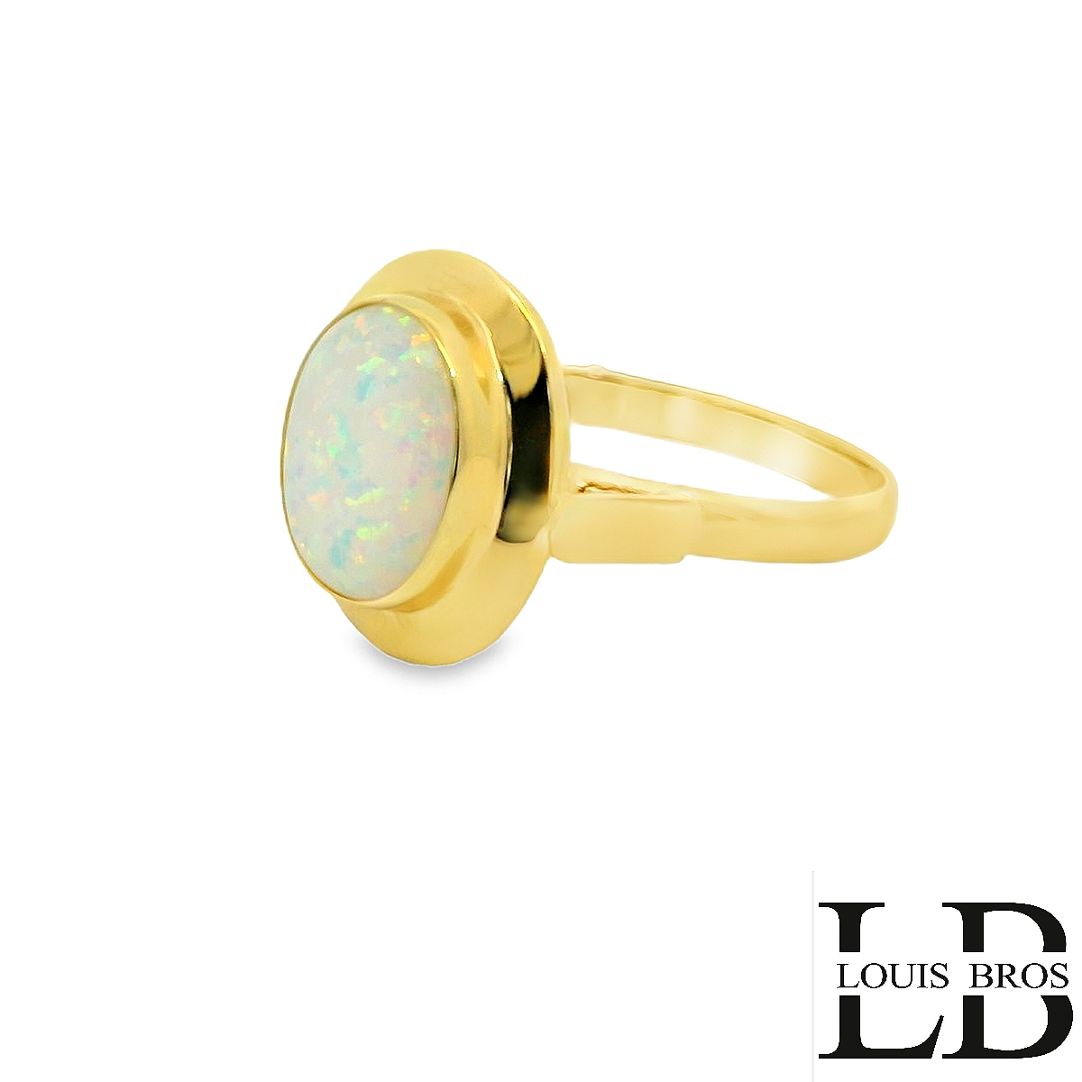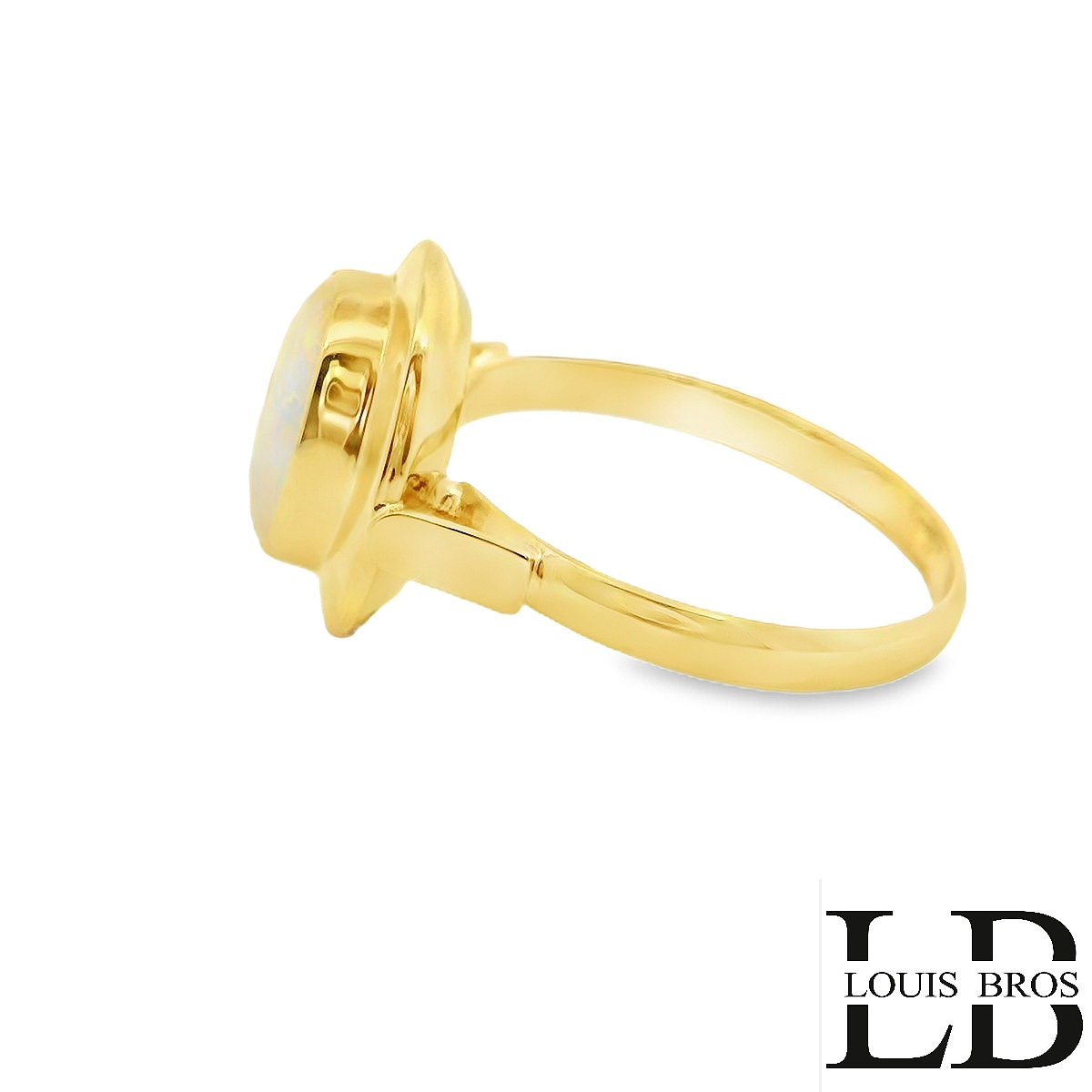 Deze verfijnde 14 karaat geelgouden ring (2.75 gr) is gezet met een prachtige ovale synthetische witte opaal. De opaal toont een subtiel kleurenspel van zachte pastelkleuren zoals roze, groen en oranje, wat de ring een elegante en dromerige uitstraling geeft. De steen is stevig en sierlijk gevat in een gladomzetting, afgewerkt met een fijne gedraaide rand die het geheel een klassieke, tijdloze look verleent.