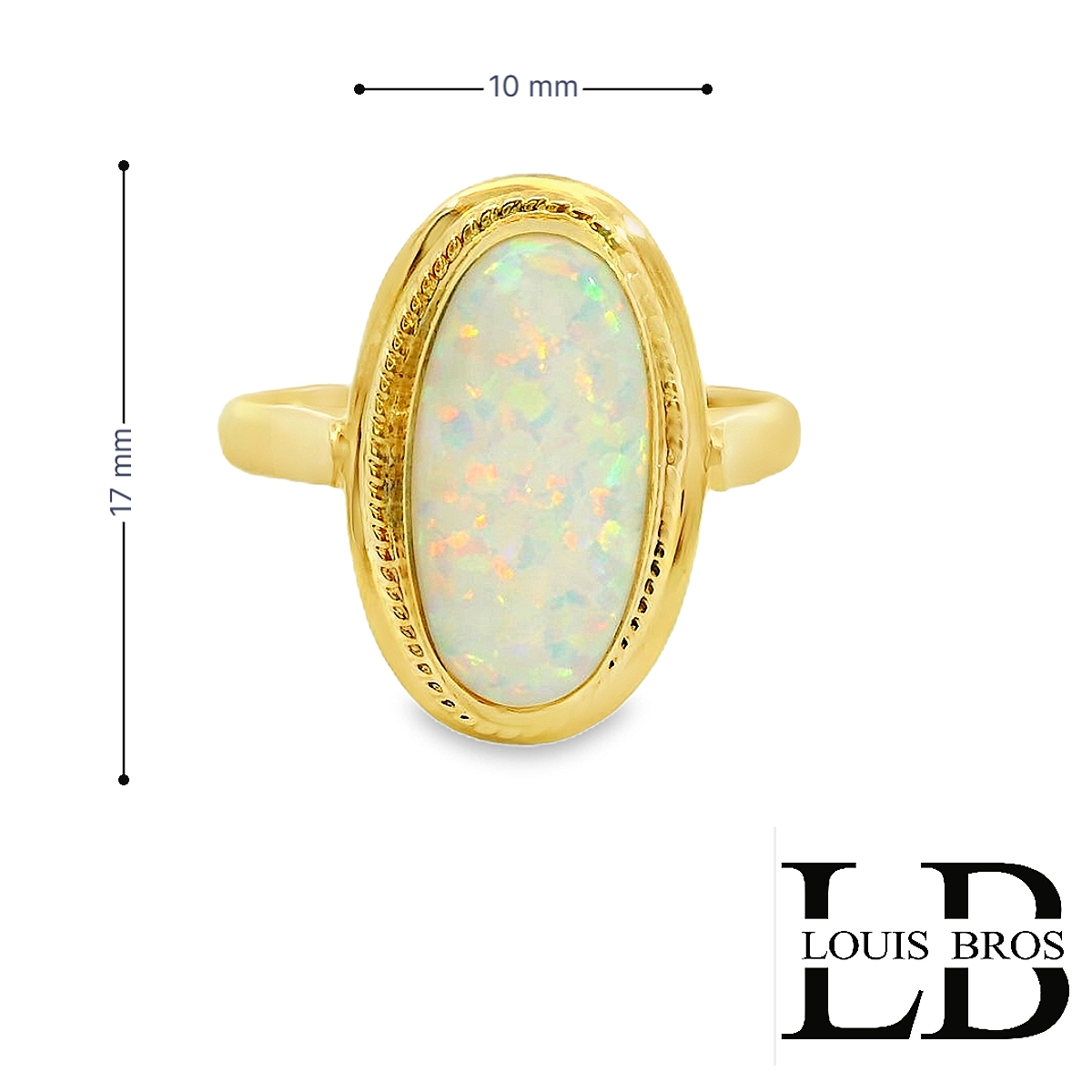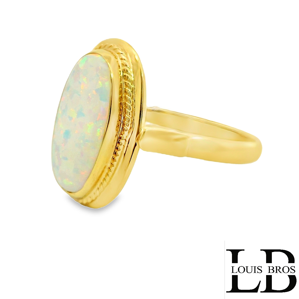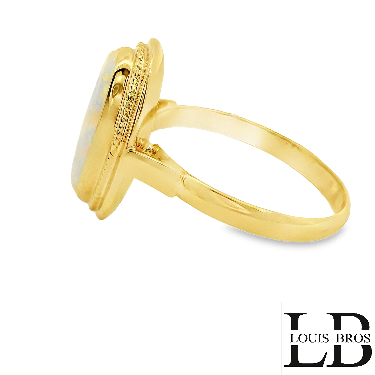 Deze verfijnde 14 karaat geelgouden ring (3.14 gr) is gezet met een prachtige ovale synthetische witte opaal. De opaal toont een subtiel kleurenspel van zachte pastelkleuren zoals roze, groen en oranje, wat de ring een elegante en dromerige uitstraling geeft. De steen is stevig en sierlijk gevat in een gladomzetting, afgewerkt met een fijne gedraaide rand die het geheel een klassieke, tijdloze look verleent.