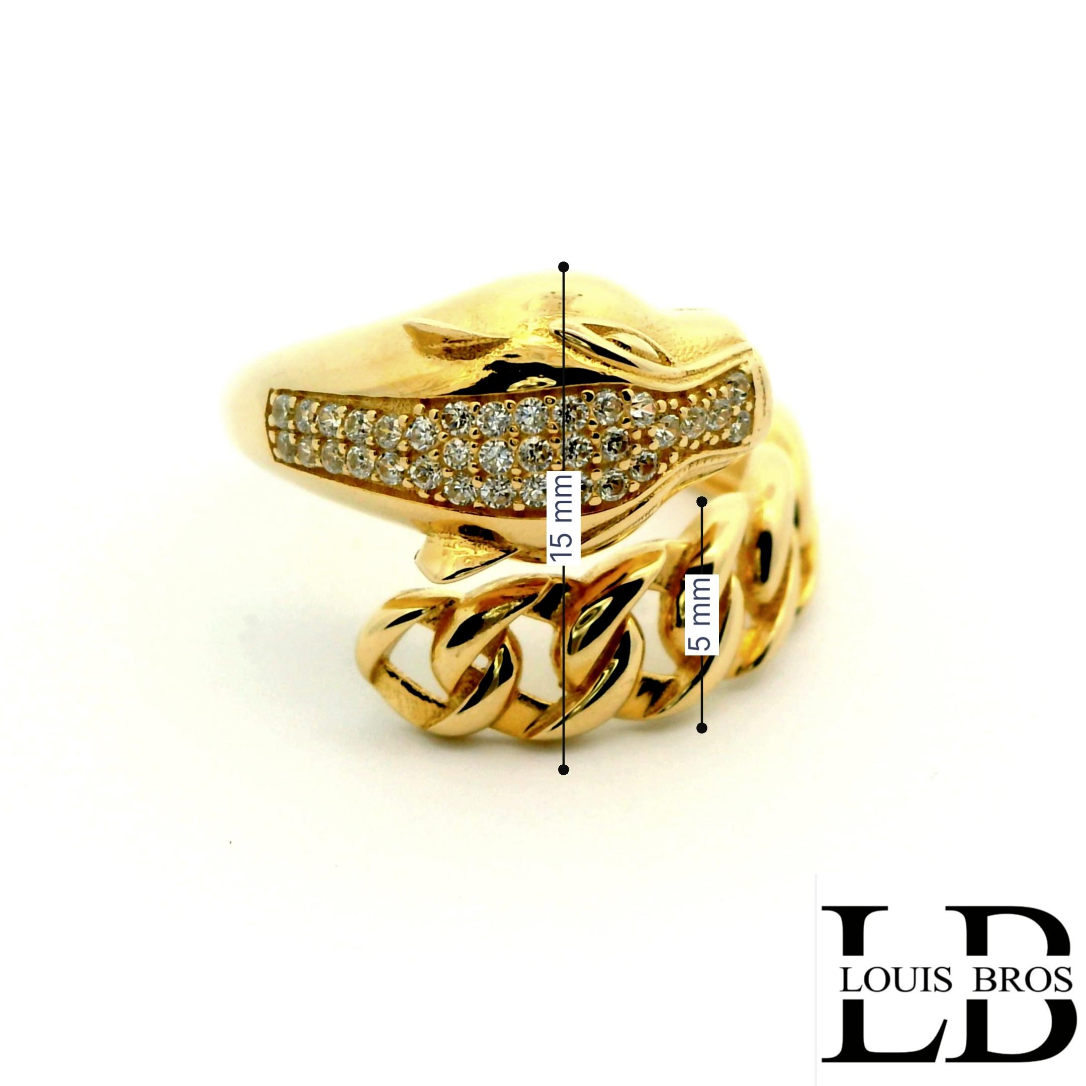 Deze elegante 14 karaat geelgouden ring (3.67 gr) is ontworpen met een opvallende panterkop als centraal element. De panter, een symbool van kracht en verfijning, is gedetailleerd vormgegeven en rijkelijk bezet met sprankelende zirkonia’s. De fonkelende stenen benadrukken de expressieve vormen van de kop en geven de ring een luxueuze uitstraling.