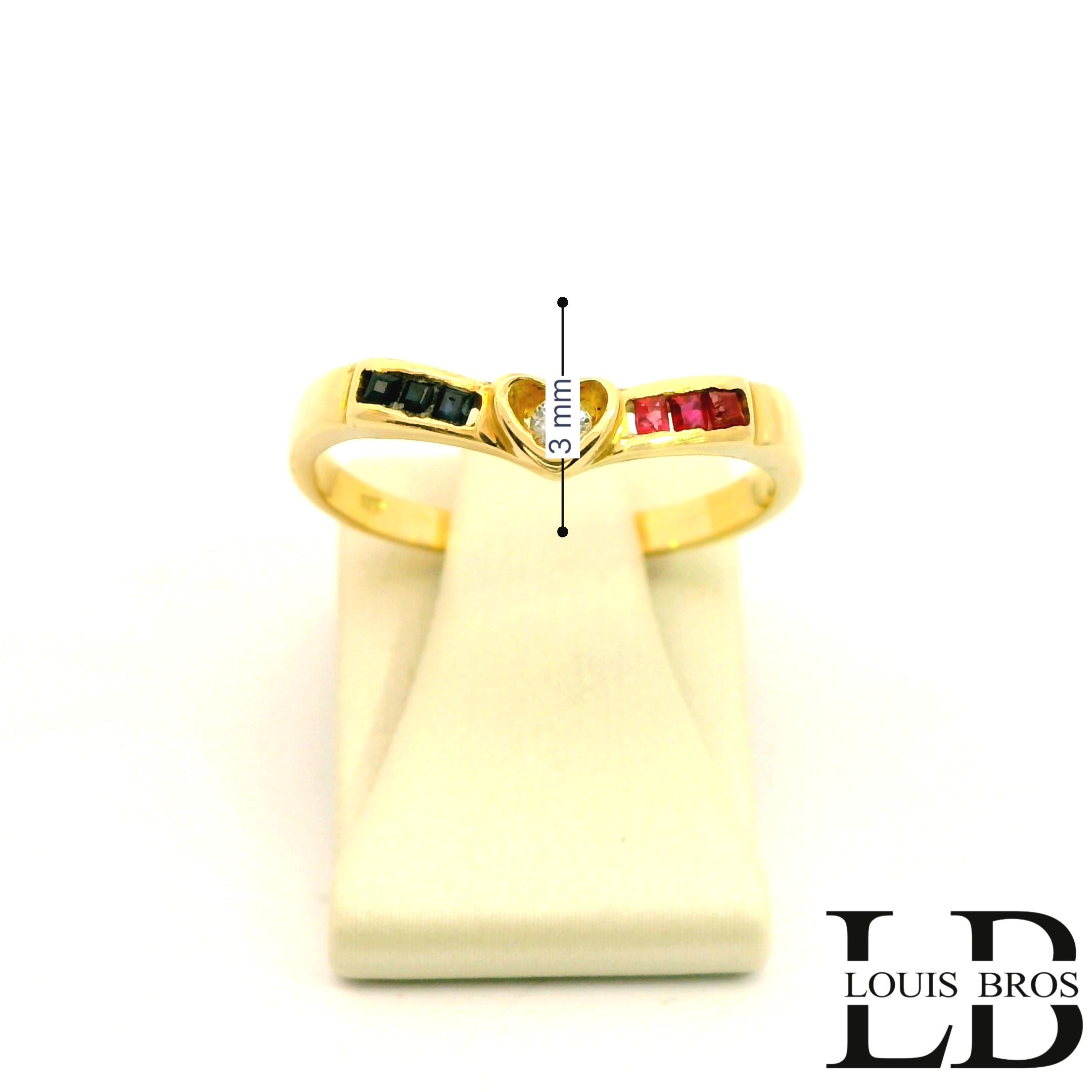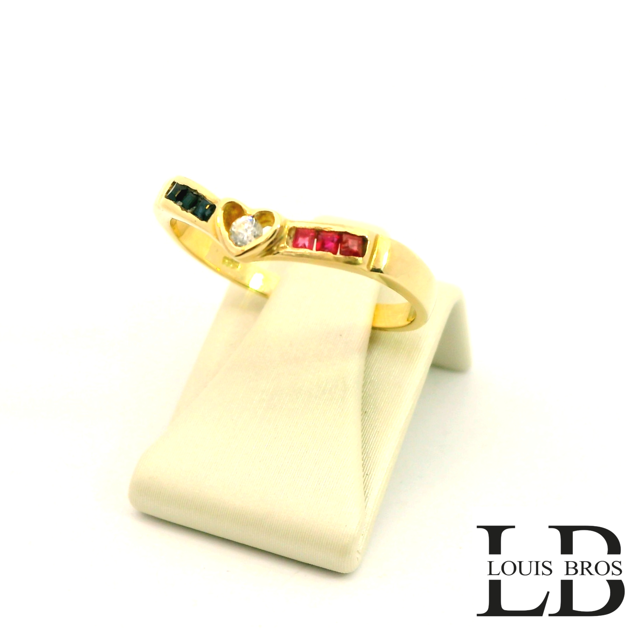 Elegante 4-karaats geelgouden ring voor dames, voorzien van een robuuste robijn en een glanzende onyx. Tijdloos design, perfect als uniek sieraad of aanvulling op uw collectie.