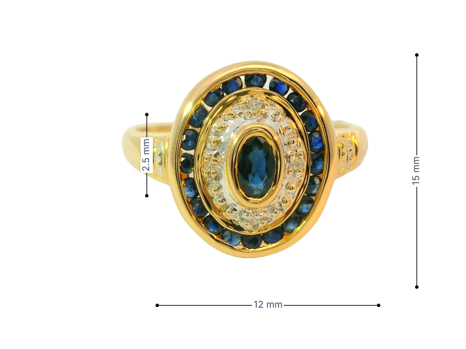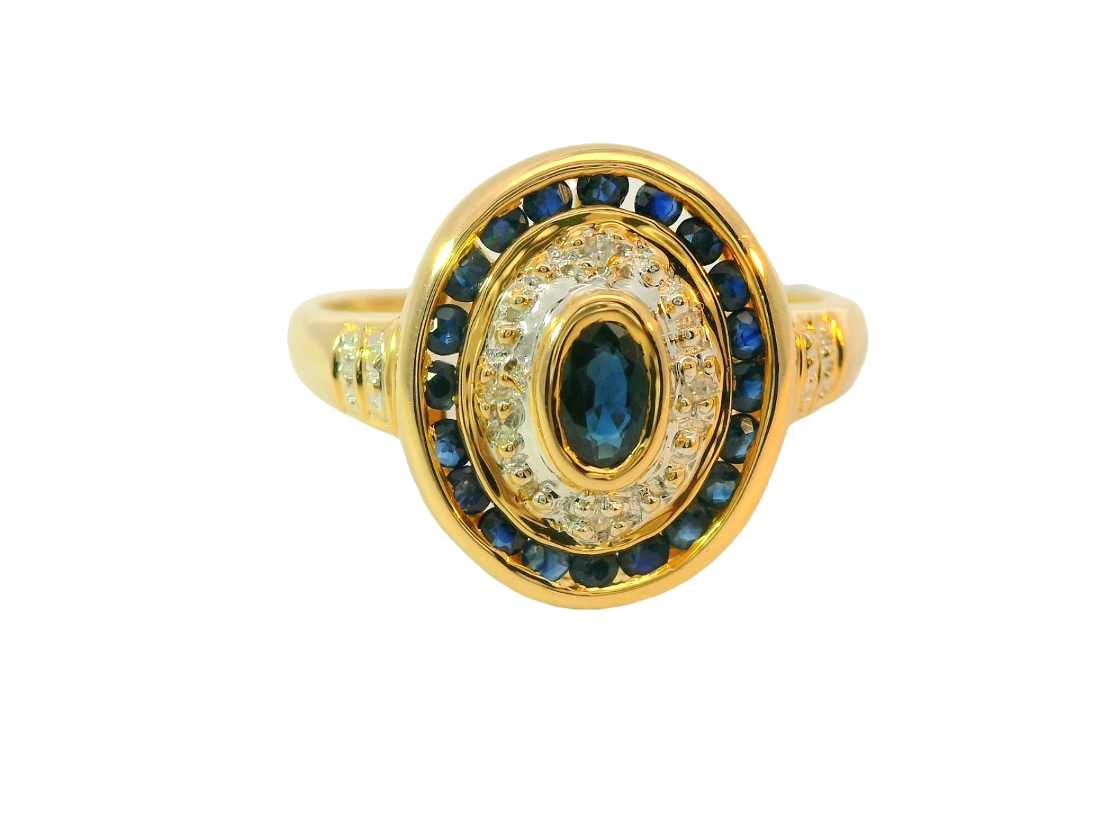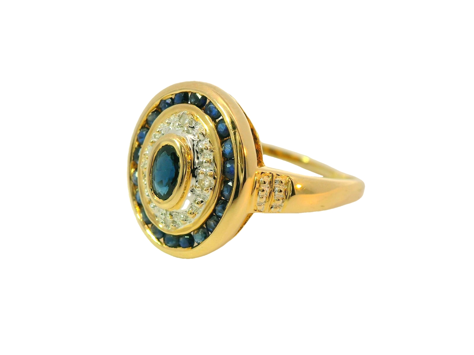 Deze vintage ring van Louis Bros is vervaardigd uit 14 karaat geelgoud (3.24 gr.) en is gezet met 28 briljant geslepen diamanten met een totaalgewicht van 0.10ct en 21 saffier met een totaal gewicht van 0.25 ct.