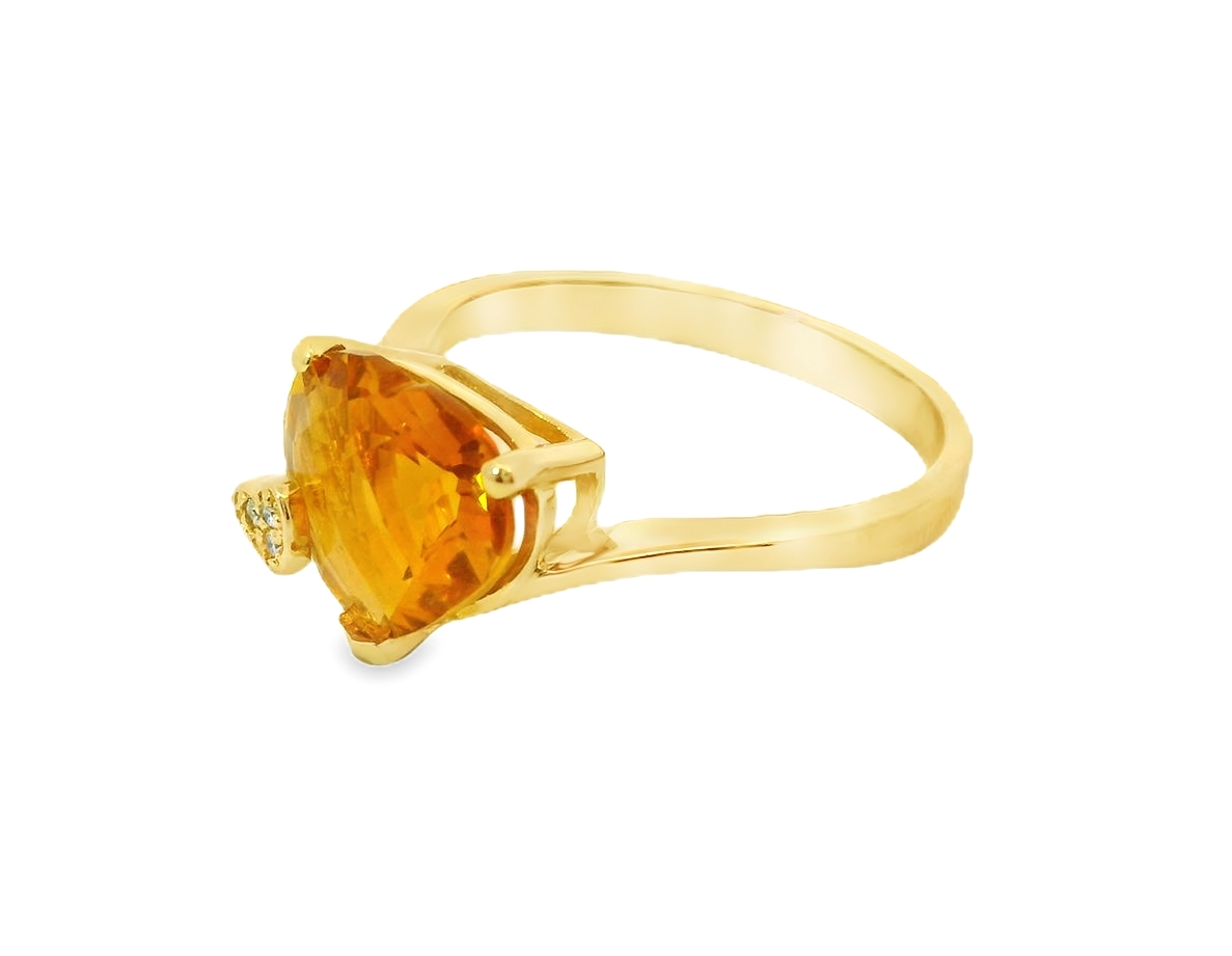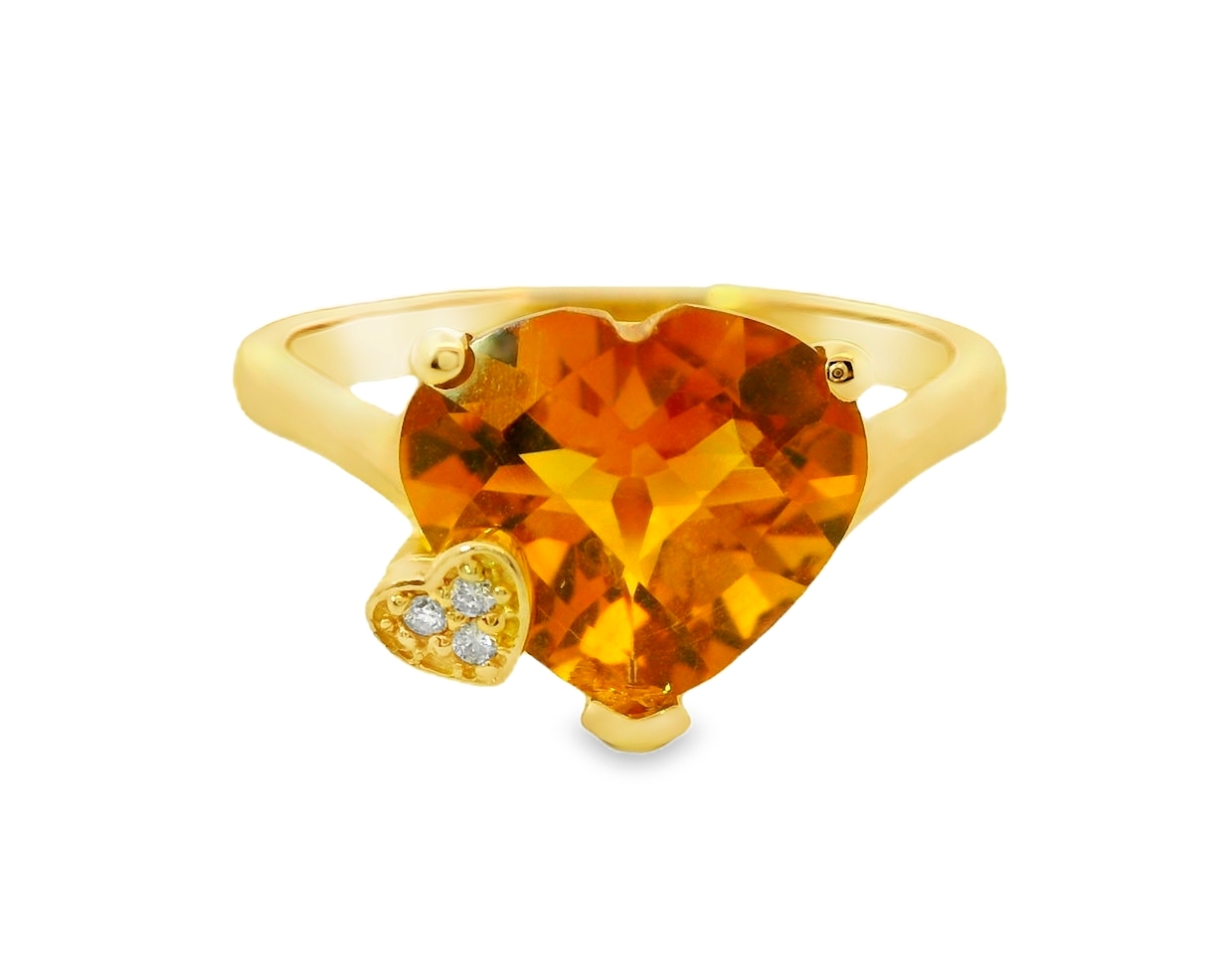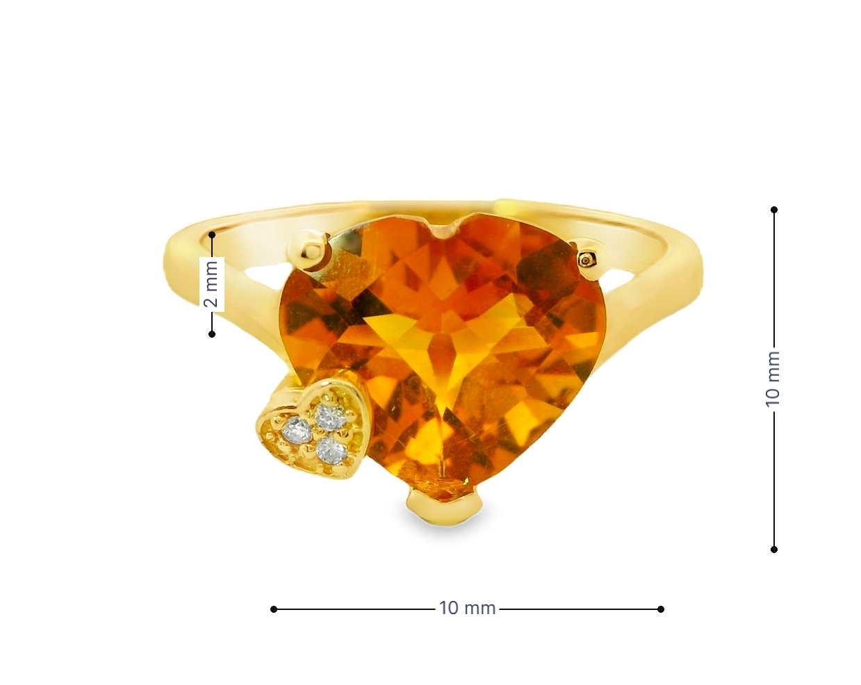 Deze elegante geelgouden ring straalt romantiek en warmte uit, met een hartvormige citriensteen als stralend middelpunt. De zonnige, warme kleur van de citrien wordt perfect aangevuld door de glans van het geelgoud, terwijl drie sprankelende diamanten aan weerszijden een verfijnde touch toevoegen. Deze ring is een subtiele maar krachtige uiting van stijl, ideaal om je look net dat beetje extra glans en kleur te geven.