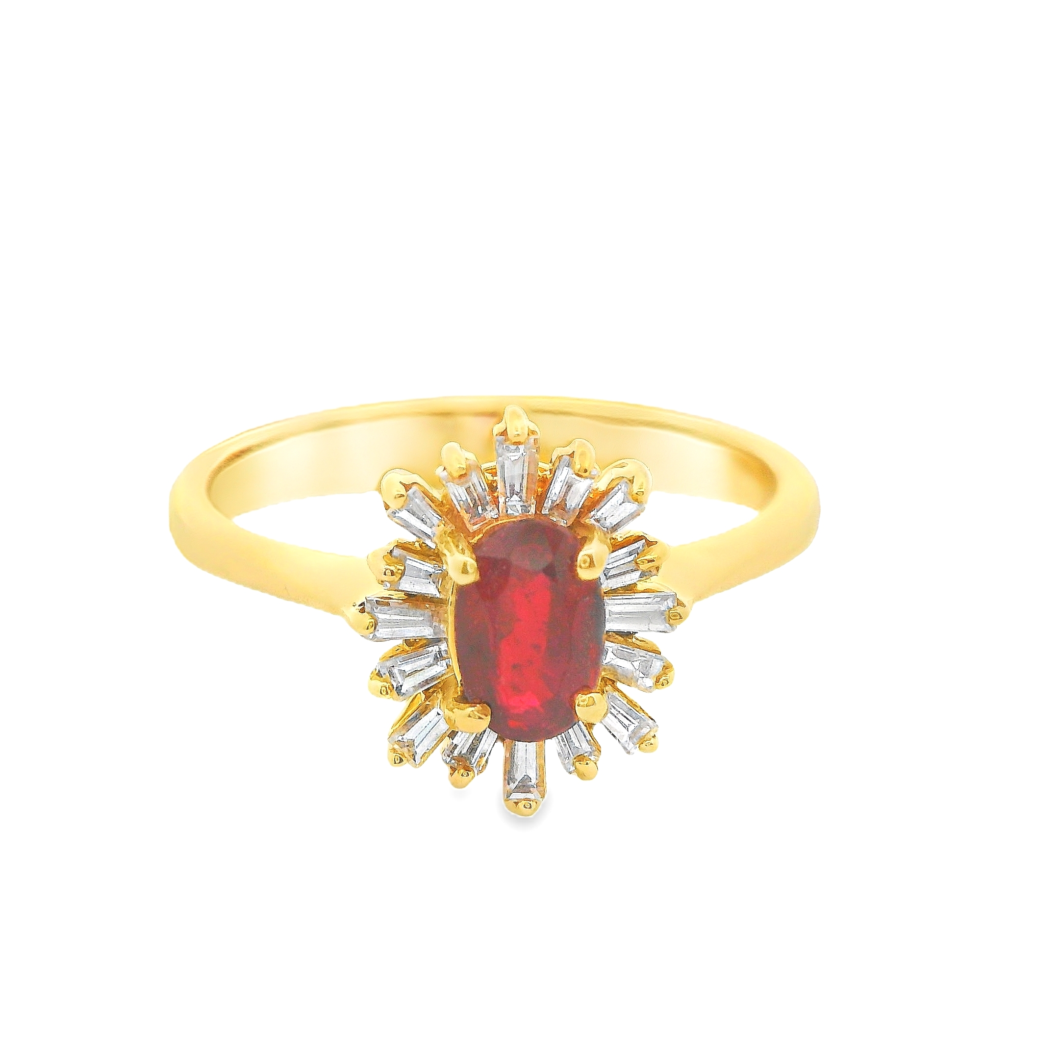Deze ring combineert de rijke kleur van een robijn met de schittering van diamanten. Het warme geelgoud benadrukt de diepe, rode tint van de robijn, terwijl de diamanten een sprankelend contrast toevoegen. Dit elegante ontwerp straalt luxe en verfijning uit, waardoor de ring perfect is voor zowel speciale gelegenheden als dagelijks gebruik. Een tijdloos en prachtig sieraad dat een bijzondere aanvulling vormt op elke sieradencollectie.