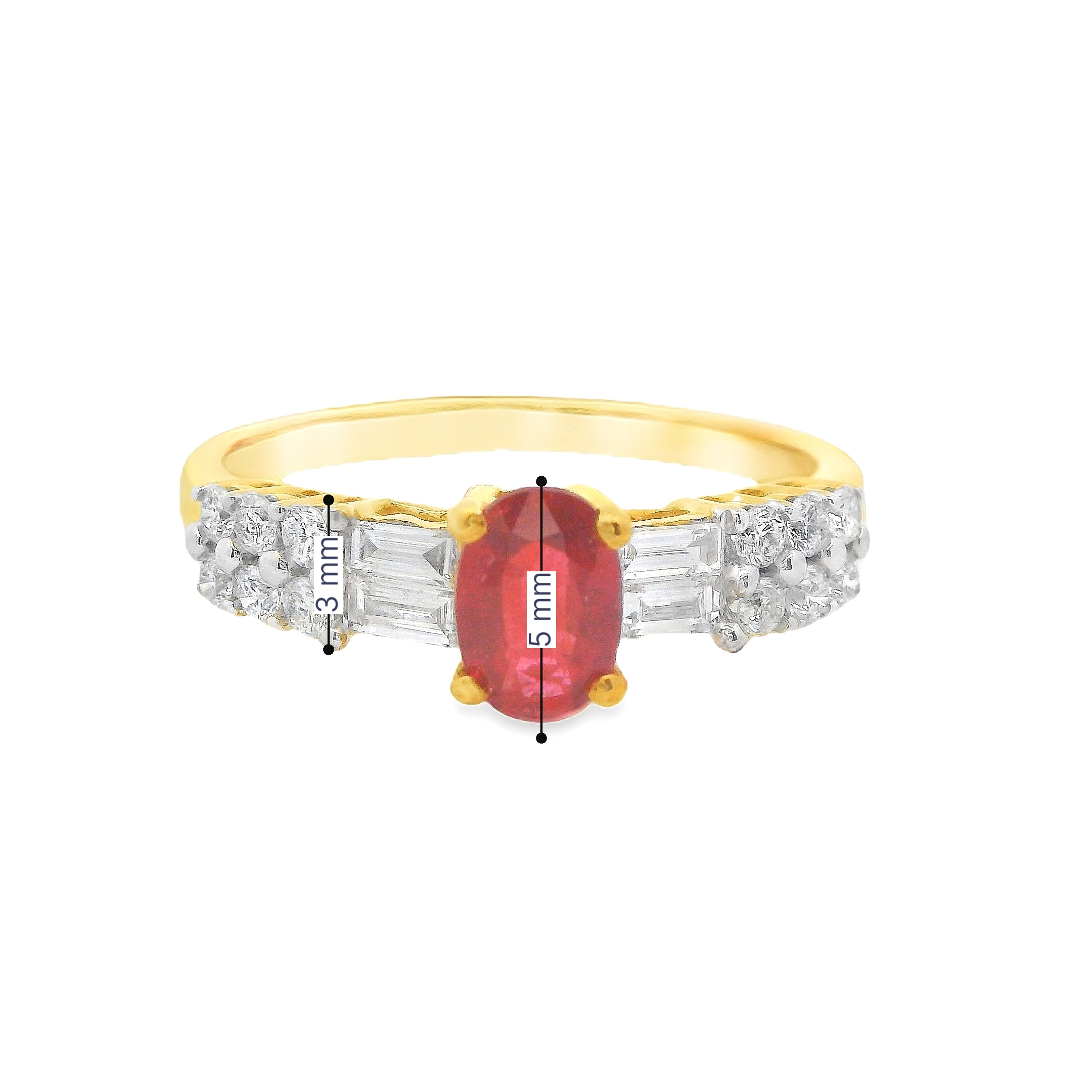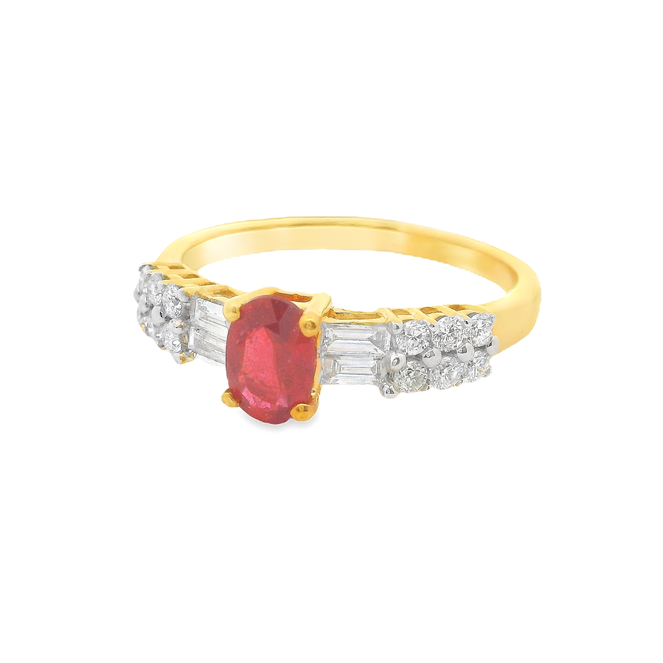 Deze ring combineert de rijke kleur van een robijn met de schittering van diamanten. Het warme geelgoud benadrukt de diepe, rode tint van de robijn, terwijl de diamanten een sprankelend contrast toevoegen. Dit elegante ontwerp straalt luxe en verfijning uit, waardoor de ring perfect is voor zowel speciale gelegenheden als dagelijks gebruik. Een tijdloos en prachtig sieraad dat een bijzondere aanvulling vormt op elke sieradencollectie.