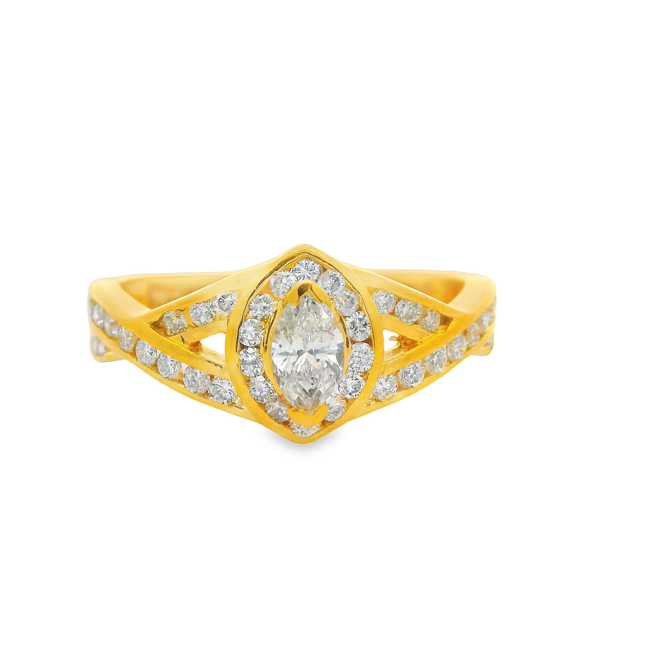 Deze ring van Louis Bros is vervaardigd uit 18 karaat geelgoud (4.gr.) en is gezet met 1 marquise diamant 0.25ct, en 37 briljant geslepen diamanten met een totaalgewicht van 0.38ct. De ring heeft een breedte van 9 mm, en een dikte van 4 mm. Deze prachtige gele gouden ring, met een tijdloos klassiek ontwerp, is een ware blikvanger. In het hart van de ring pronkt een schitterende marquise diamant, die elegantie en verfijning uitstraalt. Omringd door een halo van briljant geslepen diamanten, fonkelt deze ring met een ongeëvenaarde pracht en allure. Het 18 karaat gouden omhulsel dient als een perfecte omlijsting voor de schitterende edelstenen, waardoor de ring een symbool wordt van tijdloze schoonheid en onvergankelijke stijl. Een meesterwerk van vakmanschap en elegantie, deze ring belichaamt de klassieke charme die de tand des tijds doorstaat.