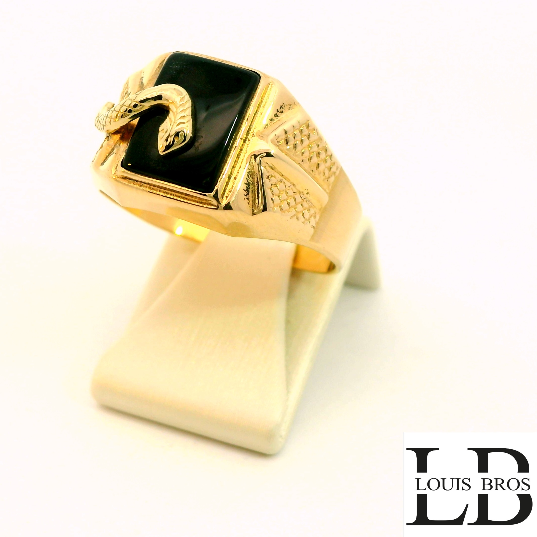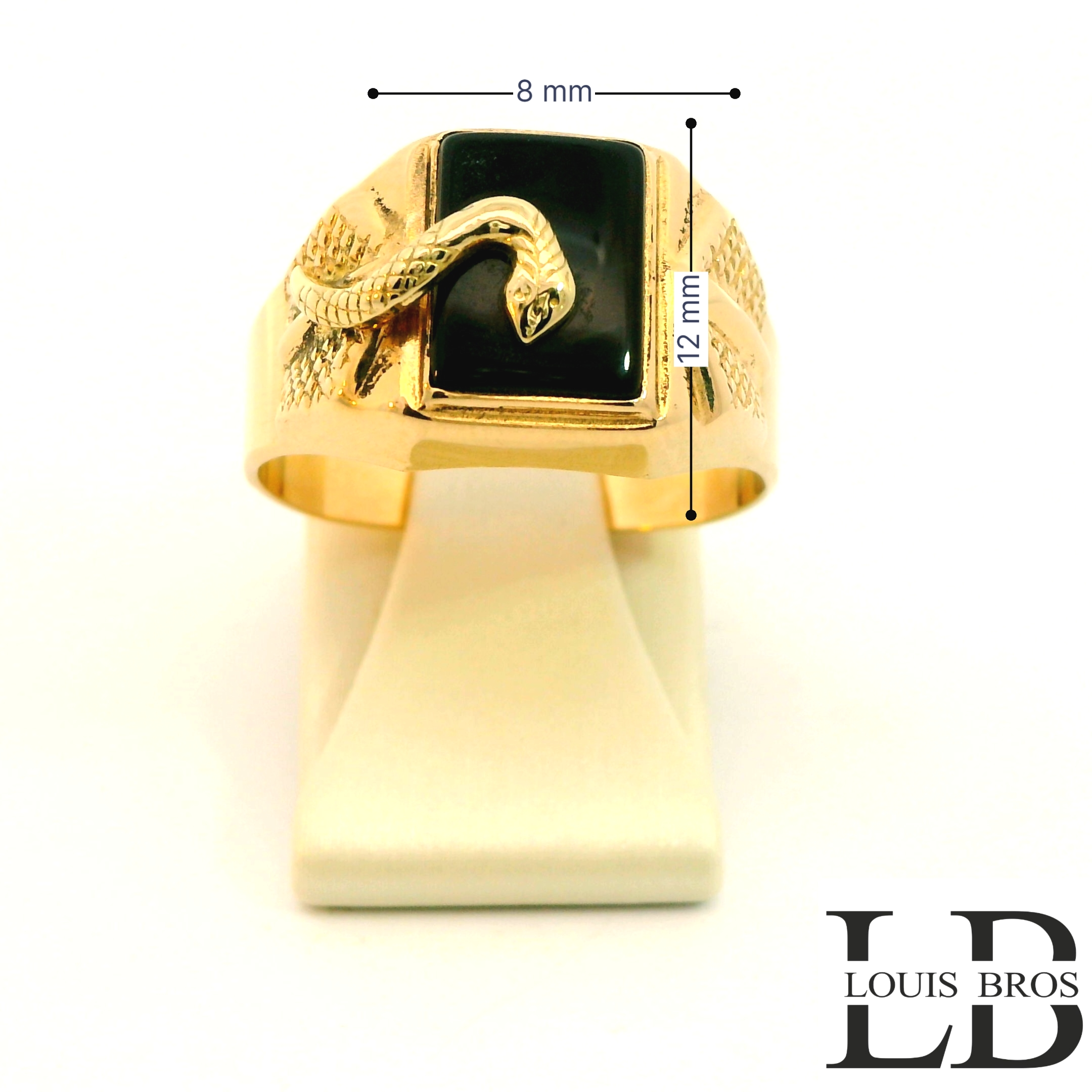 Deze bijzondere occasion ring is vervaardigd uit 14 karaat geelgoud en is voorzien van een diepzwarte onyx, subtiel verwerkt in een opvallend slangontwerp. De slang – een eeuwenoud symbool van kracht, transformatie en bescherming – kronkelt elegant rond de steen, wat de ring een mystieke en karaktervolle uitstraling geeft.