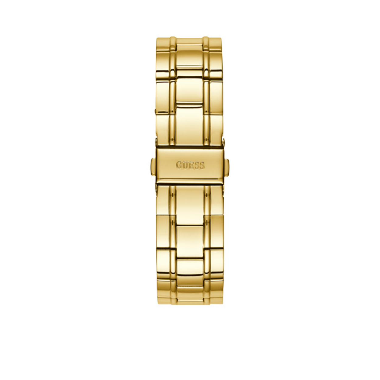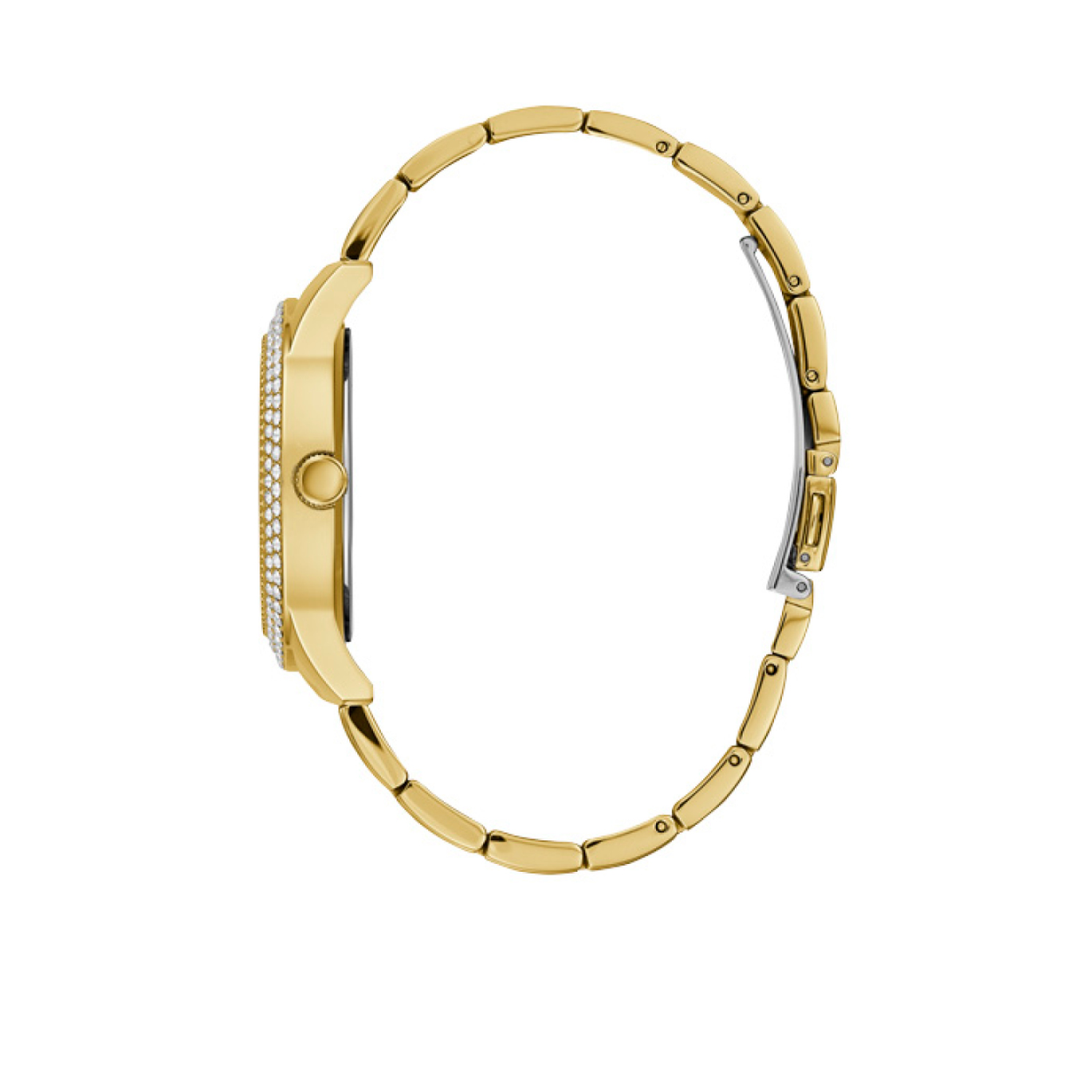 De goudkleurige Bedazzler is een echte musthave! Dit nieuwe dames horloge uit de Guess Watches collectie steelt elke blik! De lunet is versierd met crystals die ook terug komen op de wijzerplaat. De ronde kast heeft een diameter van 40 mm. De schakelband heeft een lengte van 19 cm. Het horloge is tot 3 ATM waterdicht. Combineer dit horloge hoe jij wilt van dag tot avond. Model: W1097L2