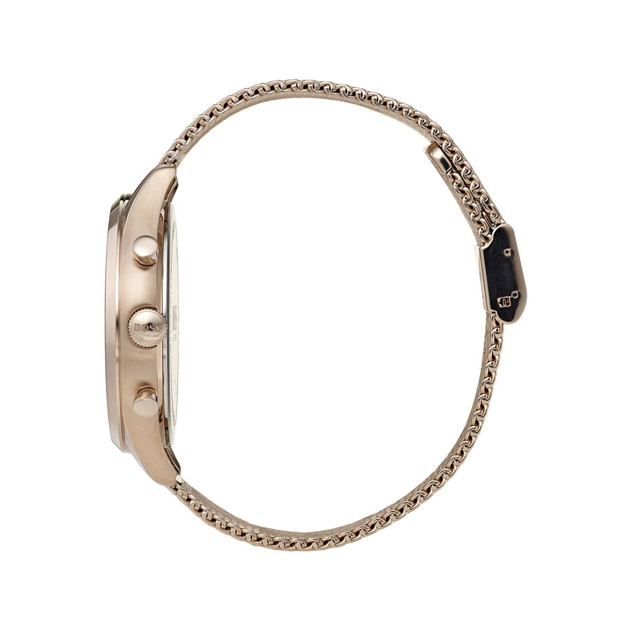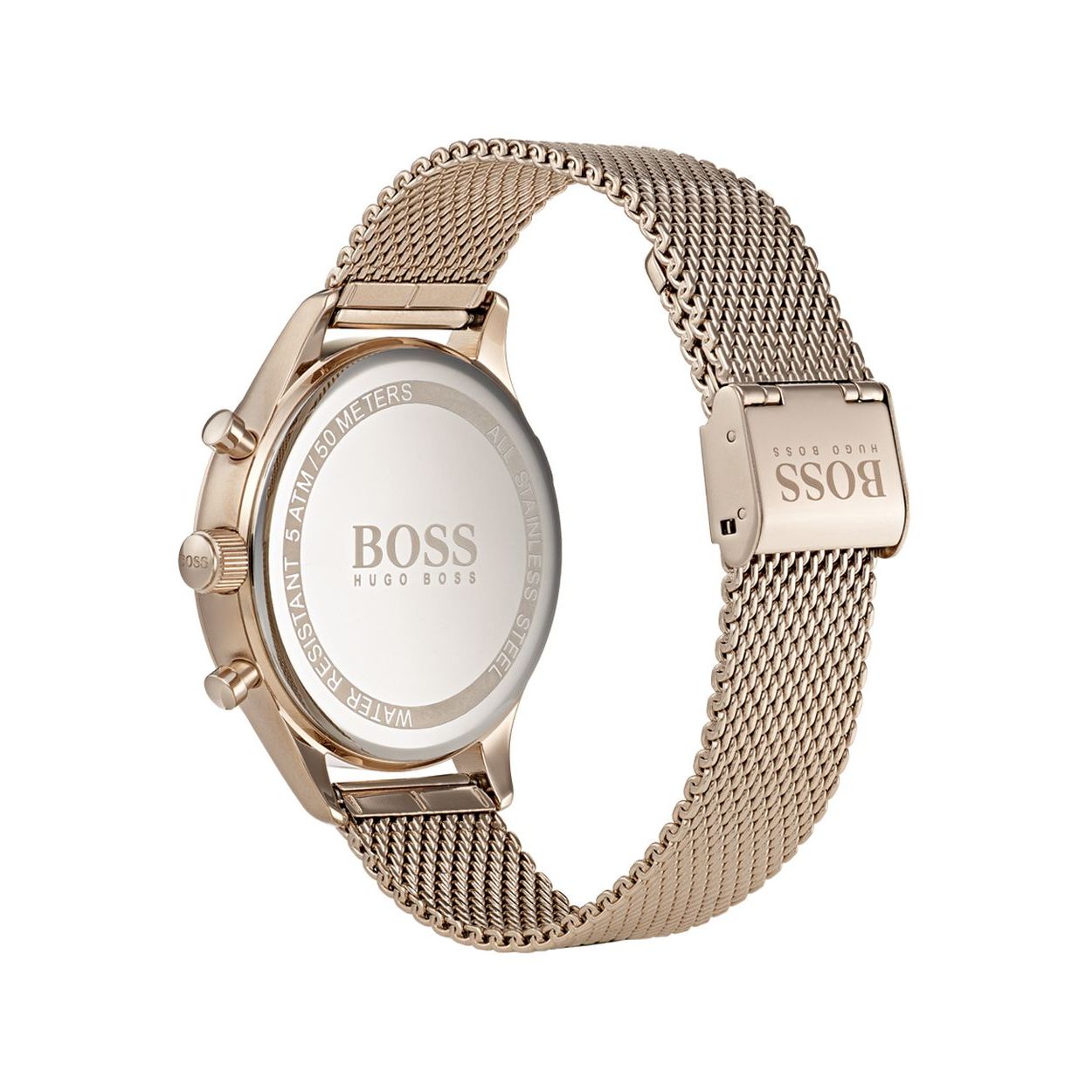 Deze herenchronograaf uit de Hugo Boss Campagnion serie is een casual sportief horloge. Het horloge heeft licht gebold mineraalglas, een zwarte wijzerplaat en een rosékleurige stalen horlogekast met een kastdiameter van 42 mm. De band van het horloge is van Milanees gevlochten rosékleurig staal. De stalen band is gemakkelijk op maat te maken d.m.v. een schroevendraaier. Duw het klepje omhoog en plaats de sluiting op de juiste positie. Na het dichtduwen van het klepje is het horloge opnieuw klaar voor gebruik! Het ontwerp van het horloge is geïnspireerd op het klassieke kompas. De band van het horloge is gemakkelijk op maat te maken d.m.v. een schroevendraaier. Duw het klepje omhoog en plaats de sluiting op de juiste positie. Na het dichtduwen van het klepje is het horloge opnieuw klaar voor gebruik! U kunt dit zo vaak doen als nodig. Model: HB1513548.
