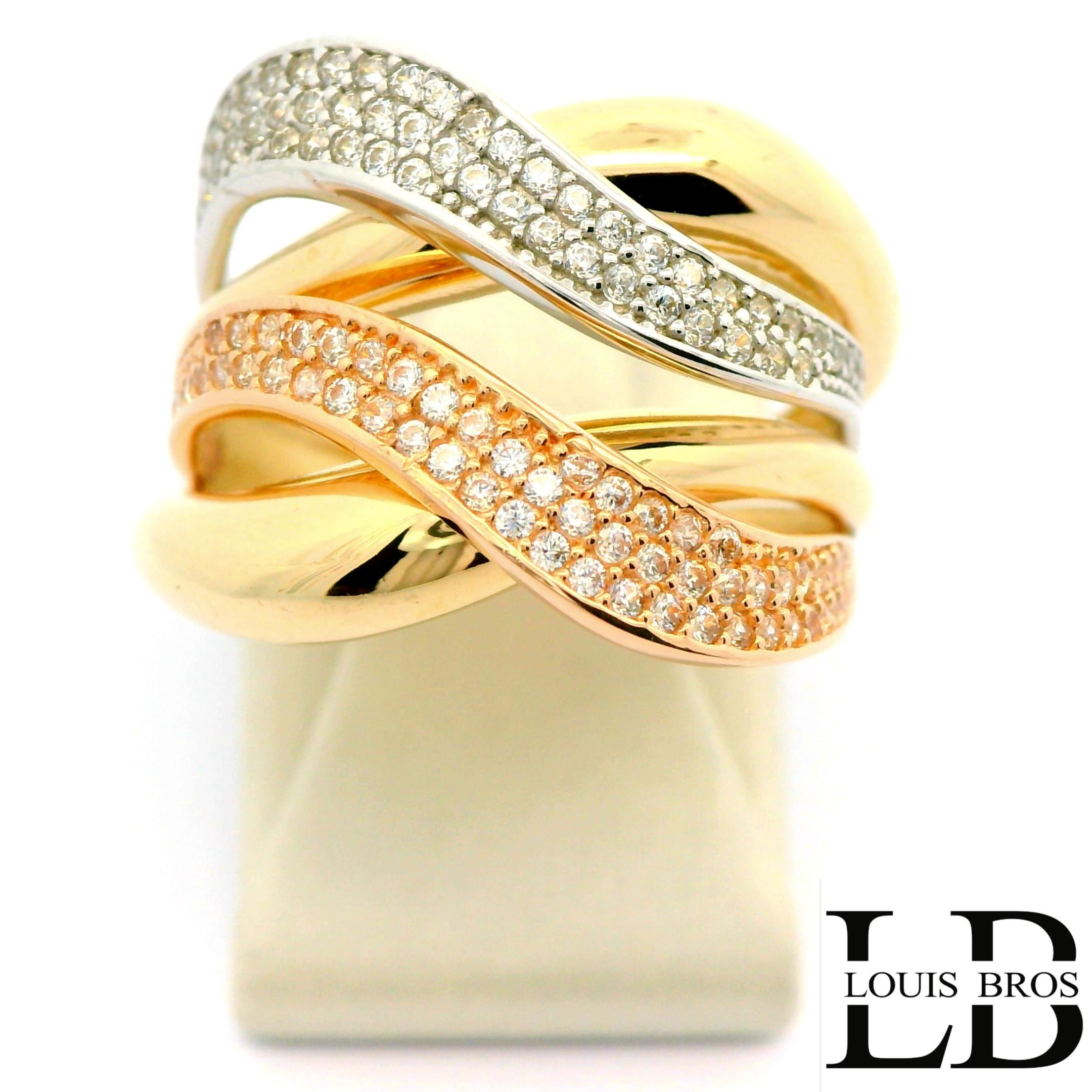 Deze schitterende ring is vervaardigd uit 14 karaat tricolor goud (5.09 gr), waarbij geel-, wit- en rosegoud op elegante wijze samenkomen. Het speelse kleurenspel geeft de ring een unieke en luxe uitstraling. De ring is verder verrijkt met fonkelende zirkonia’s, die zorgen voor een sprankelende schittering bij iedere beweging.