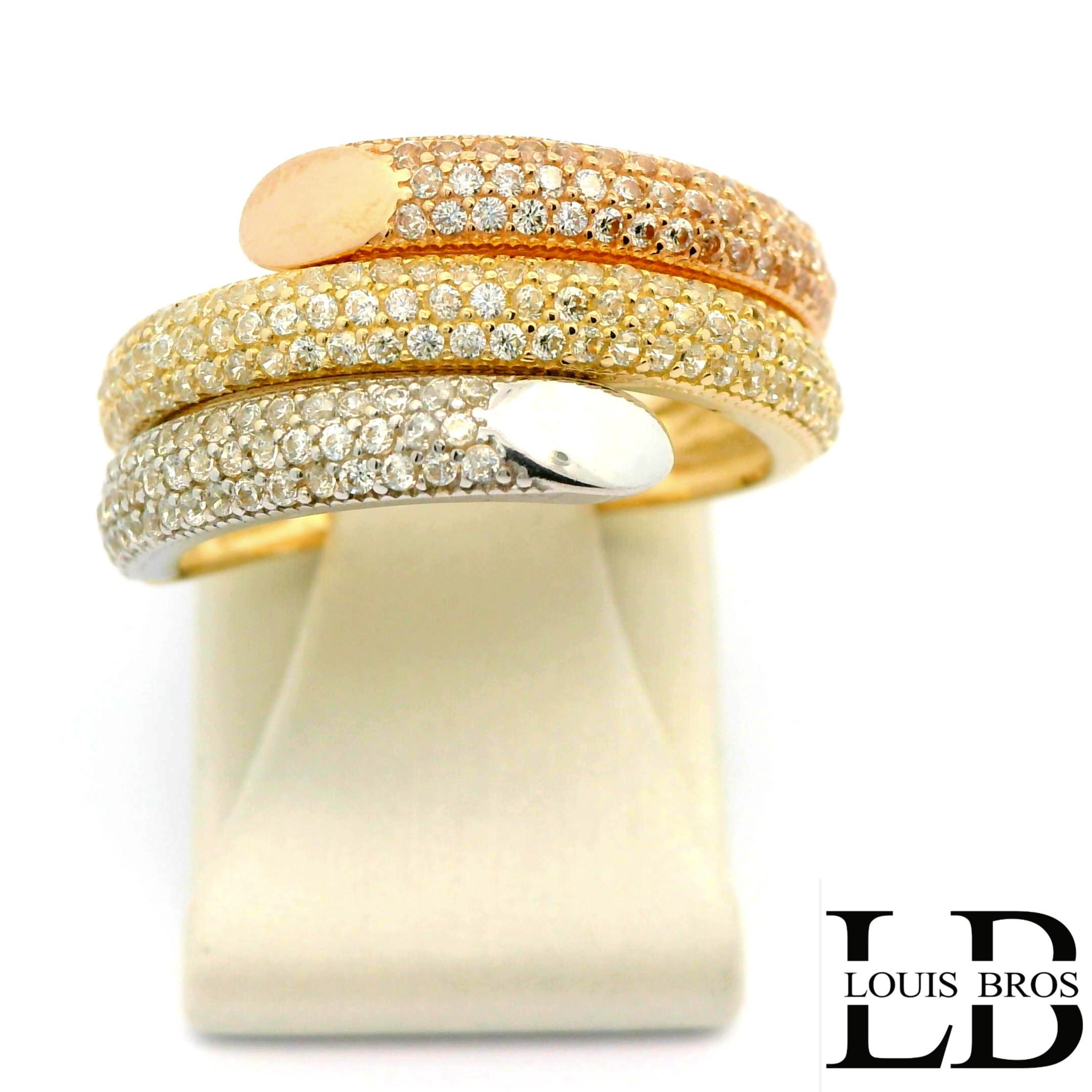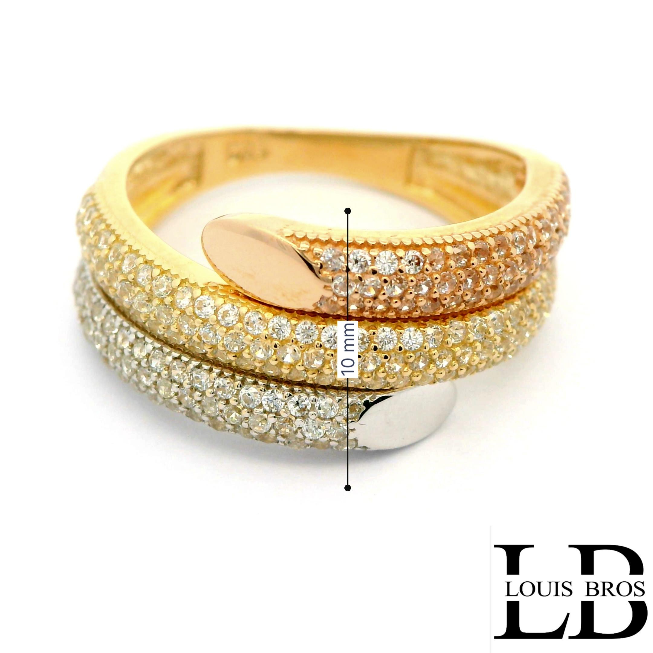 Deze schitterende ring is vervaardigd uit 14 karaat tricolor goud (4.54 gr), waarbij geel-, wit- en rosegoud op elegante wijze samenkomen. Het speelse kleurenspel geeft de ring een unieke en luxe uitstraling. De ring is verder verrijkt met fonkelende zirkonia’s, die zorgen voor een sprankelende schittering bij iedere beweging.
