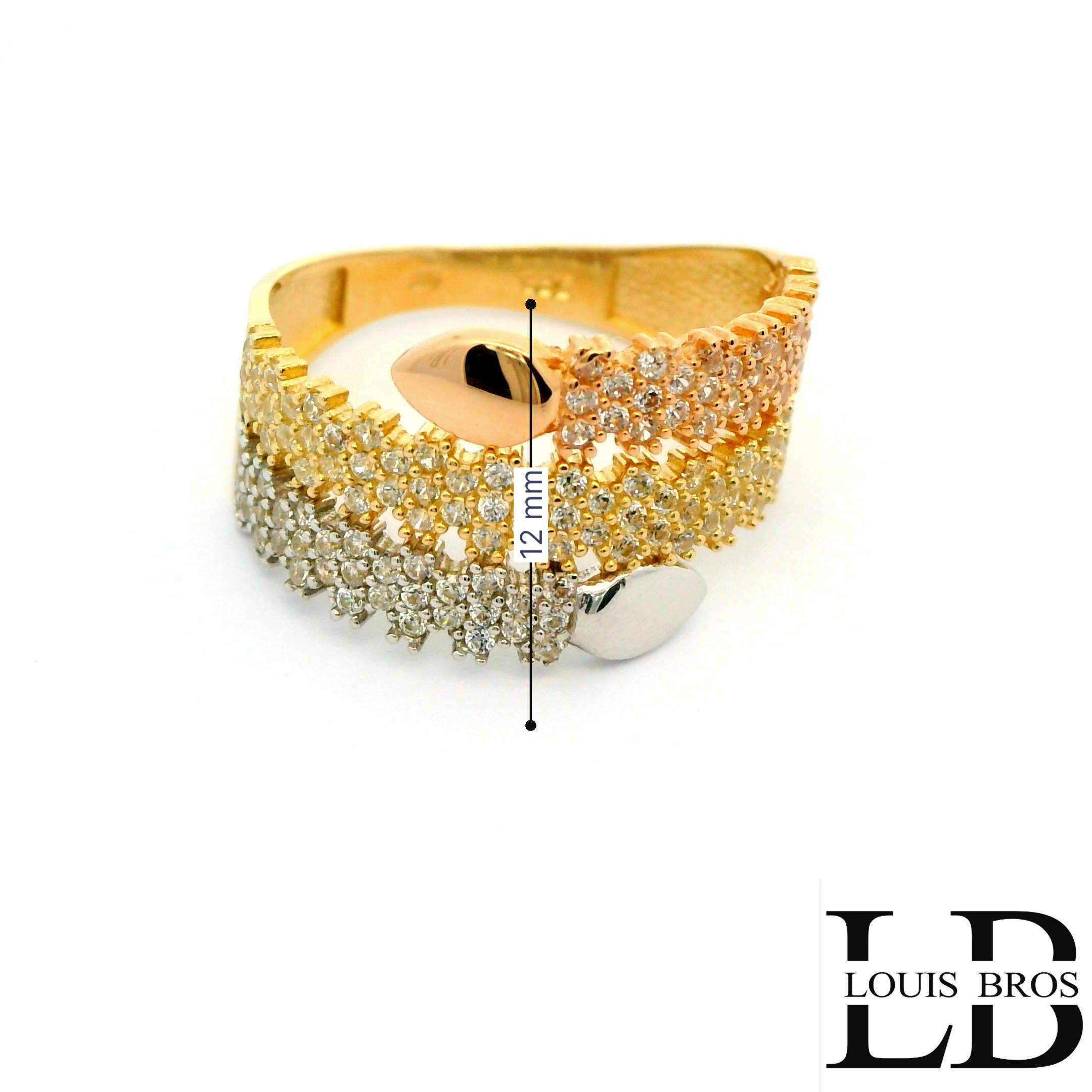 Deze schitterende ring is vervaardigd uit 14 karaat tricolor goud (3.78 gr), waarbij geel-, wit- en rosegoud op elegante wijze samenkomen. Het speelse kleurenspel geeft de ring een unieke en luxe uitstraling. De ring is verder verrijkt met fonkelende zirkonia’s, die zorgen voor een sprankelende schittering bij iedere beweging.