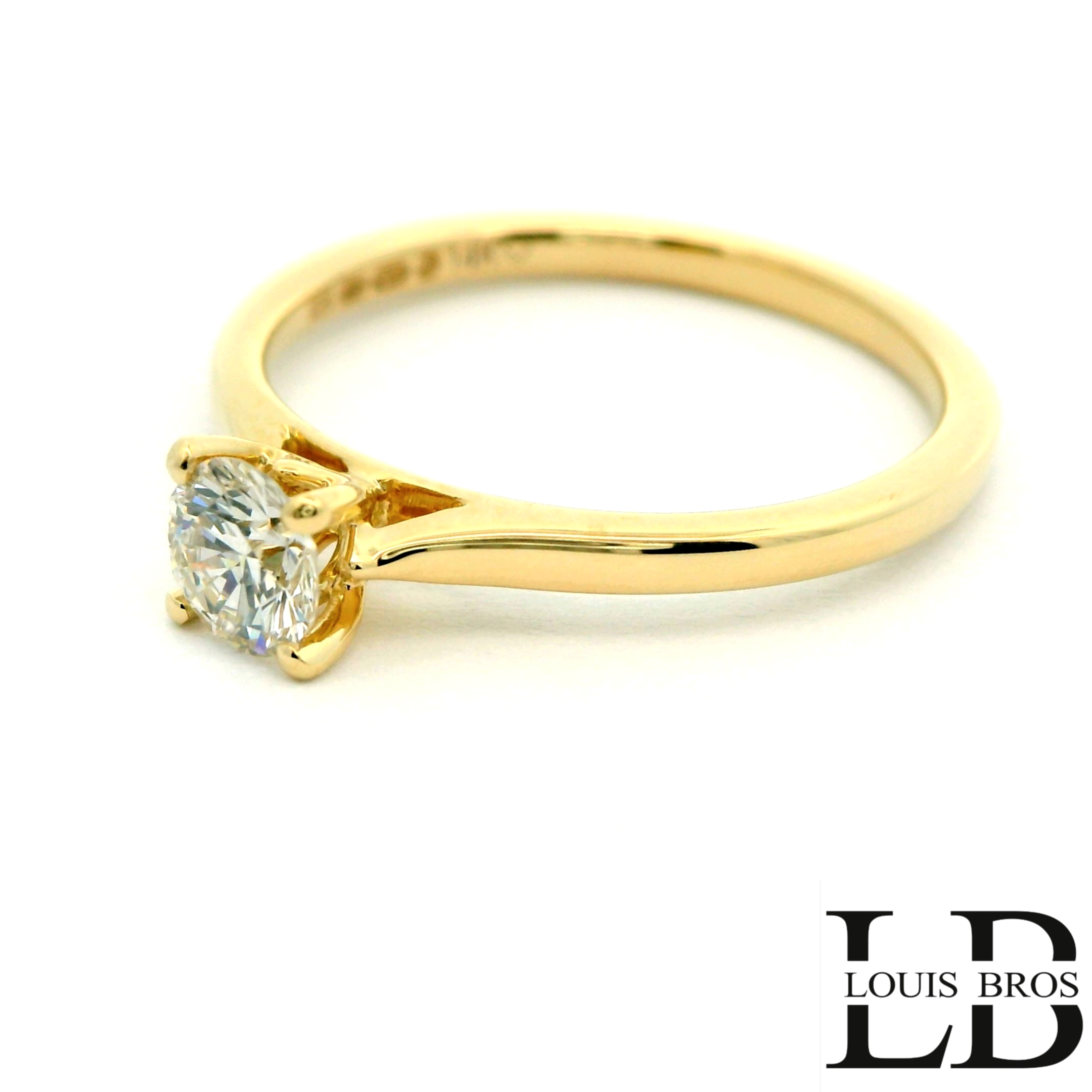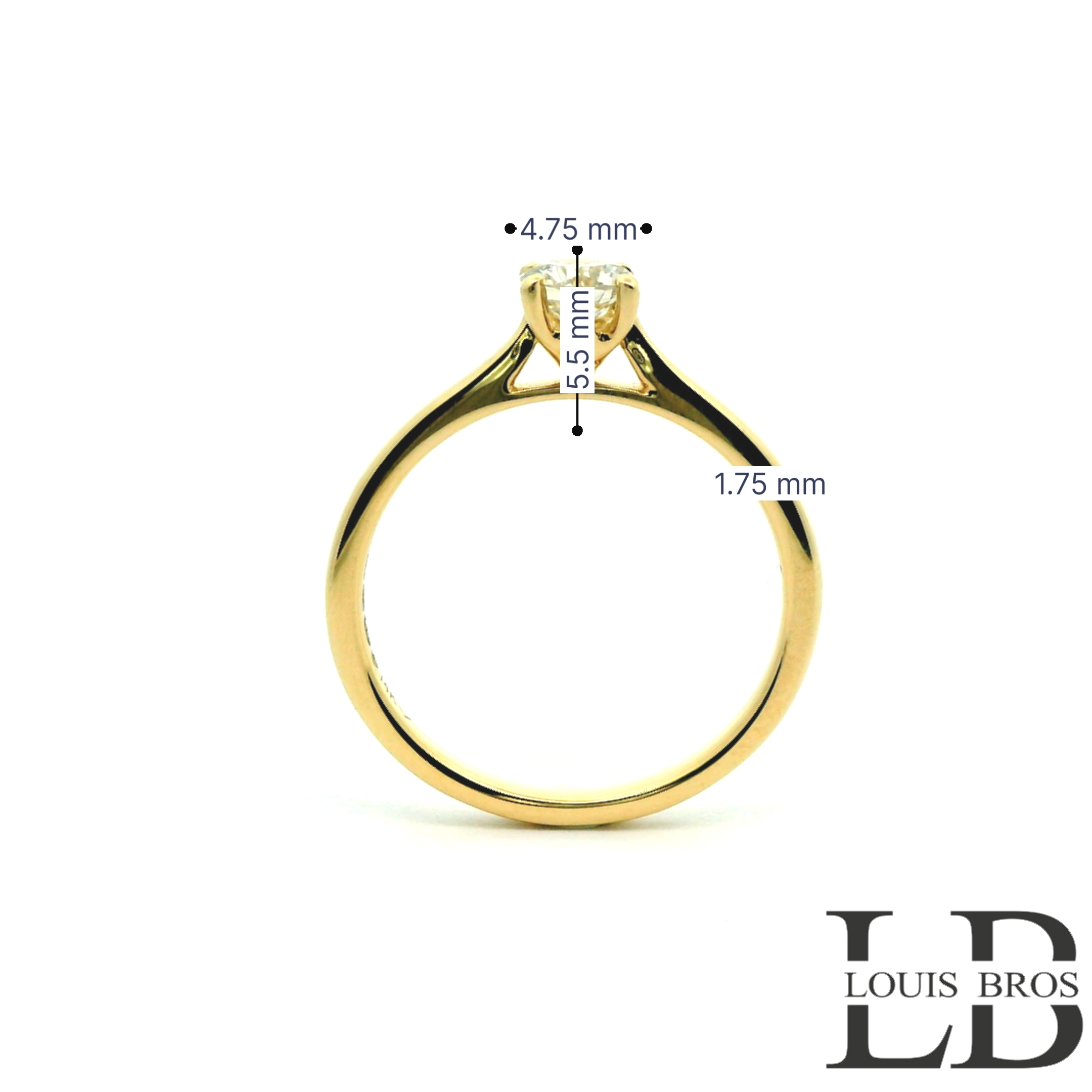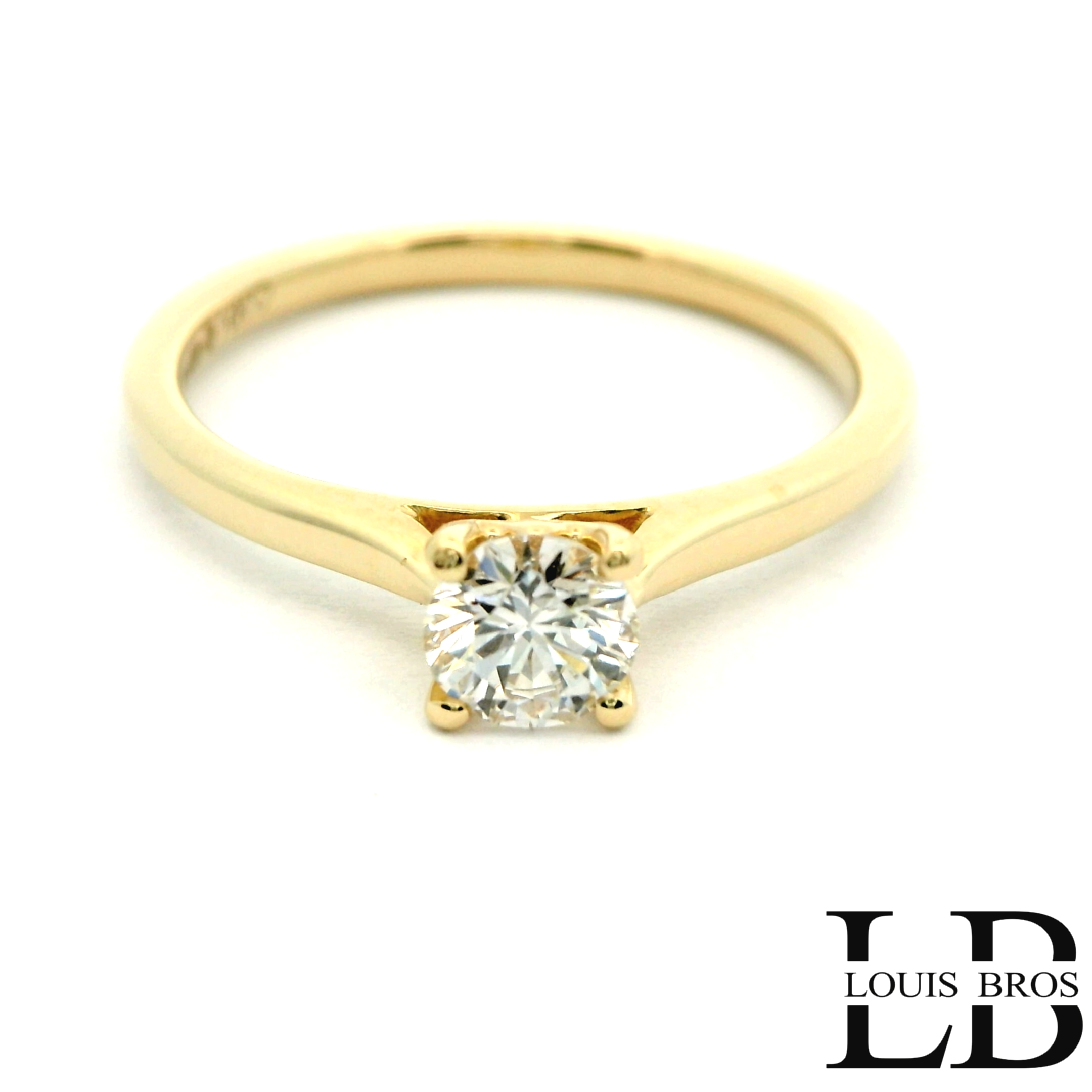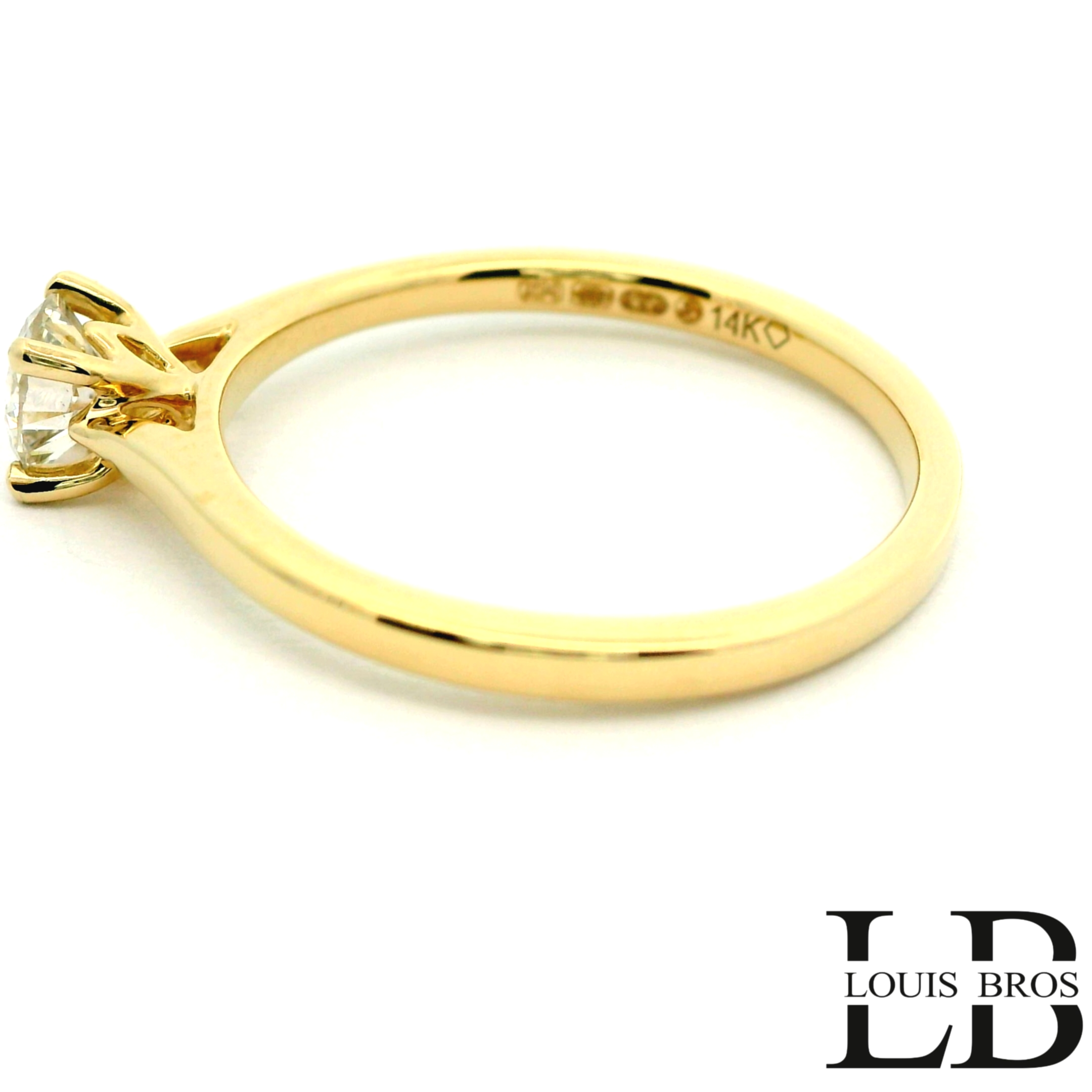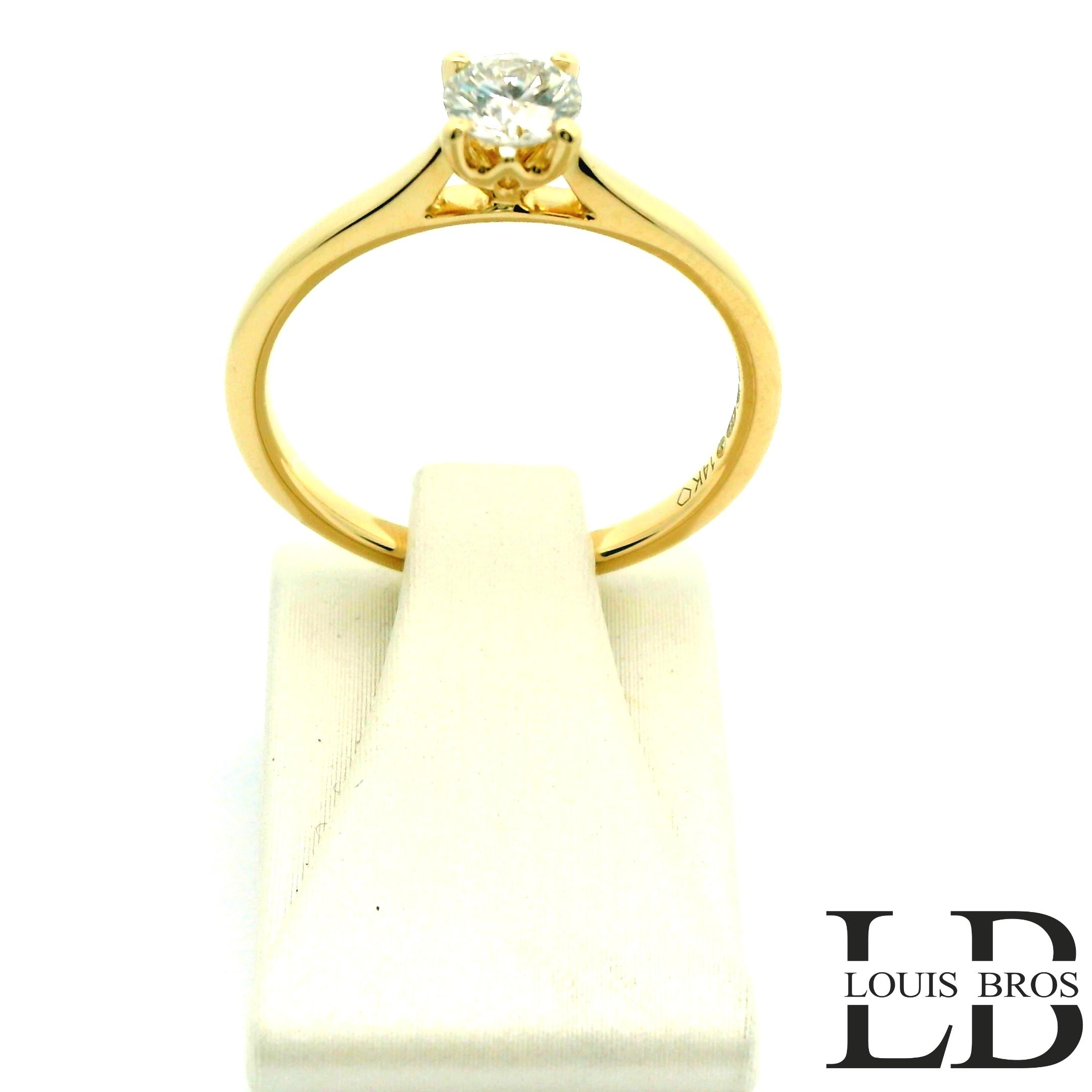 Deze ring van Louis Bros is vervaardigd uit 14 karaat geelgoud (3.5 gr.) en is gezet met 1 briljant geslepen diamanten met een totaalgewicht van 0.50CT. De ring heeft een diameter van 4.75 mm, minimale breedte van 1.75 mm. en een hoogte van 5.5 mm.