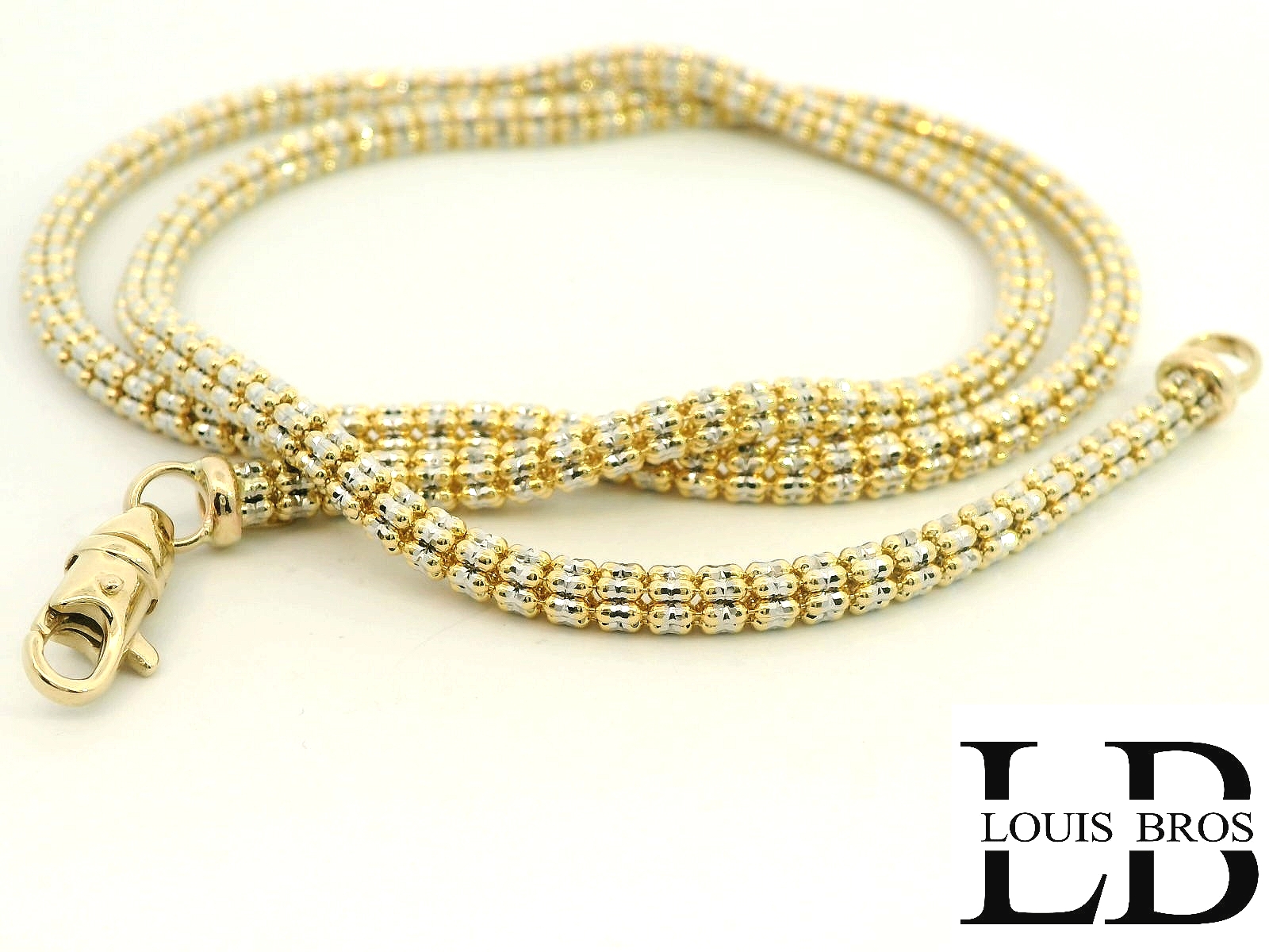 Breng elegantie en verfijning samen met dit schitterende bicolor collier van 14 karaat goud (21.80 gr). Dit meesterlijk vervaardigde collier combineert geelgoud en witgoud in een uniek, glinsterend vlechtpatroon dat direct in het oog springt. De fijne afwerking van de kleine bolschakels zorgt voor een luxe textuur en een prachtige lichtreflectie.