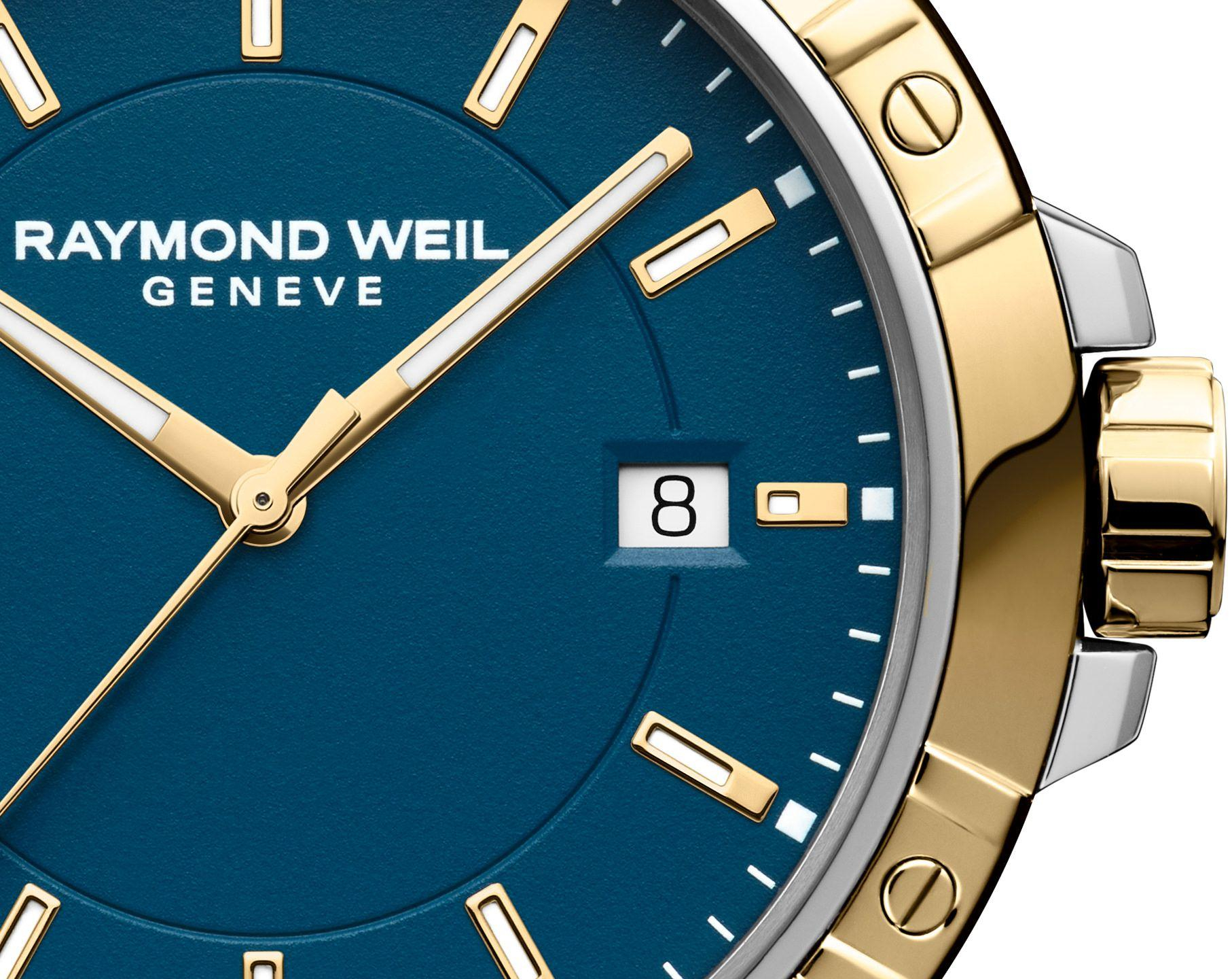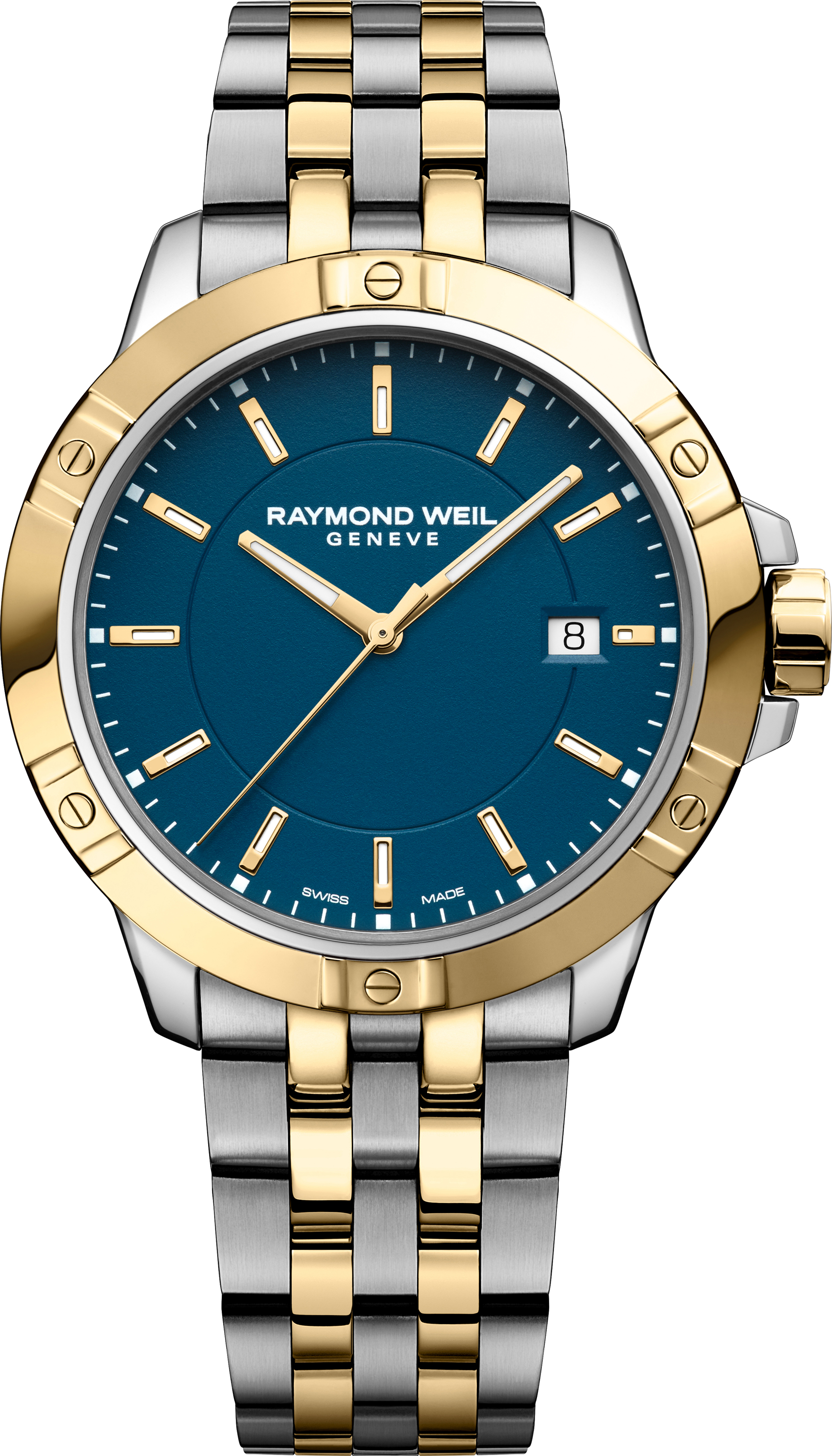 Deze RAYMOND WEIL horloge, modelnummer 8160-STP-50041, beschikt over een blauw analoog wijzerplaat met streep indexen, quartz uurwerk en saffierglas. De horlogekast en -band zijn van roestvrij staal in goud-zilver tinten. Waterbestendig tot 30 meter. Het beste te dragen bij formele of professionele gelegenheden waar een elegante uitstraling gewenst is.