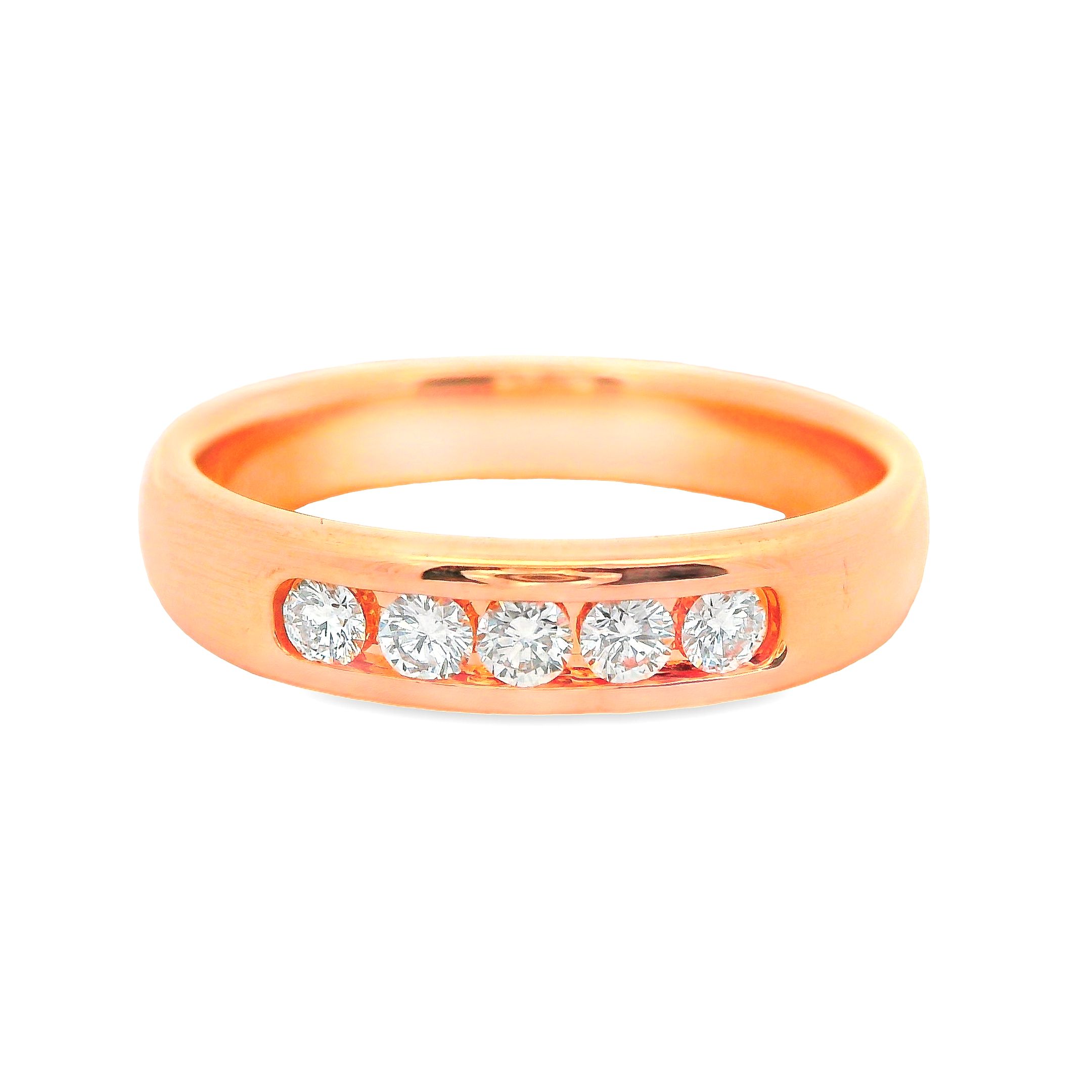 Deze ring van Louis Bros is vervaardigd uit 14 karaat roségoud (4.25 gr.) en is gezet met 5 briljant geslepen diamanten met een totaalgewicht van 0.25ct. De ring heeft een breedte van 4 mm en een hoogte van 2 mm. Deze ring bestaat uit onze lijn van exclusieve modellen sieraden met prachtige designs van hoge kwaliteit.