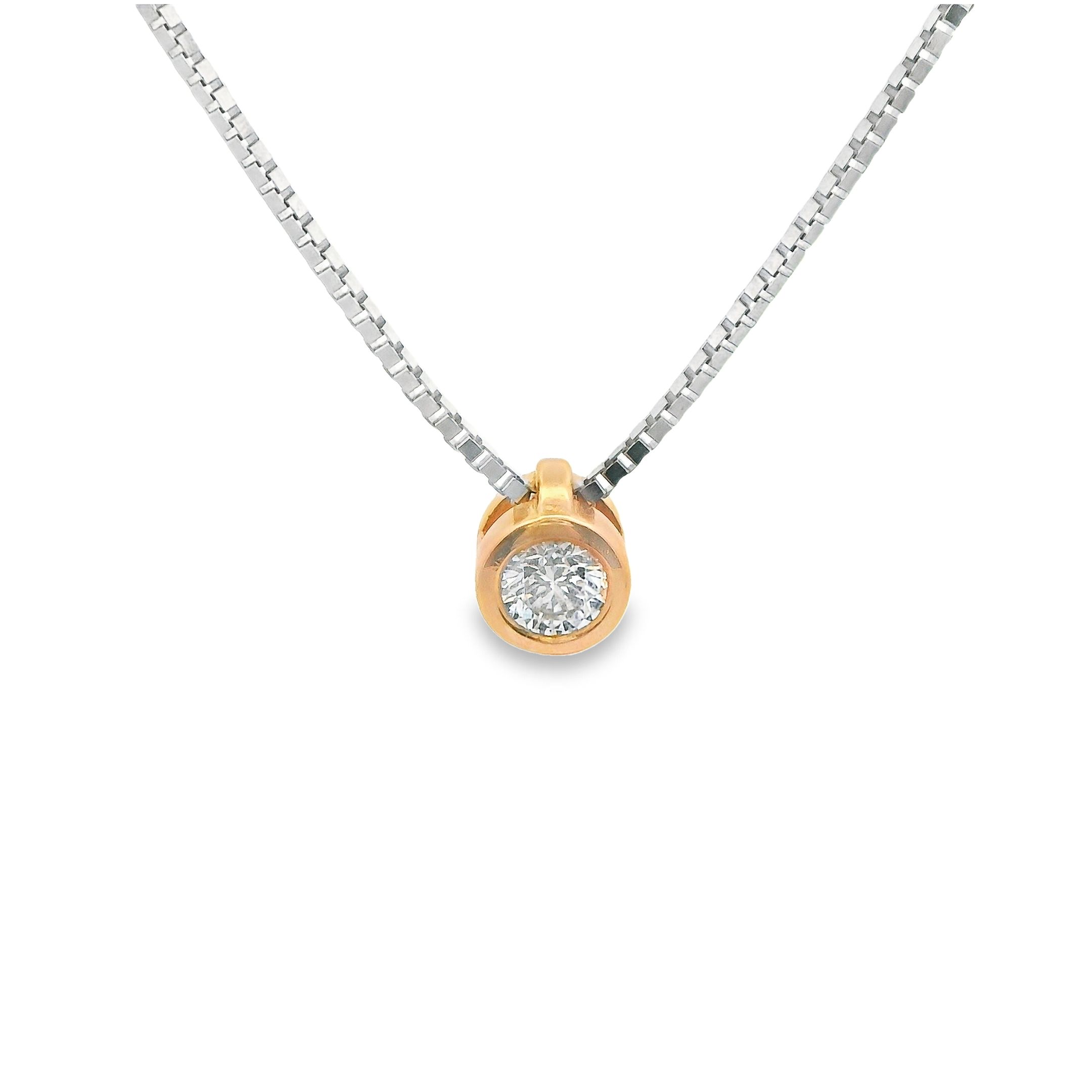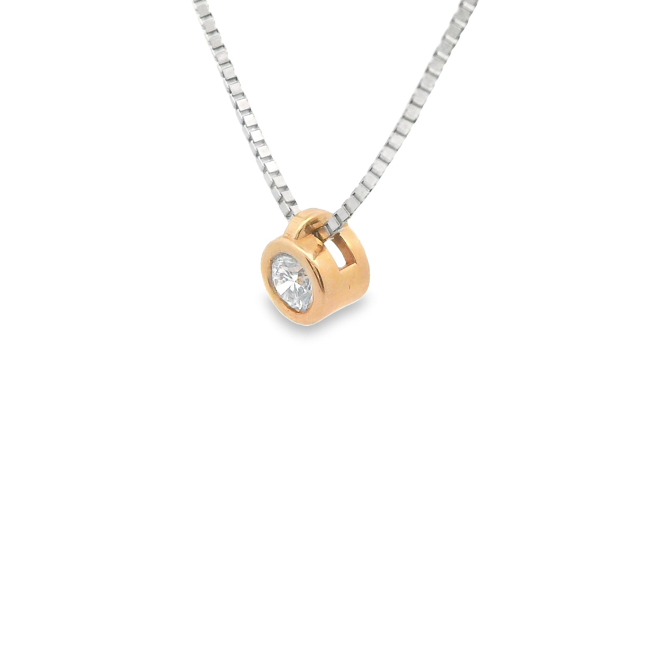 Deze hanger (met collier) van Louis Bros is vervaardigd uit 14 karaat roségoud (2.73 gr.) en is gezet met 1 briljant geslepen diamanten met een totaalgewicht van 0.15 ct. De hanger heeft een diameter van 3.5 mm en een dikte van 2.5 mm.