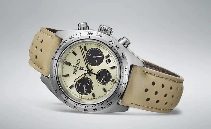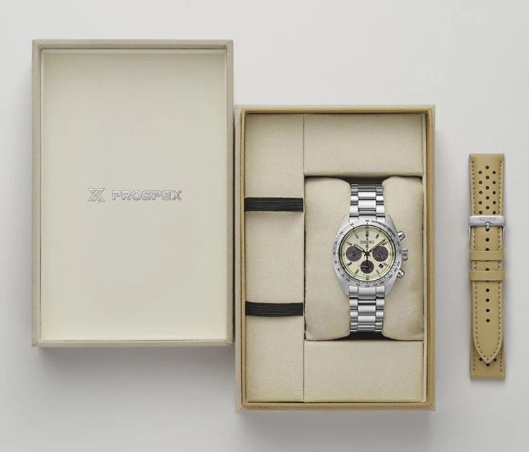 De Seiko Prospex SSC959P1 Limited Edition Speedtimer Solar Motoring chronograaf is een exclusieve European Limited Edition 2025, waarvan slechts 2.700 stuks verkrijgbaar zijn, uitsluitend in Europa. Dit model is geïnspireerd op de elegantie van klassieke Europese sportwagens en combineert vintage charme met moderne technologie. Onder het gebogen saffierglas bevindt zich een crèmekleurige wijzerplaat met een subtiel zonnestraalpatroon, dat de luxe uitstraling van klassieke auto-interieurs oproept. De zwarte subdials zorgen voor een krachtig contrast en verwijzen naar het geliefde ‘Panda’-ontwerp van de eerdere SSC813. Het horloge wordt geleverd met een extra lichtbruine geperforeerde leren band, geïnspireerd op de stijlvolle lederen bekleding van historische sportauto’s. De Speedtimer SSC959 wordt aangedreven door het Seiko kaliber V192, een betrouwbaar solar-uurwerk dat zowel natuurlijk als kunstmatig licht gebruikt om op te laden. Volledig opgeladen heeft het horloge een gangreserve van ongeveer zes maanden en een nauwkeurigheid van ±15 seconden per maand. De chronograaffunctie meet verstreken tijd tot zestig minuten in stappen van een vijfde seconde en biedt daarnaast een datumweergave, power reserve-indicator, 24-uurswijzer, kleine secondewijzer en overlaadbeveiliging. De roestvrijstalen kast heeft een diameter van 39 millimeter, een dikte van 13,3 millimeter en een lug-to-lug lengte van 45,5 millimeter. Het gebogen saffierglas met anti-reflecterende coating aan de binnenzijde garandeert uitstekende leesbaarheid, terwijl LumiBrite op wijzers en indexen zorgt voor helderheid in het donker. De kast is waterdicht tot 10 ATM en uitgerust met een schroefdeksel waarop “Limited Edition” en een uniek serienummer zijn gegraveerd. Een tachymeterfunctie maakt het ontwerp compleet.