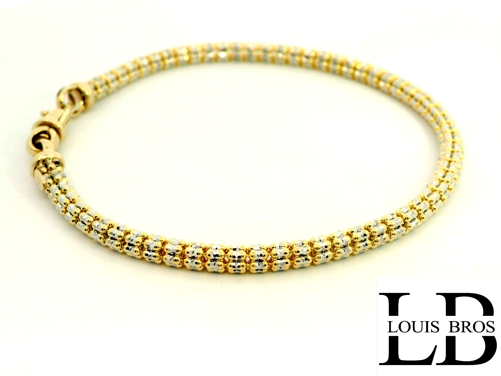 Deze elegante armband van 14 karaat goud (9.79 gr) is een verfijnde toevoeging aan elke sieradencollectie. De armband is uitgevoerd in een bicolor ontwerp, waarbij geelgoud en witgoud harmonieus samenkomen voor een tijdloze en veelzijdige uitstraling. Het fijne vlechtpatroon van de schakels geeft het sieraad een luxe textuur en een subtiele schittering bij elke beweging.