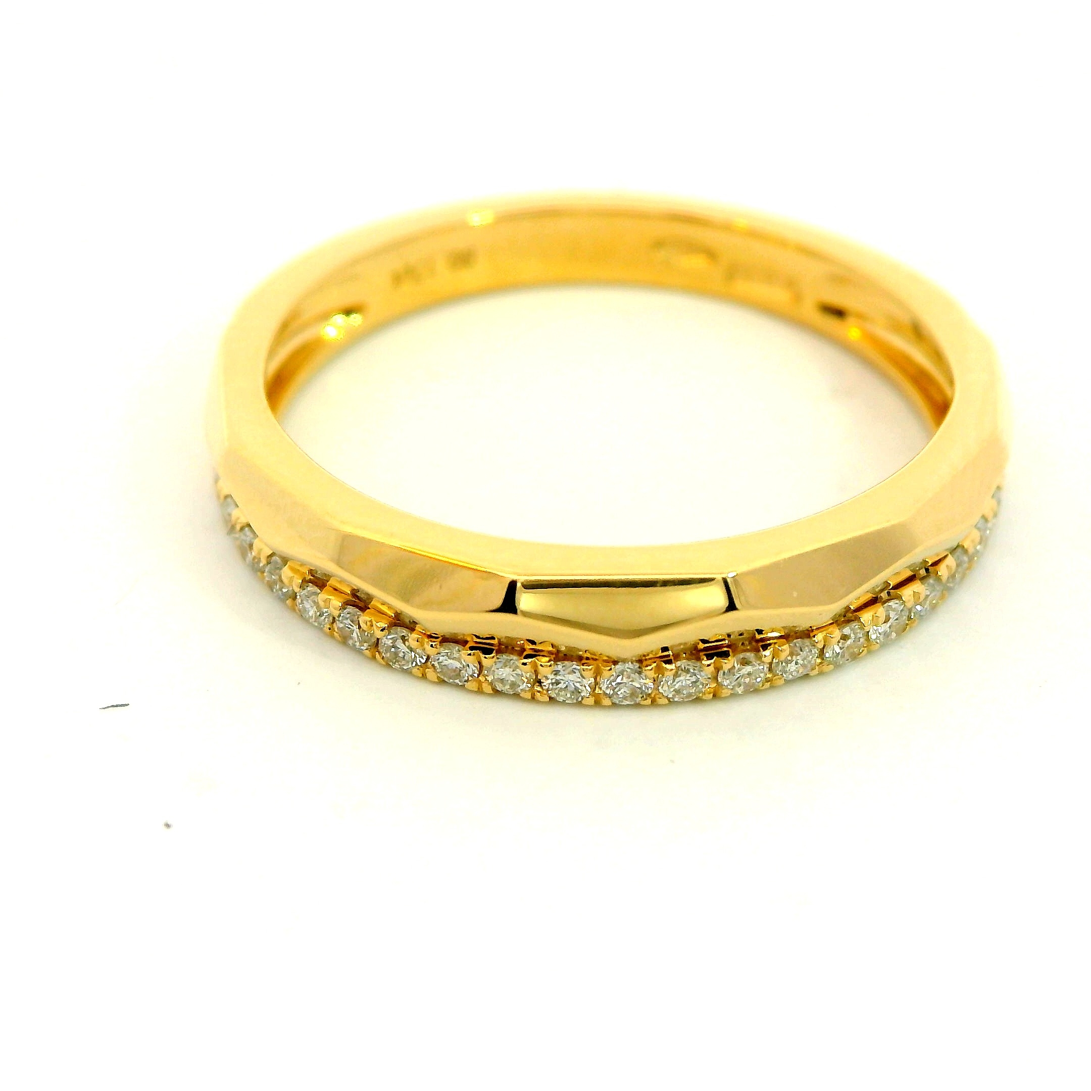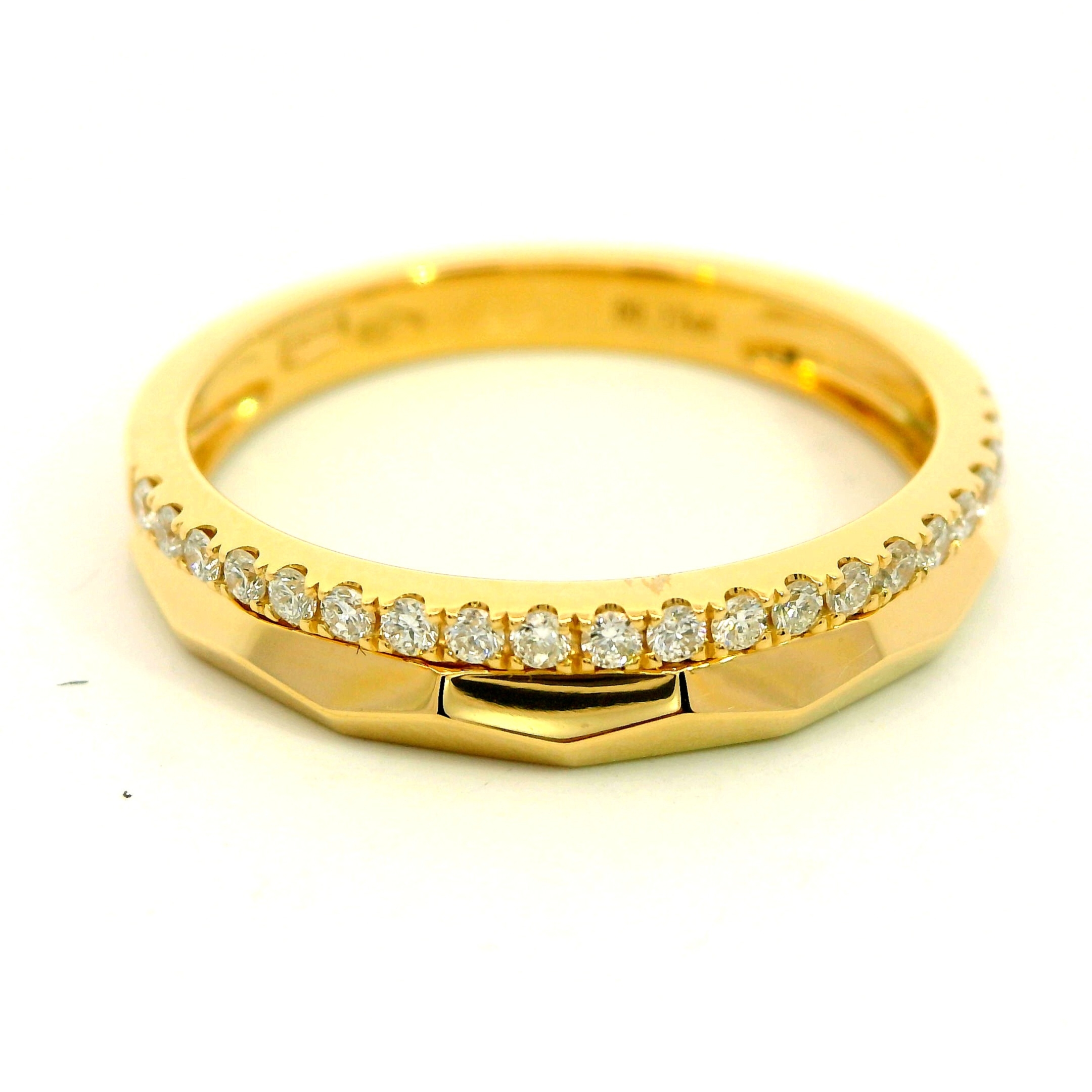 Deze verfijnde 18 karaat geelgouden ring (3.24 gr) straalt pure elegantie uit. Met haar subtiele ontwerp en delicate lijnen is ze een sieraad dat opvalt door haar eenvoud en klasse. De schitterende diamanten voegen een vleugje luxe toe, zonder te overdrijven – perfect voor wie houdt van ingetogen glamour.