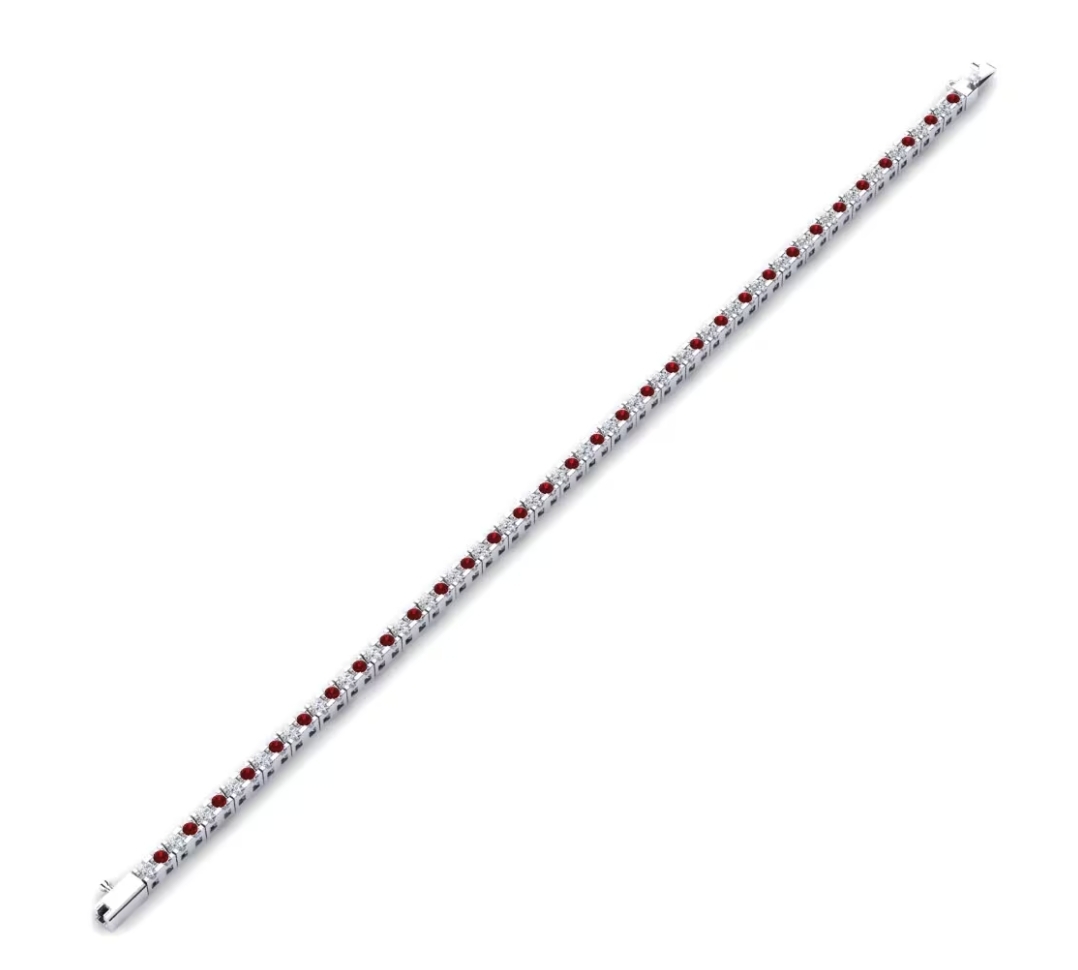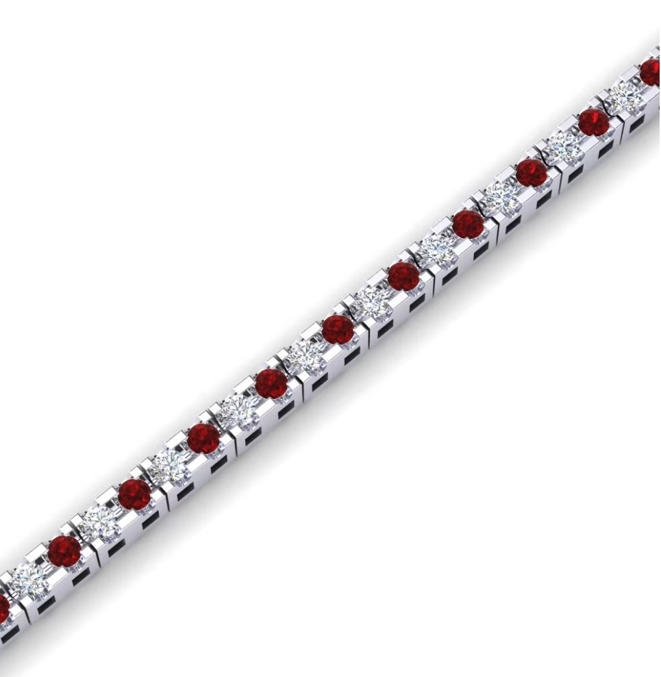 Deze tennisarmband van Louis Bros is vervaardigd uit 14 karaat witgoud (7.09 gr.) en is gezet met 38 briljant geslepen diamanten met een totaalgewicht van 1.26 ct en 38 robijn met een totaalgewicht van 1.41ct .De armband heeft een lengte van 19 cm. En een breedte van 2.16 mm.