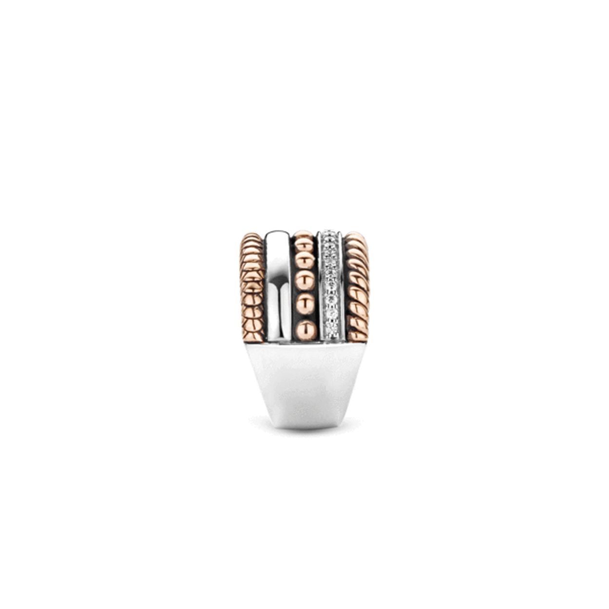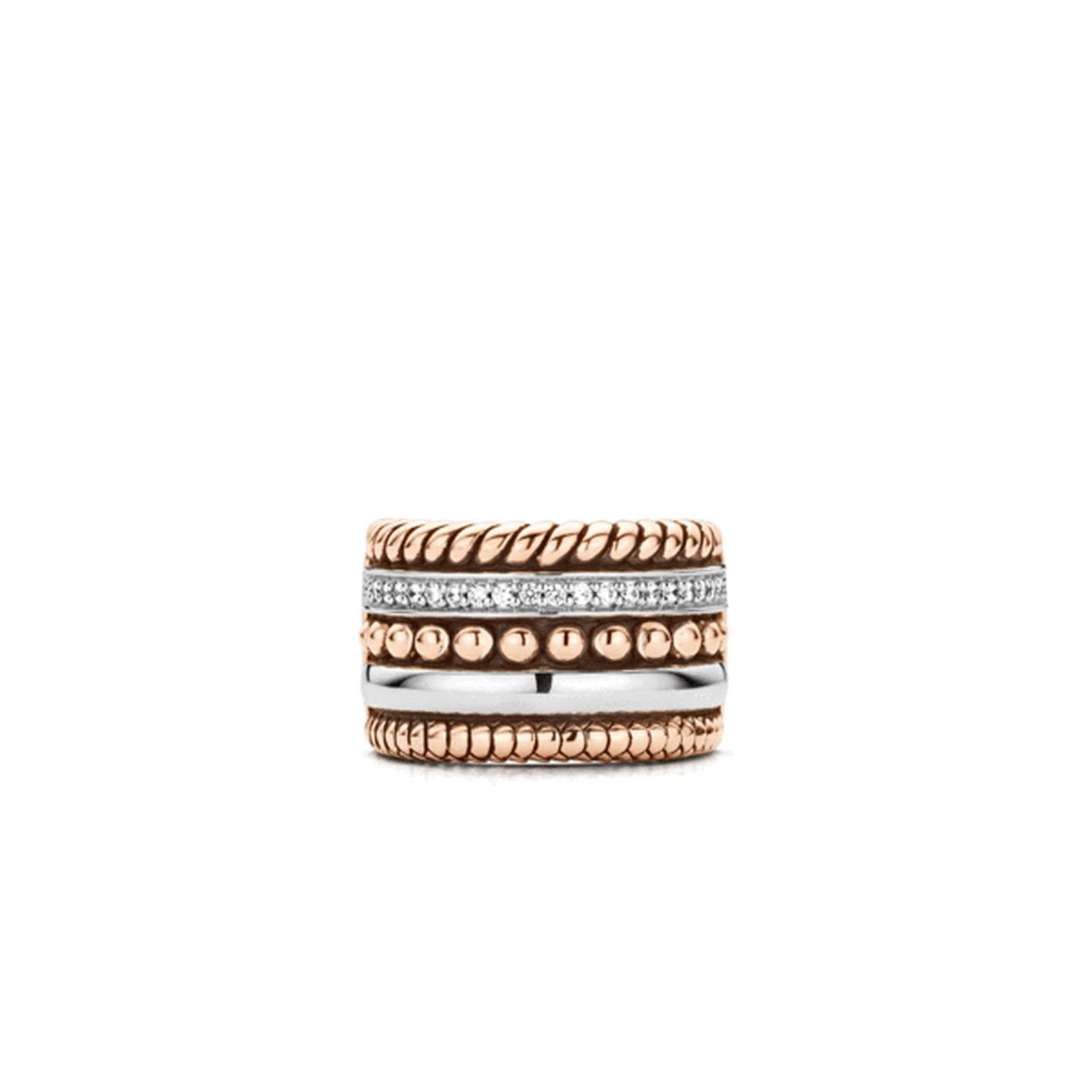 Ge�nspireerd op verschillende aanschuifringen uit de TI SENTO - Milano collectie zijn meerdere designs gecombineerd in ��n ring. De verschillende structuren zijn afgewerkt met een 18 karaats ros�gouden laag. Dit maakt deze ring tot een van de populairste lijnen uit de TI SENTO collectie. De ring is gemaakt van gerhodineerd sterling zilver en is gezet met zirkonia's.