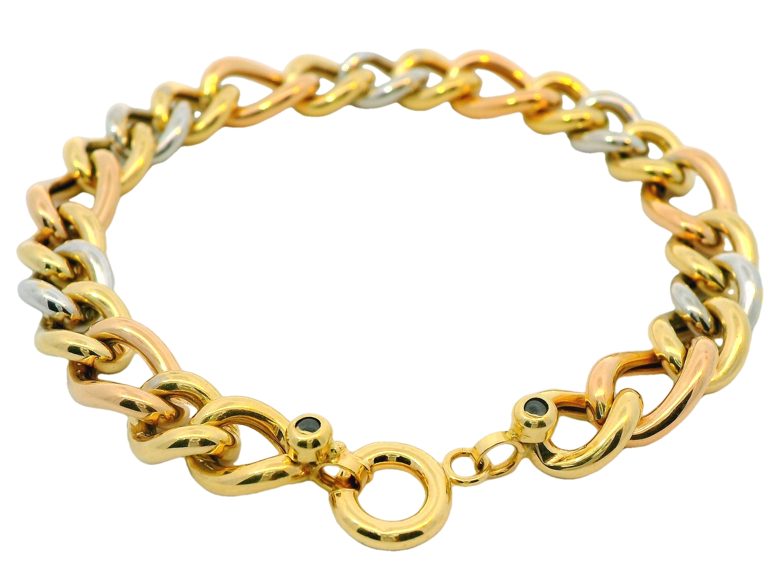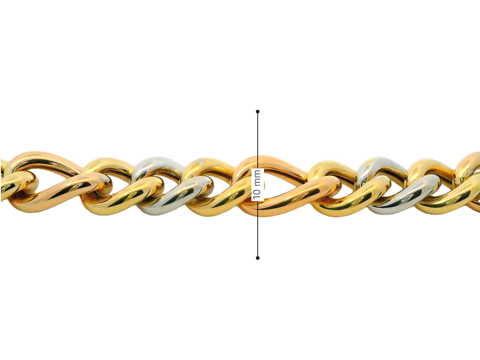 Deze prachtige tricolor armband voor dames combineert elegantie met moderniteit. Gemaakt van geelgoud, witgoud en roségoud, straalt de armband luxe en veelzijdigheid uit. De schakels vloeien soepel in elkaar over, waardoor het sieraad een dynamische en speelse uitstraling krijgt. Perfect voor elke gelegenheid, voegt deze unieke armband een vleugje verfijning toe aan elke outfit, terwijl de mix van gouden tinten tijdloos en stijlvol blijft.