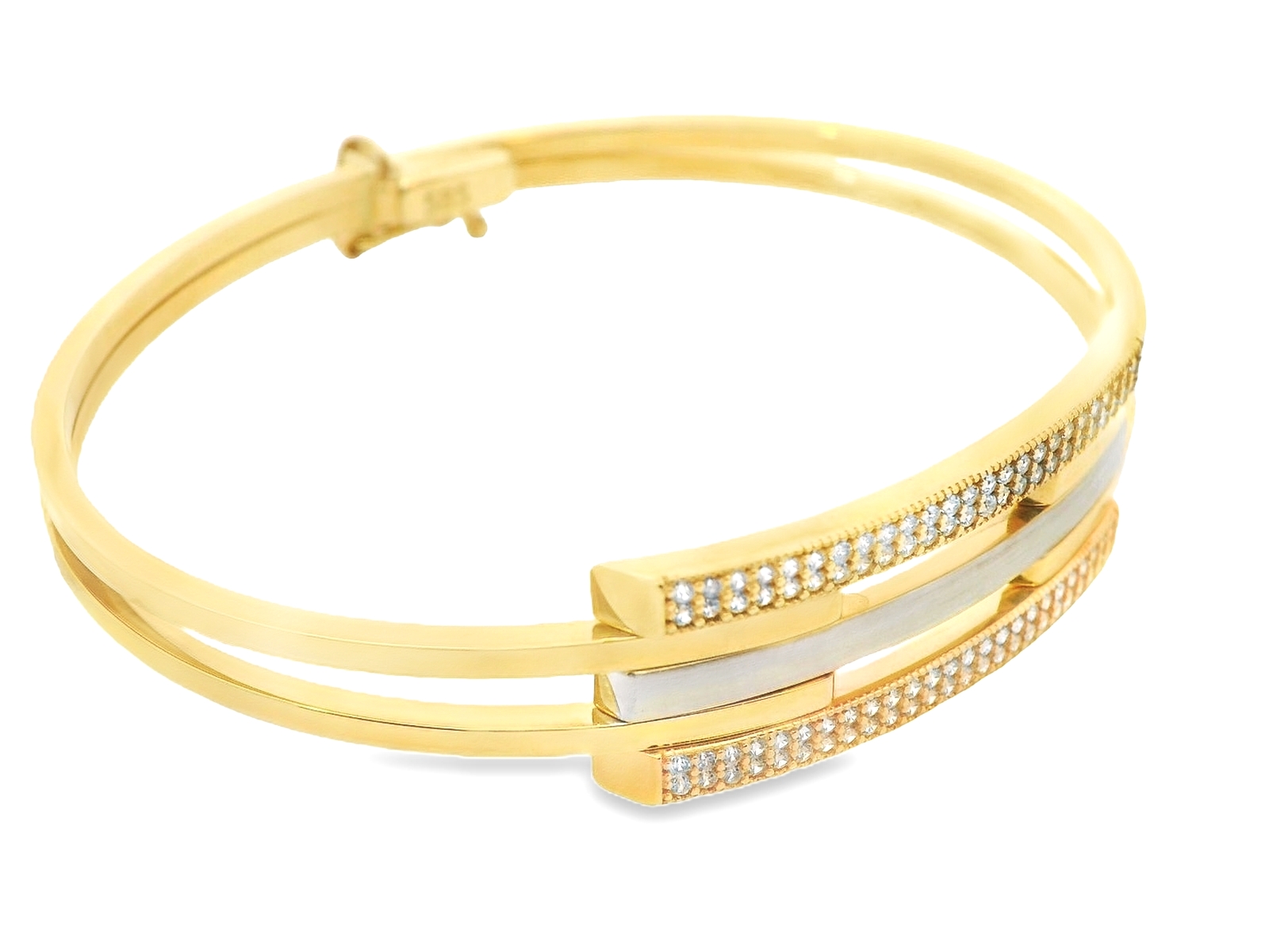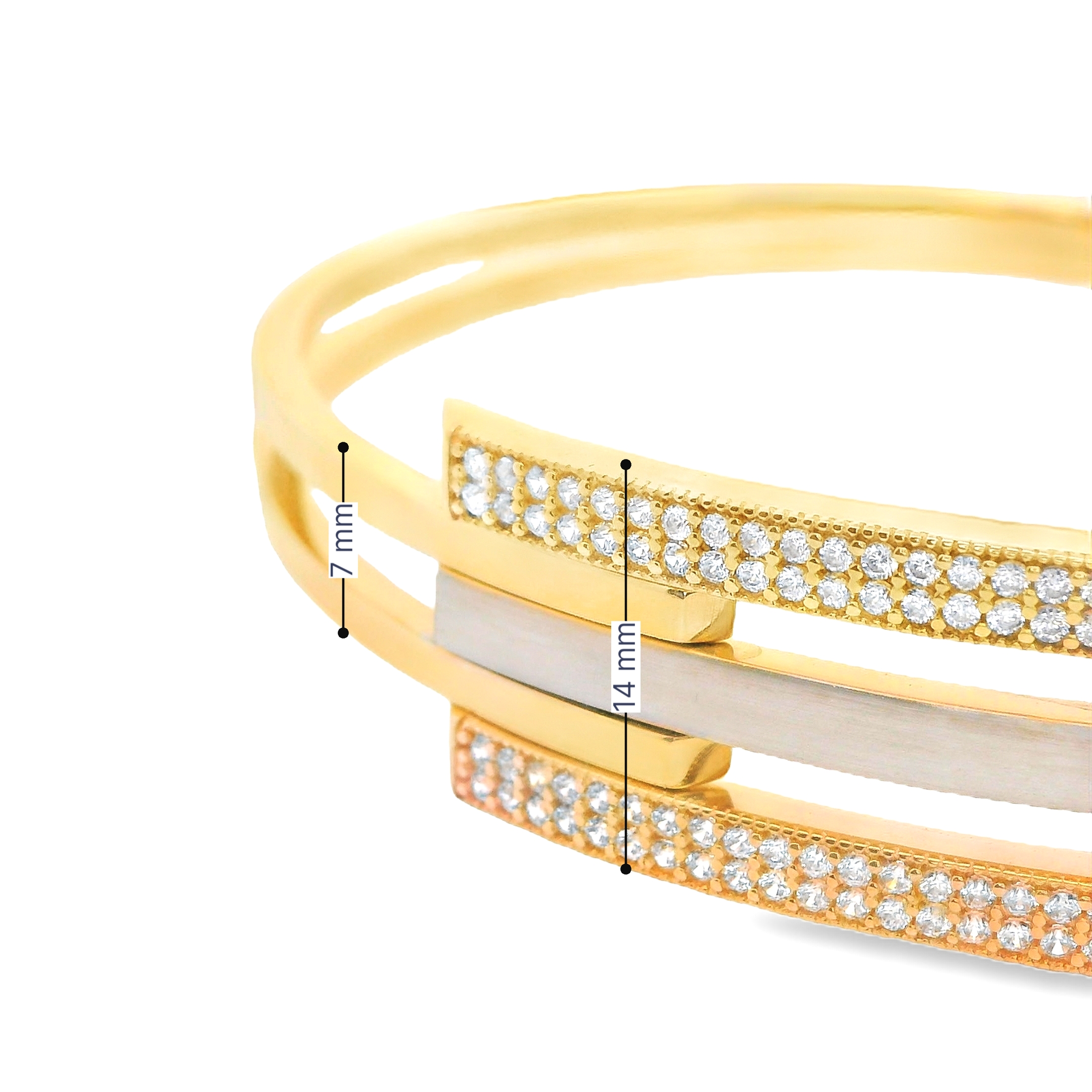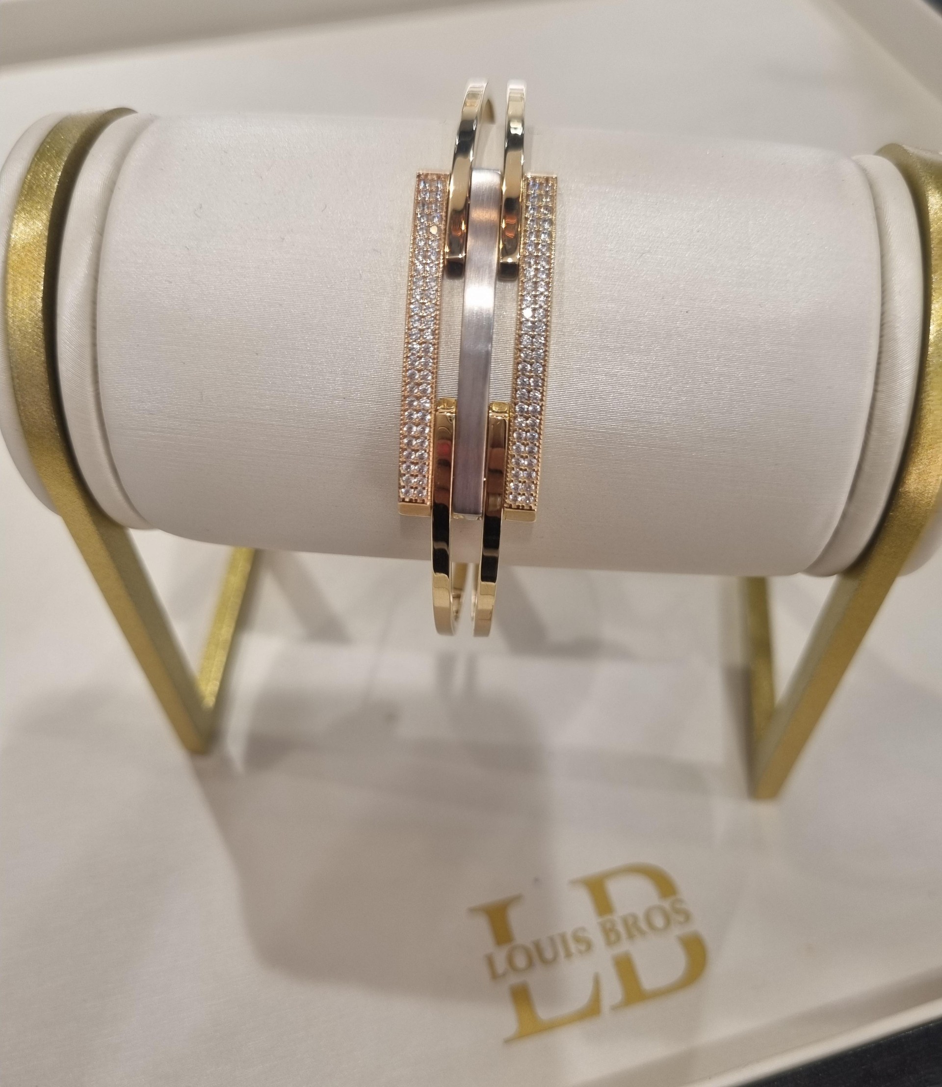 Deze exclusieve armband van Louis Bros is vervaardigd uit 14 karaat tricolor (8.50 gr.). Deze armband met fantasie design en zirkonia is een opvallend en stijlvol sieraad. De combinatie van geelgoud, witgoud en roségoud geeft de armband een unieke en veelzijdige uitstraling. Het fantasie design zorgt voor een artistiek en eigentijds karakter, terwijl de fonkelende zirkonia's een vleugje glamour en schittering toevoegen. Deze prachtige armband is perfect om elke outfit te verfraaien en is geschikt voor zowel dagelijkse draag als speciale gelegenheden. Een tricolor gouden armband met fantasie design en zirkonia is een elegant en veelzijdig juweel dat zeker de aandacht trekt.
