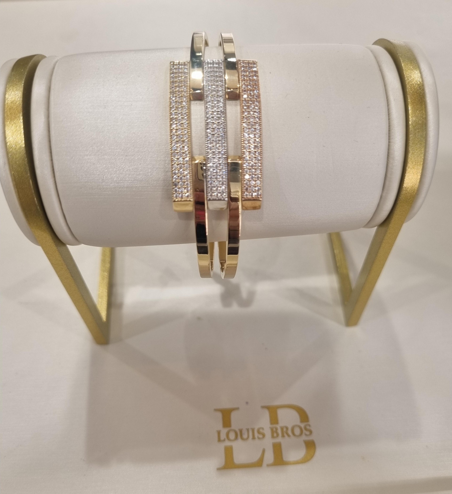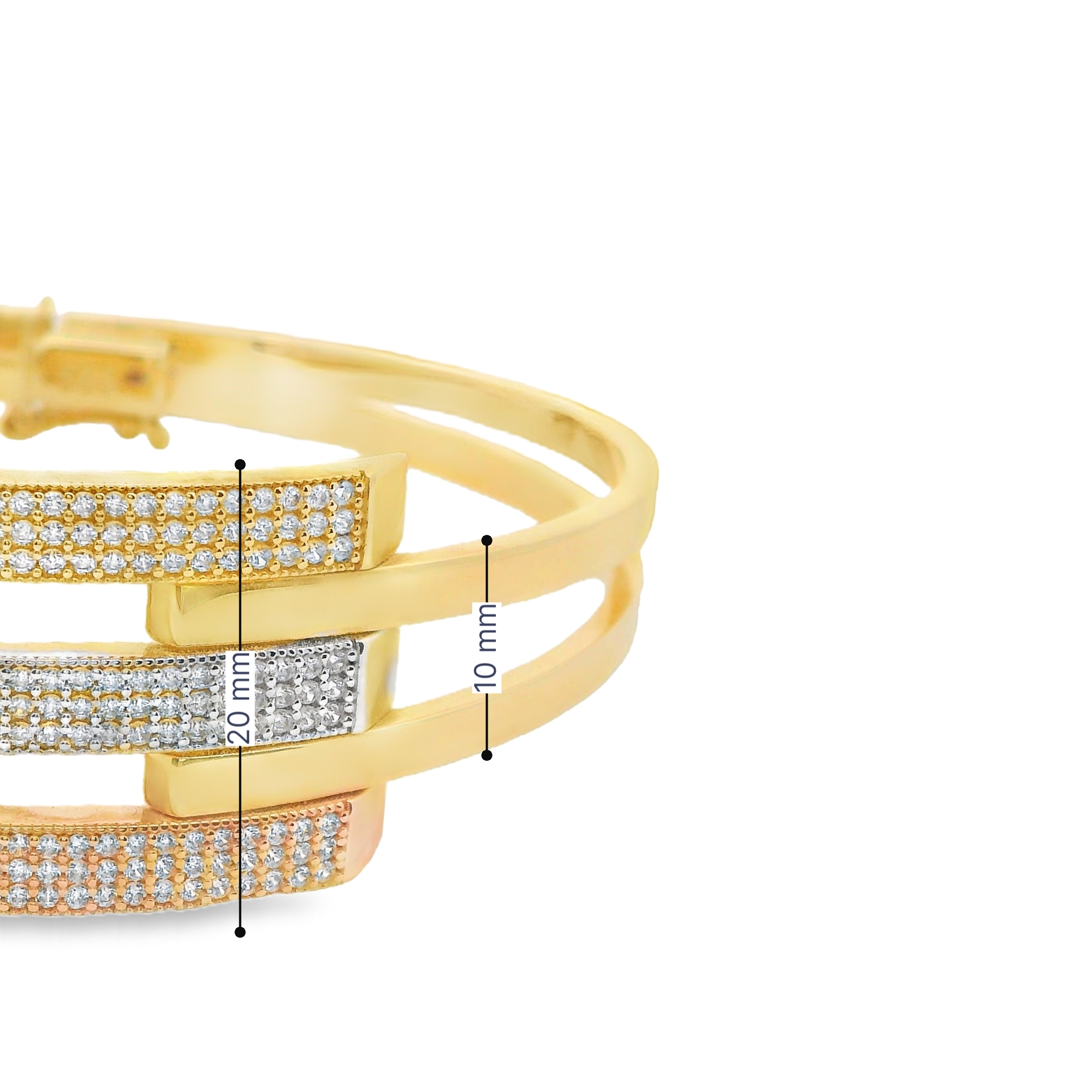 Deze exclusieve armband van Louis Bros is vervaardigd uit 14 karaat tricolor (12.64 gr.). Deze armband met fantasie design en zirkonia is een opvallend en stijlvol sieraad. De combinatie van geelgoud, witgoud en roségoud geeft de armband een unieke en veelzijdige uitstraling. Het fantasie design zorgt voor een artistiek en eigentijds karakter, terwijl de fonkelende zirkonia's een vleugje glamour en schittering toevoegen. Deze prachtige armband is perfect om elke outfit te verfraaien en is geschikt voor zowel dagelijkse draag als speciale gelegenheden. Een tricolor gouden armband met fantasie design en zirkonia is een elegant en veelzijdig juweel dat zeker de aandacht trekt.