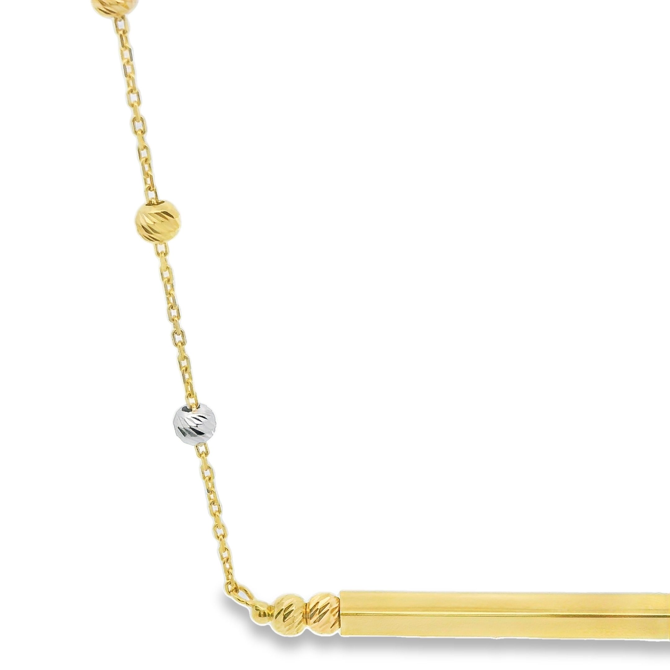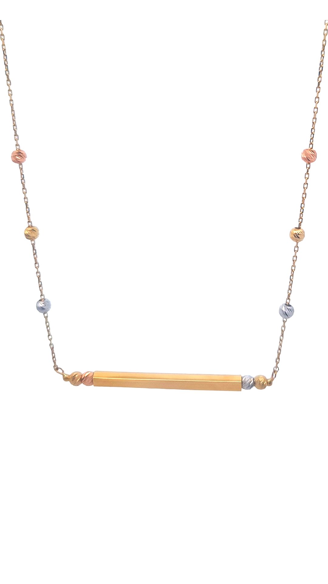 Dit verfijnde tricolor gouden collier is een prachtig sieraad dat elegantie en moderniteit perfect combineert. Het collier bestaat uit geel-, wit- en roodgoud, waardoor het een veelzijdige en opvallende uitstraling heeft. In het midden van het collier prijkt een stijlvol stafje, dat het geheel een eigentijdse en minimalistische touch geeft. Ideaal voor zowel dagelijks gebruik als speciale gelegenheden, dit collier voegt een vleugje luxe toe aan elke outfit.