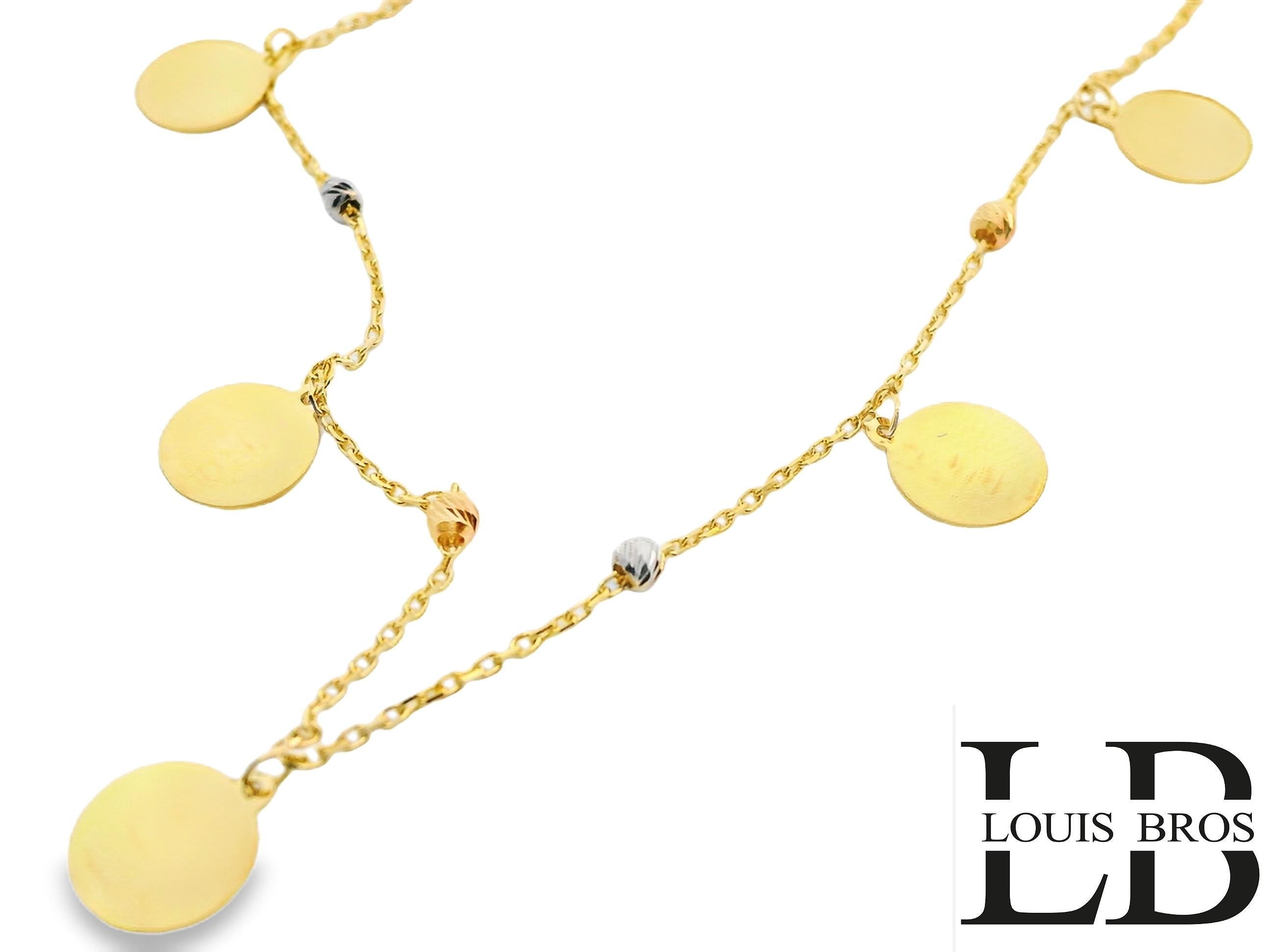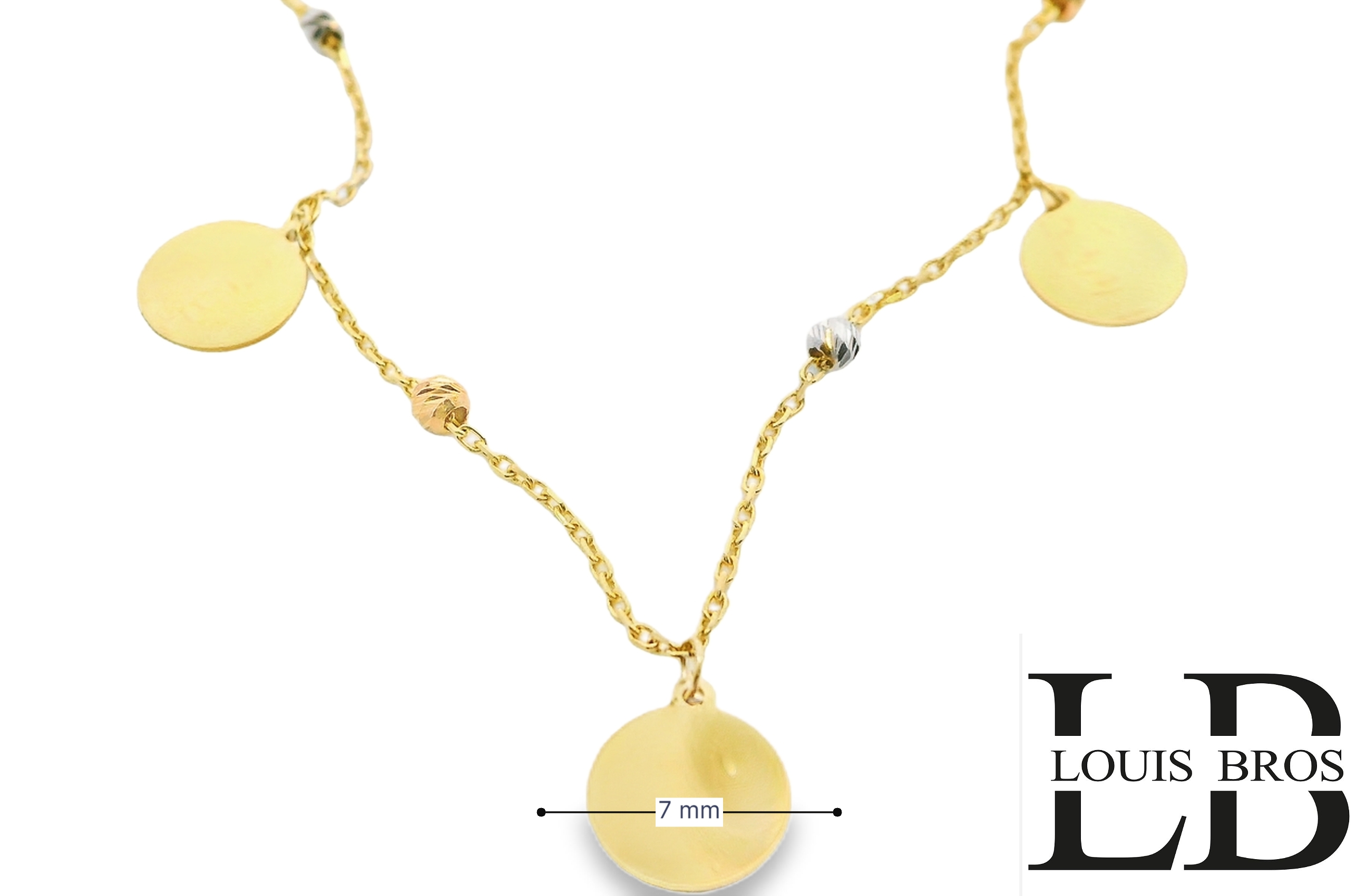 Dit prachtige 14-karaats tricolor gouden collier (3.35 gr) is een schitterende toevoeging aan elke sieradencollectie. De fijne geelgouden schakelketting is verfraaid met speelse hangers, die symbool staan voor hoop en dromen.