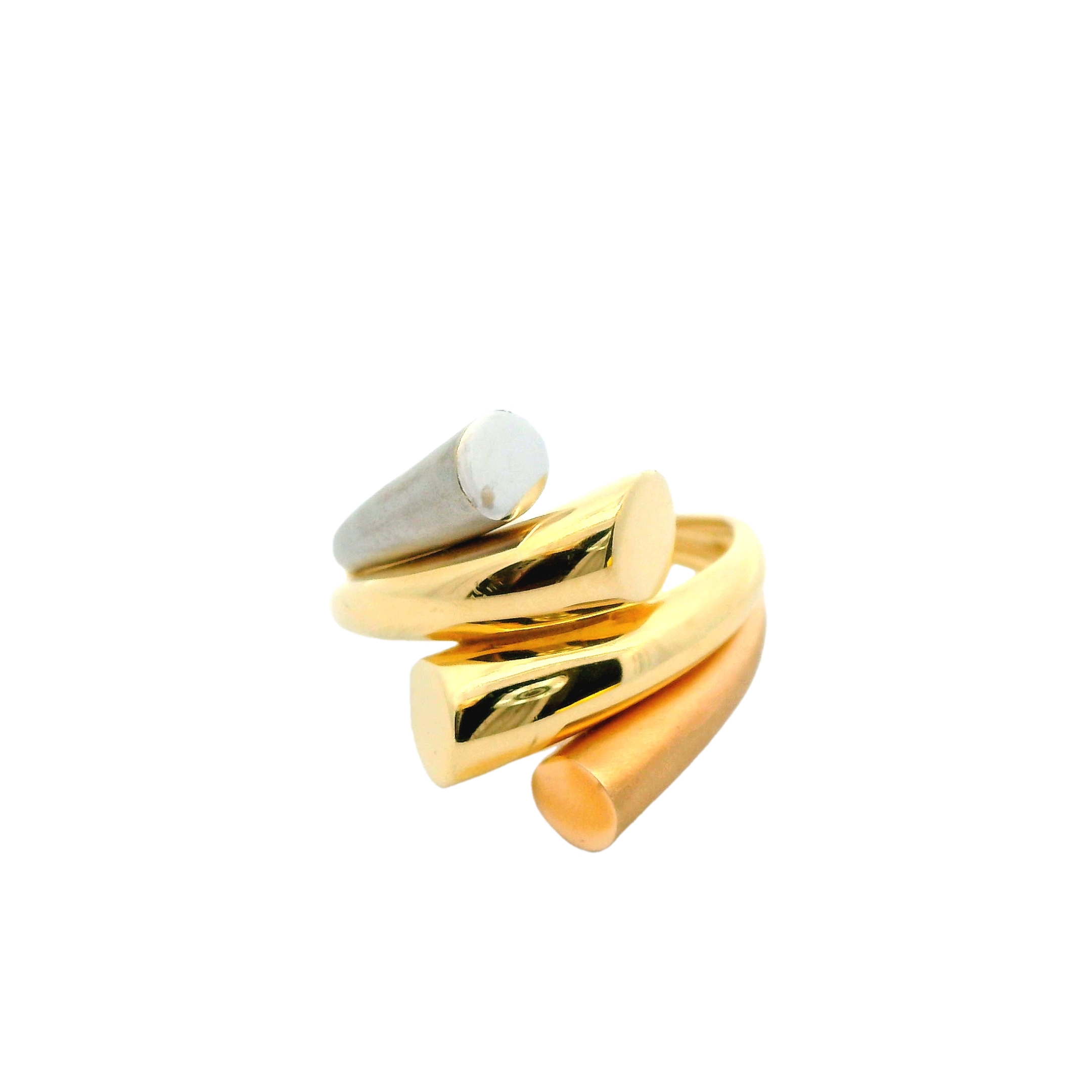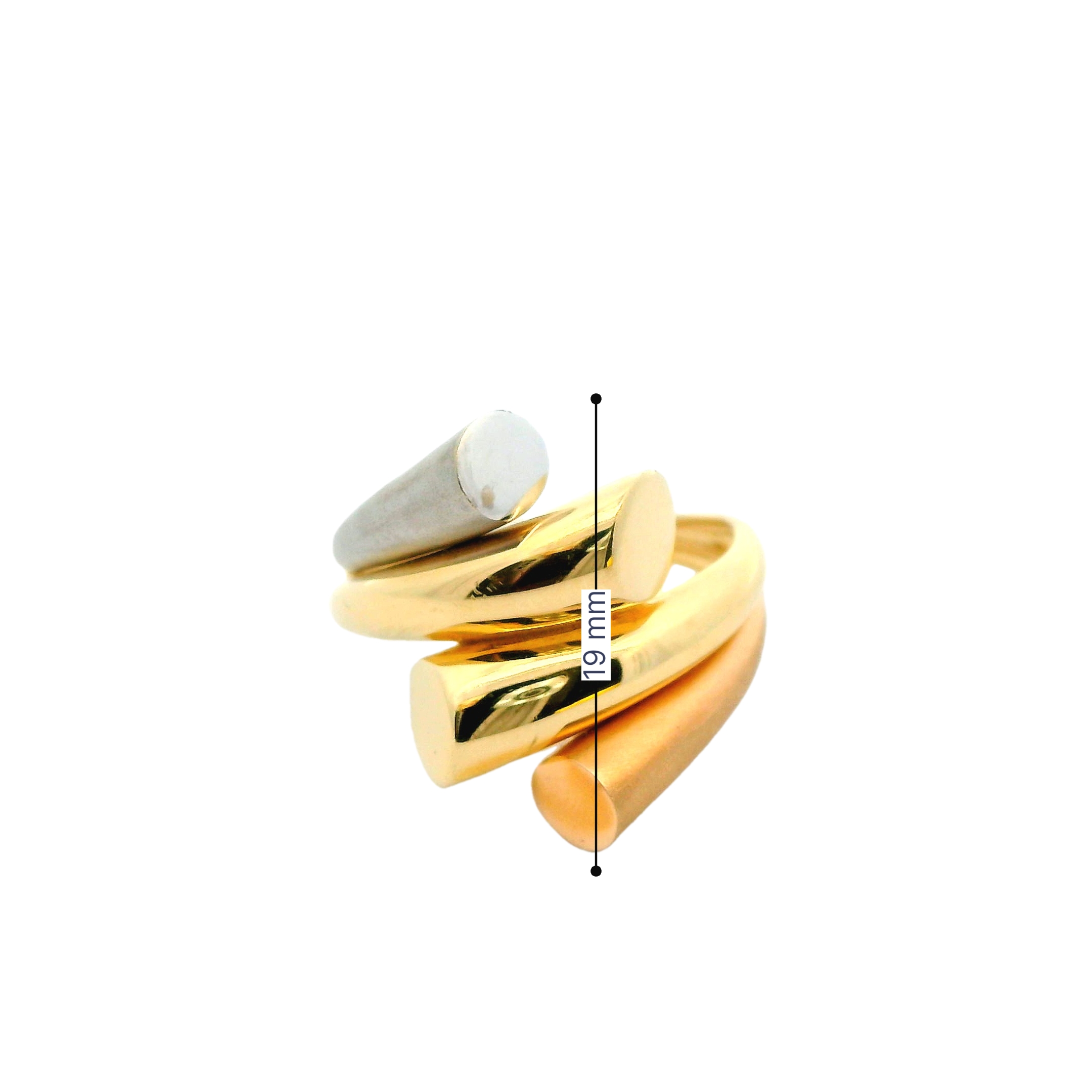 Deze ring met een mooi design is een elegante keuze voor iedereen die houdt van verfijnde sieraden. Deze bijzondere ring combineert drie soorten goud - geel, wit en roségoud - tot een harmonieuze en stijlvolle creatie. Het unieke ontwerp speelt met kleuren en materialen, waardoor de ring een opvallend en tijdloos sieraad wordt. Ideaal voor speciale gelegenheden of als dagelijks accessoire, voegt deze tricolor gouden ring een vleugje luxe toe aan elke outfit.