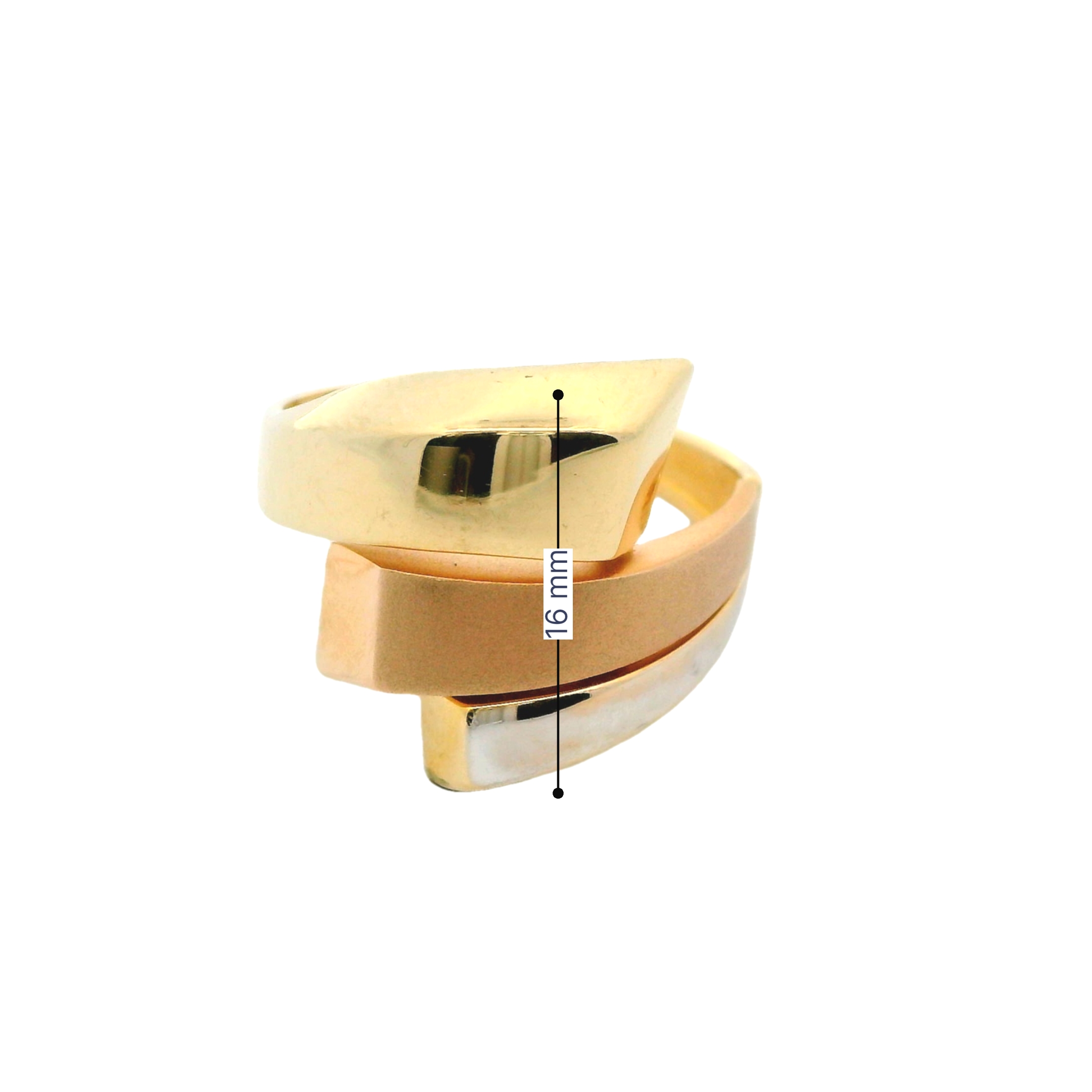 Deze ring met een mooi design is een elegante keuze voor iedereen die houdt van verfijnde sieraden. Deze bijzondere ring combineert drie soorten goud - geel, wit en roségoud - tot een harmonieuze en stijlvolle creatie. Het unieke ontwerp speelt met kleuren en materialen, waardoor de ring een opvallend en tijdloos sieraad wordt. Ideaal voor speciale gelegenheden of als dagelijks accessoire, voegt deze tricolor gouden ring een vleugje luxe toe aan elke outfit.