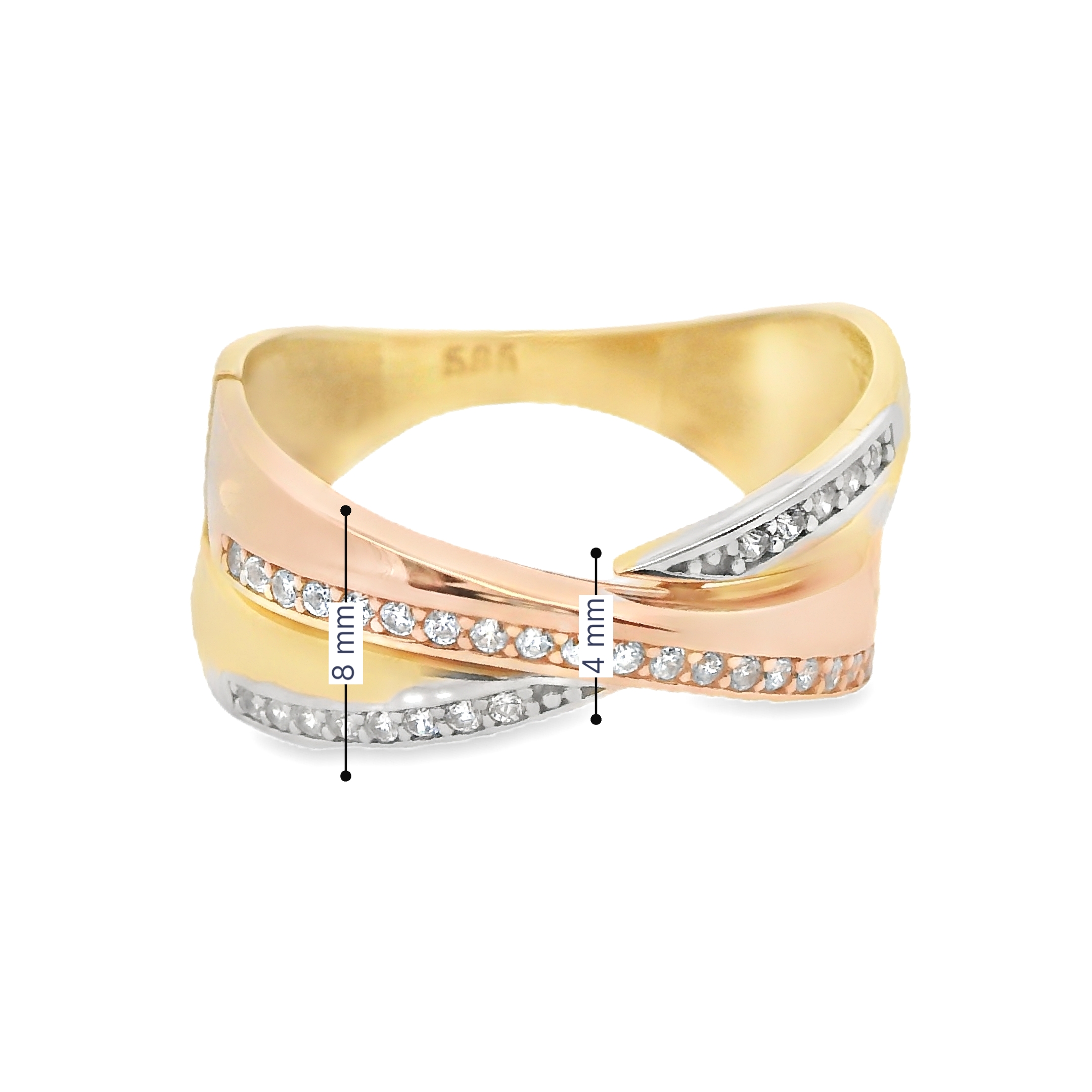 Deze ring straalt elegantie en verfijning uit met zijn unieke combinatie van geel, wit en roségoud. Deze schitterende ring, versierd met sprankelende zirkonia's, vangt het licht op een betoverende manier en voegt een vleugje glamour toe aan elke outfit. Het verfijnde design van de ring accentueert de verschillende kleuren goud en creëert een harmonieus en stijlvol geheel. Ideaal voor speciale gelegenheden of als dagelijks statementstuk, deze tricolor gouden ring is een tijdloos sieraad dat elke drager een gevoel van luxe en klasse biedt.