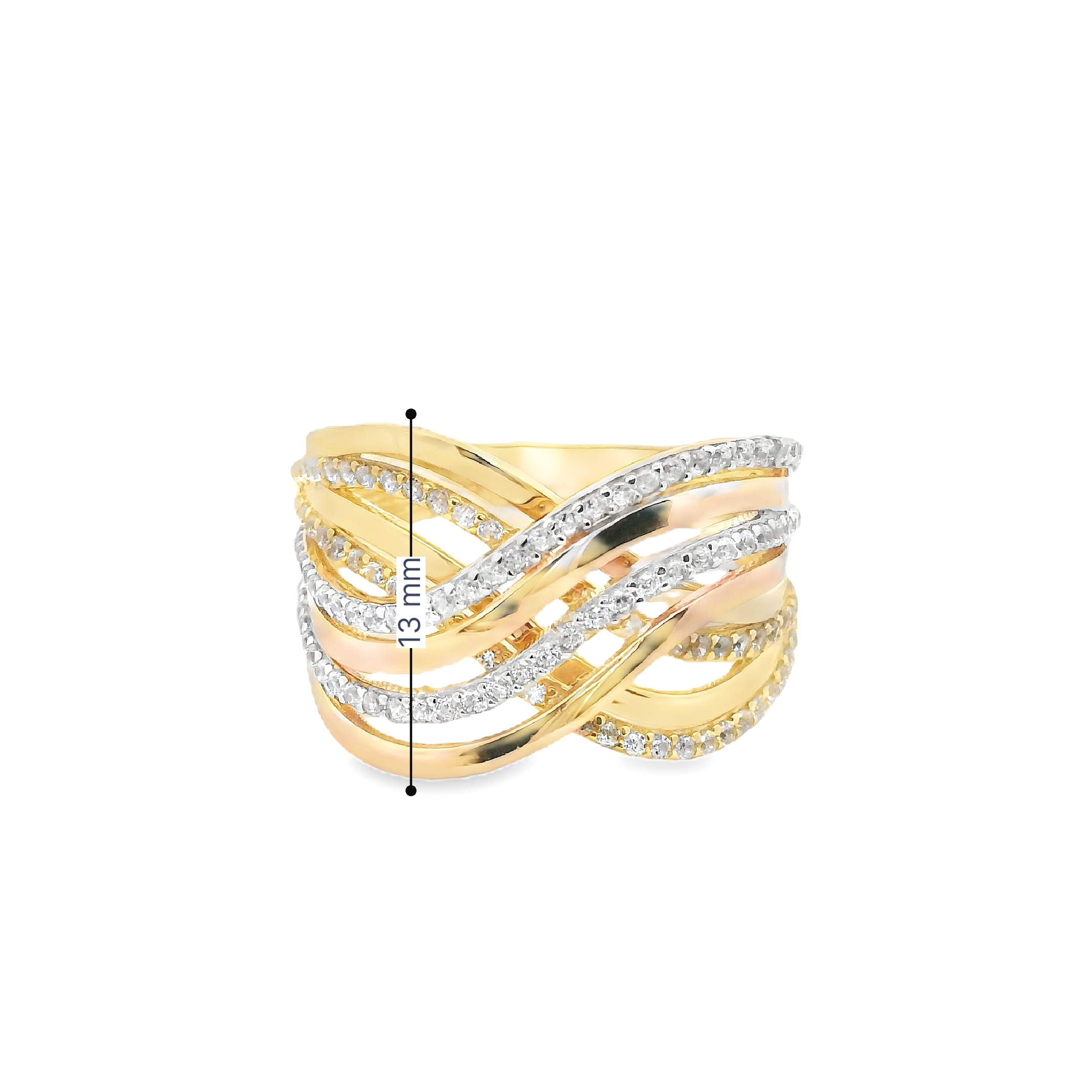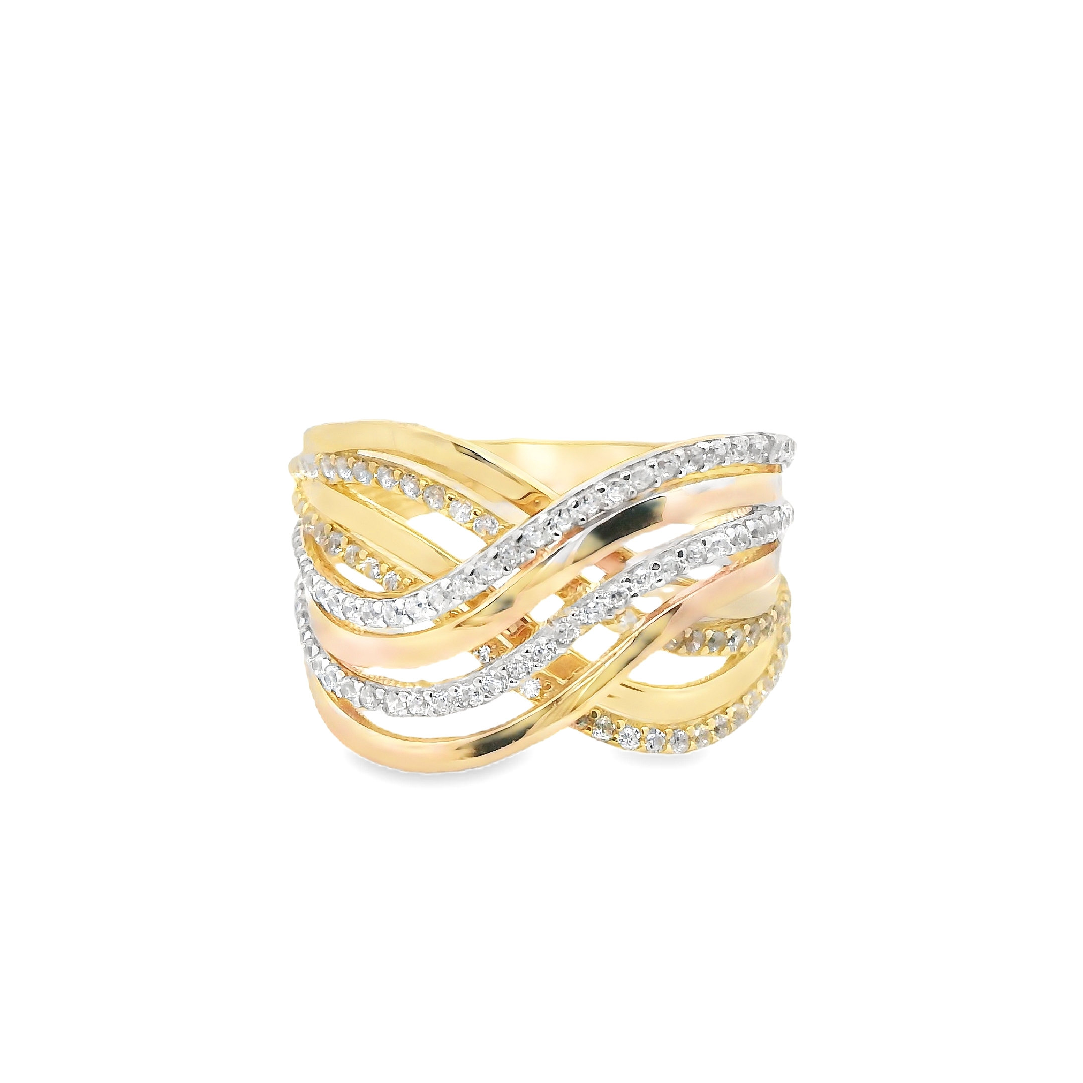 Deze ring straalt elegantie en verfijning uit met zijn unieke combinatie van geel, wit en roségoud. Deze schitterende ring, versierd met sprankelende zirkonia's, vangt het licht op een betoverende manier en voegt een vleugje glamour toe aan elke outfit. Het verfijnde design van de ring accentueert de verschillende kleuren goud en creëert een harmonieus en stijlvol geheel. Ideaal voor speciale gelegenheden of als dagelijks statementstuk, deze tricolor gouden ring is een tijdloos sieraad dat elke drager een gevoel van luxe en klasse biedt.