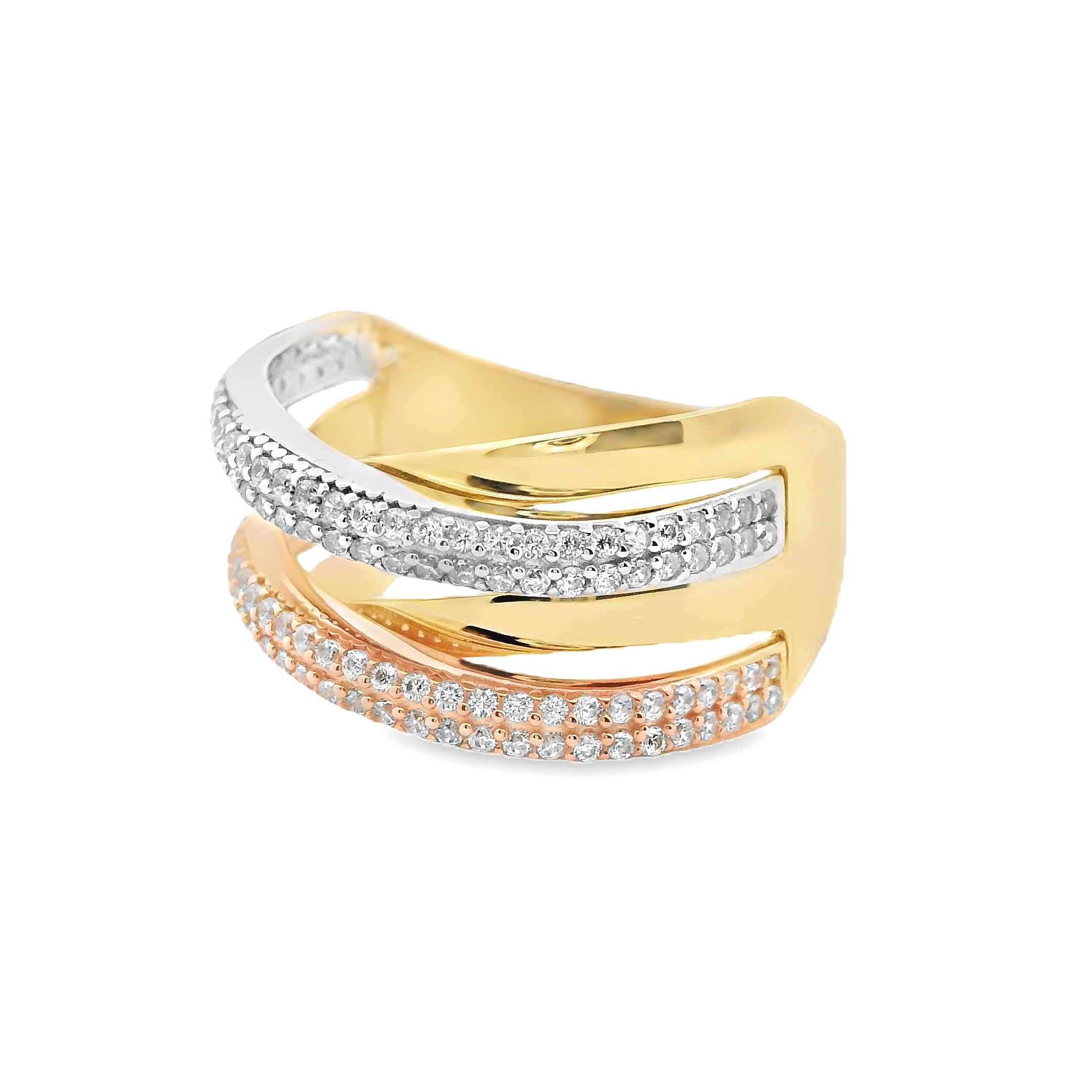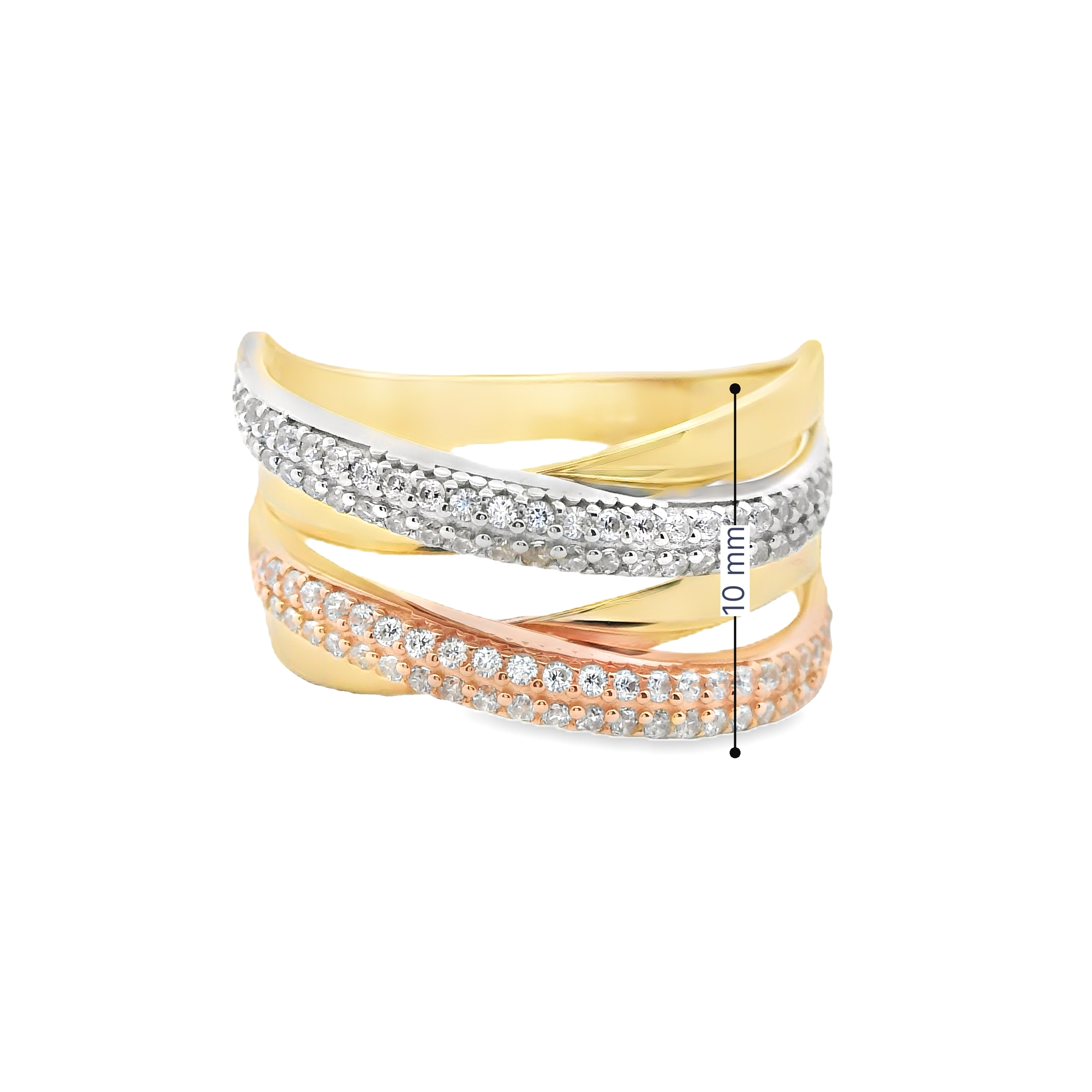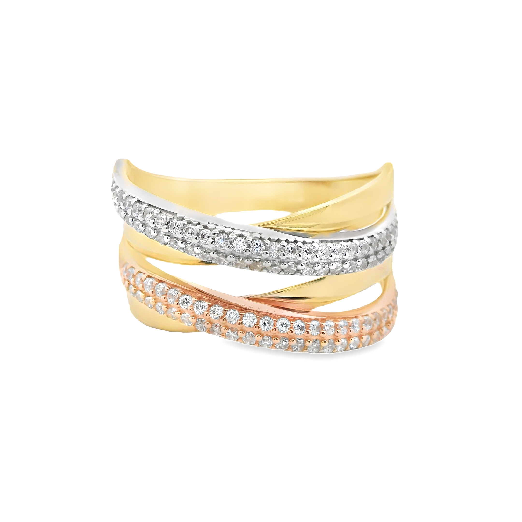 Deze ring straalt elegantie en verfijning uit met zijn unieke combinatie van geel, wit en roségoud. Deze schitterende ring, versierd met sprankelende zirkonia's, vangt het licht op een betoverende manier en voegt een vleugje glamour toe aan elke outfit. Het verfijnde design van de ring accentueert de verschillende kleuren goud en creëert een harmonieus en stijlvol geheel. Ideaal voor speciale gelegenheden of als dagelijks statementstuk, deze tricolor gouden ring is een tijdloos sieraad dat elke drager een gevoel van luxe en klasse biedt.