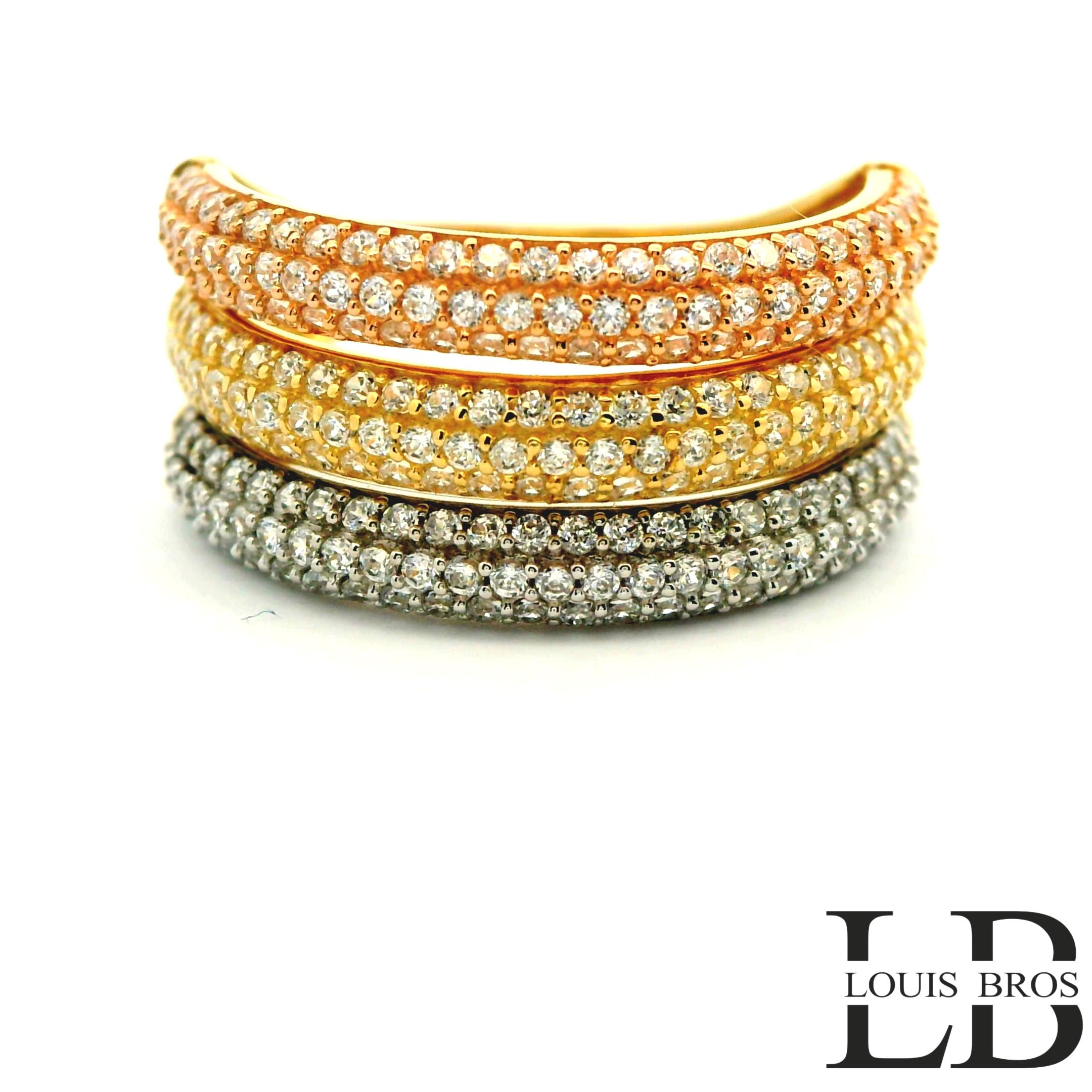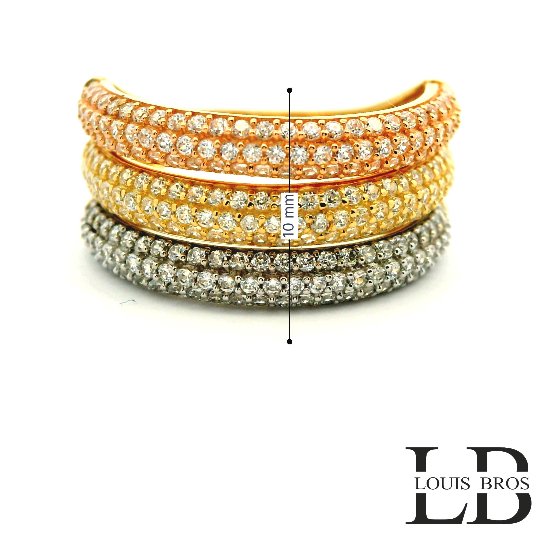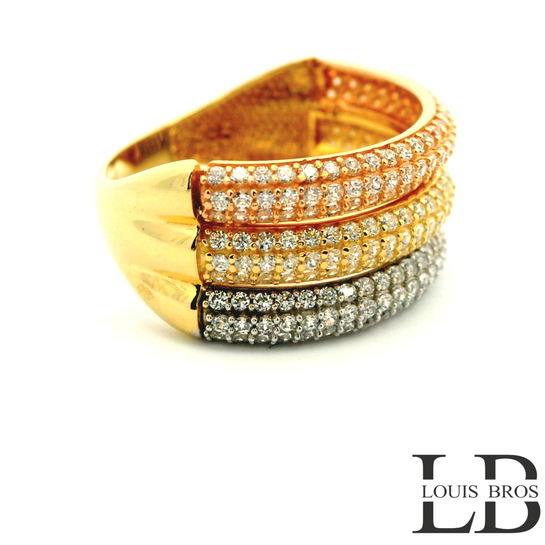 Deze schitterende ring is vervaardigd uit 14 karaat tricolor goud (3.65 gr), waarbij geel-, wit- en rosegoud op elegante wijze samenkomen. Het speelse kleurenspel geeft de ring een unieke en luxe uitstraling. De ring is verder verrijkt met fonkelende zirkonia’s, die zorgen voor een sprankelende schittering bij iedere beweging.