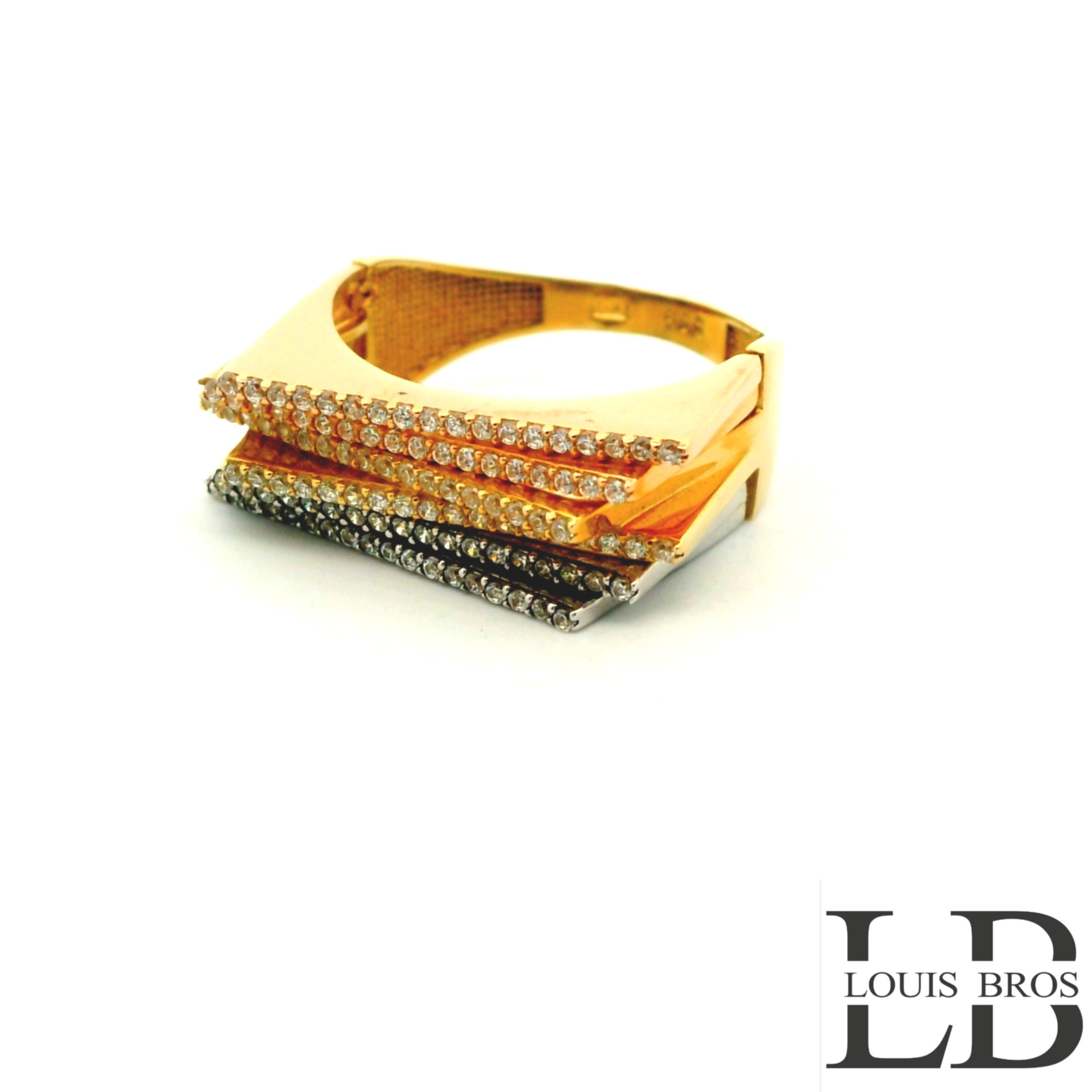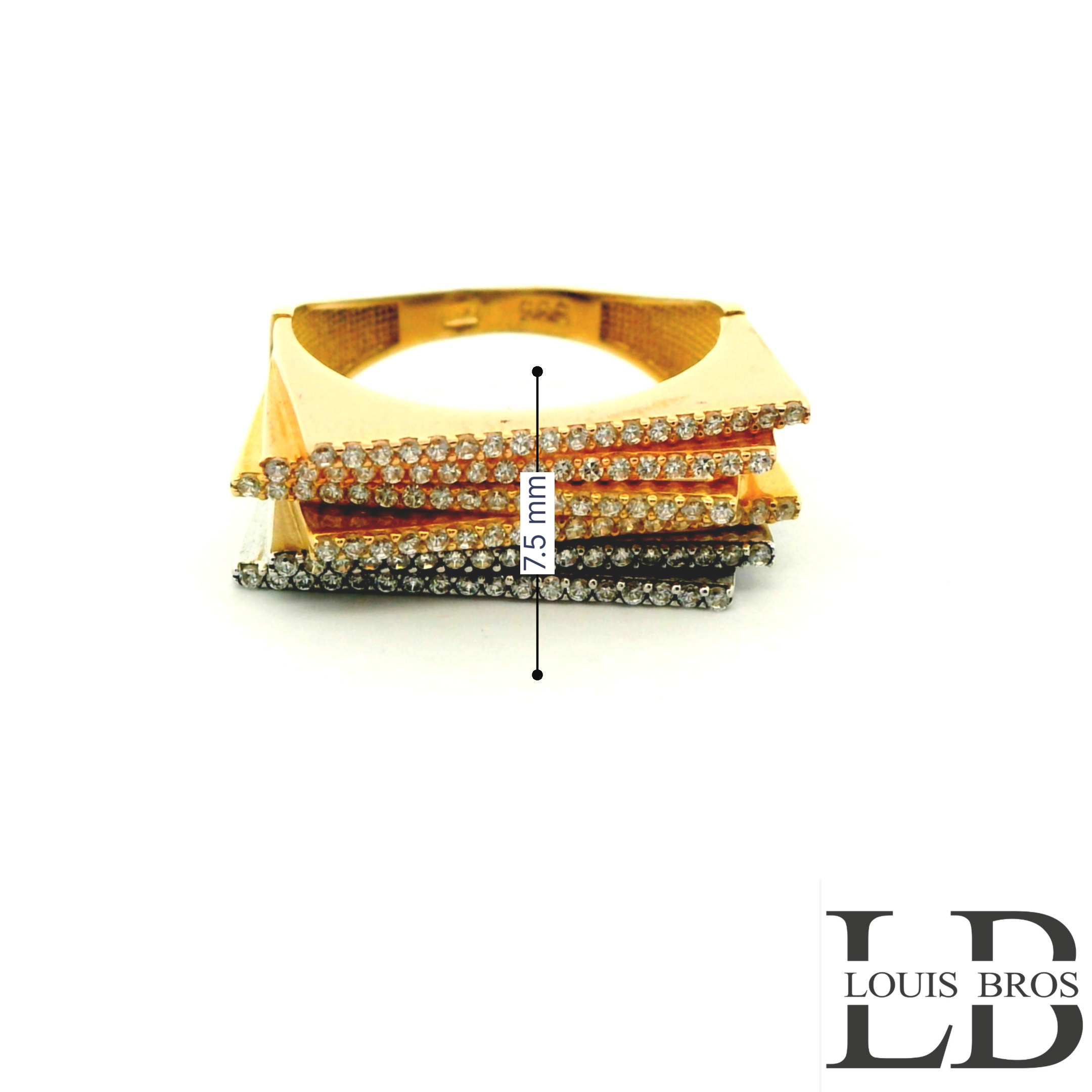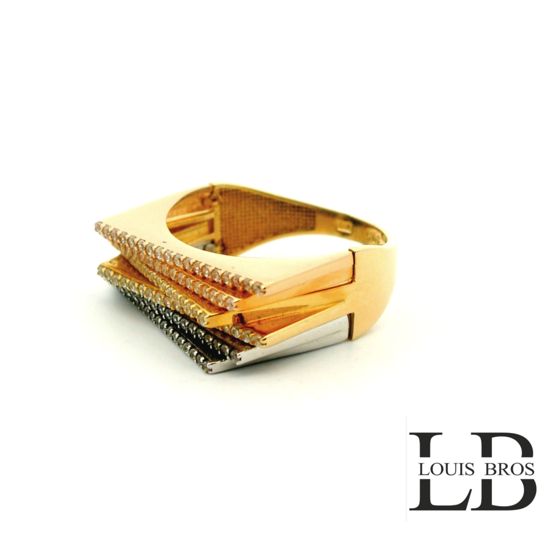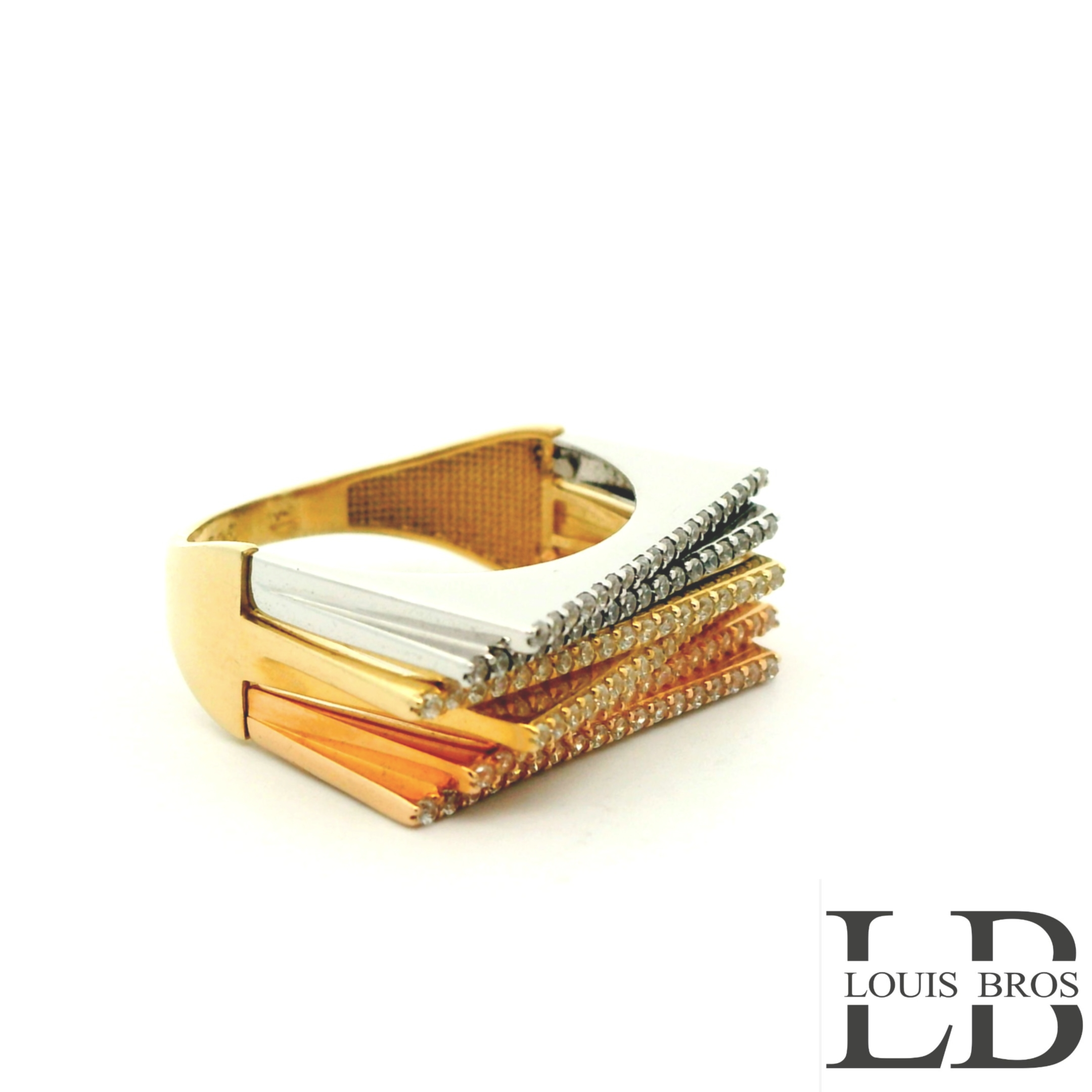 Deze schitterende ring is vervaardigd uit 14 karaat tricolor goud (5.38 gr), waarbij geel-, wit- en rosegoud op elegante wijze samenkomen. Het speelse kleurenspel geeft de ring een unieke en luxe uitstraling. De ring is verder verrijkt met fonkelende zirkonia’s, die zorgen voor een sprankelende schittering bij iedere beweging.
