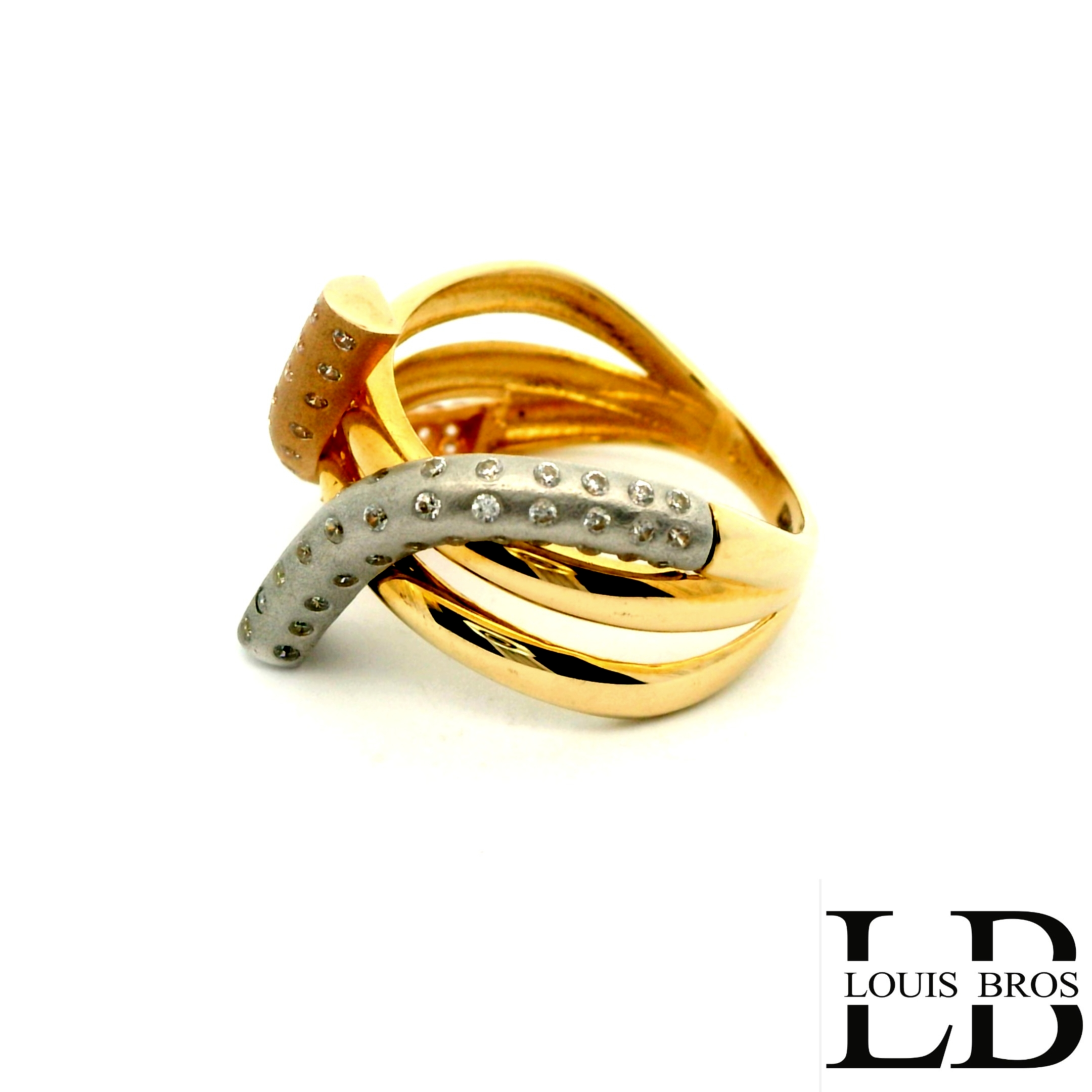 Deze schitterende ring is vervaardigd uit 14 karaat tricolor goud (4.62 gr), waarbij geel-, wit- en rosegoud op elegante wijze samenkomen. Het speelse kleurenspel geeft de ring een unieke en luxe uitstraling. De ring is verder verrijkt met fonkelende zirkonia’s, die zorgen voor een sprankelende schittering bij iedere beweging.
